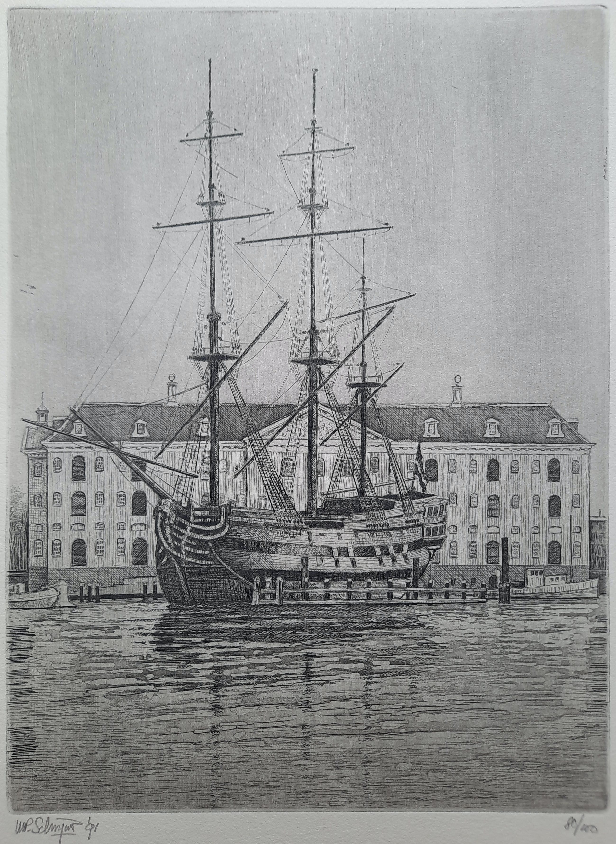 VOC-schip ‘Amsterdam’, een replica van een Oost-Indiëvaarder ligt sinds 1991 aan de steiger van Het Scheepvaartmuseum in Amsterdam. Maat etsplaat: 24 x 18 cm Papier: 38 x 27 cm. Oplagenummer kan verschillen als dat van de foto.