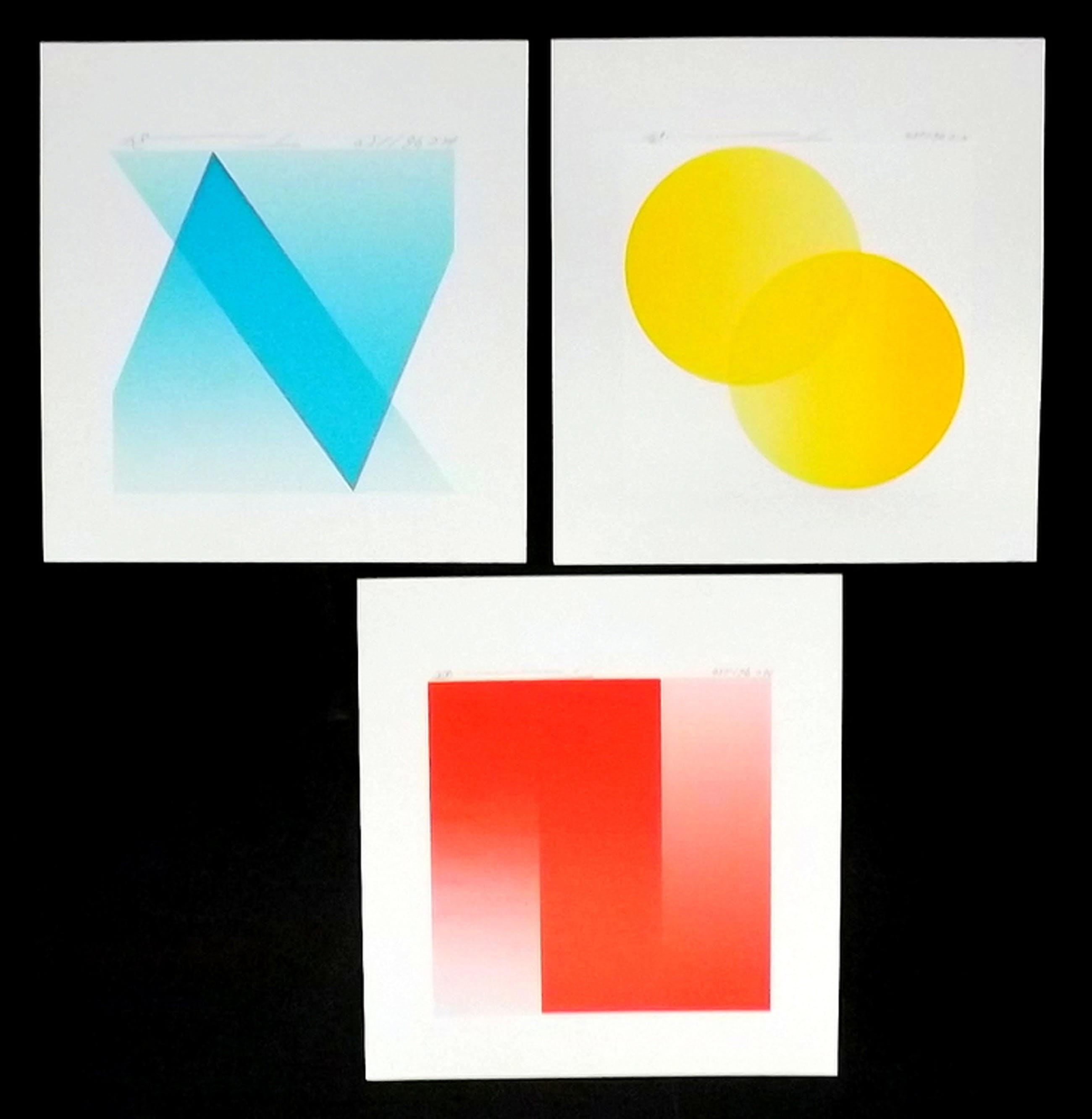 De 3 composities zijn afgedrukt in heldere kleuren op glad karton-achtig papier - met potlood gesigneerd en genummerd (zie foto's)