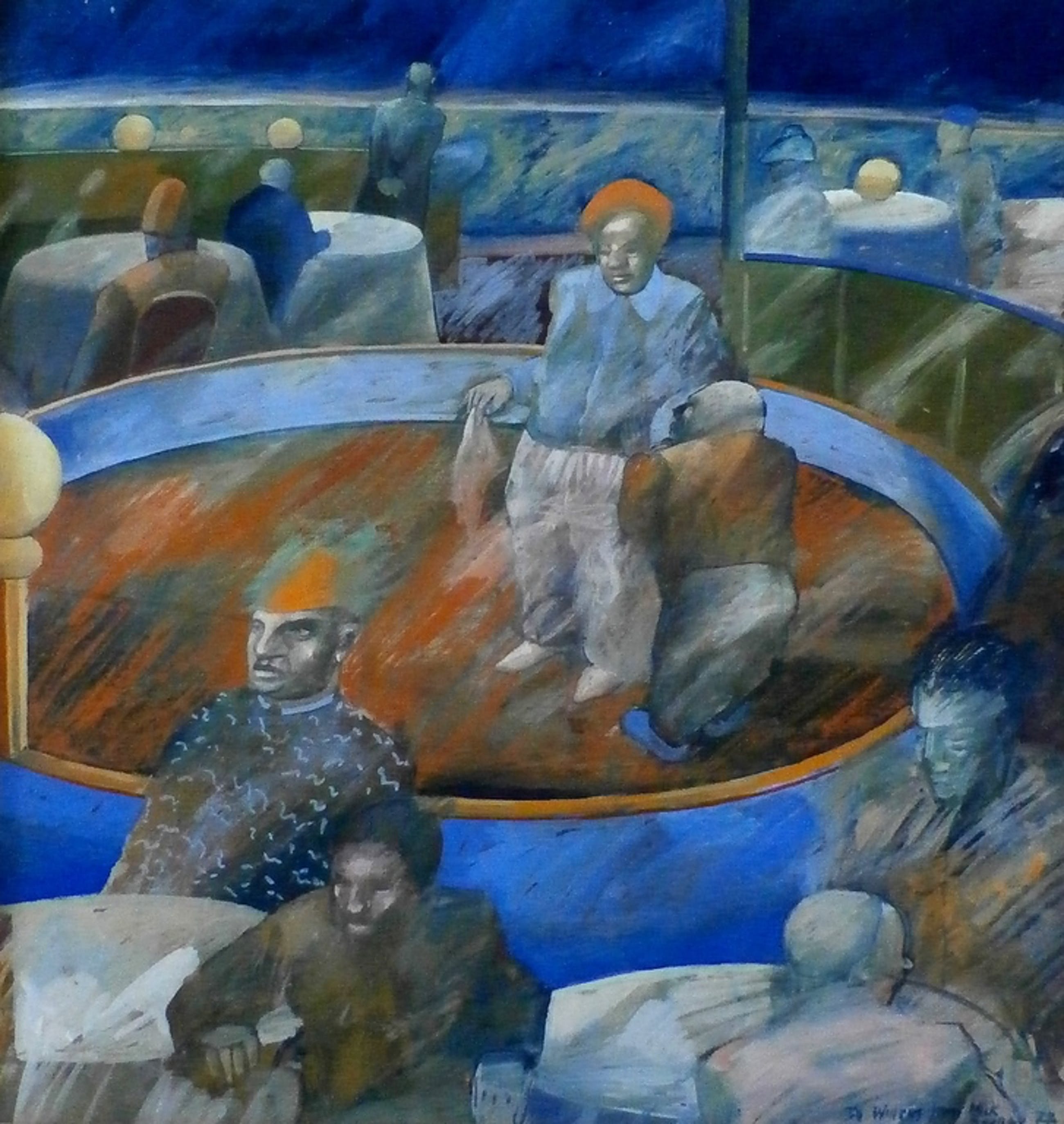 Gouache van de bekende Engelse kunstenaar Mick Rooney. Titel: 2 clowns in circuspiste. Jaar: 1977. Opdracht: to Willem from Mick Rooney. Afmetingen voorstelling: H34 x b32 cm. Conditie: in goede staat. Een certificaat van echtheid wordt meegeleverd.