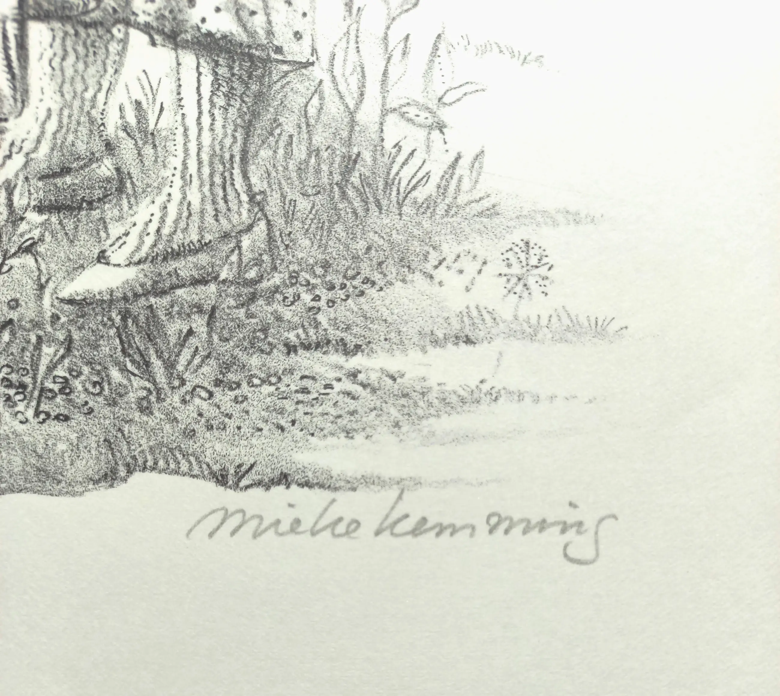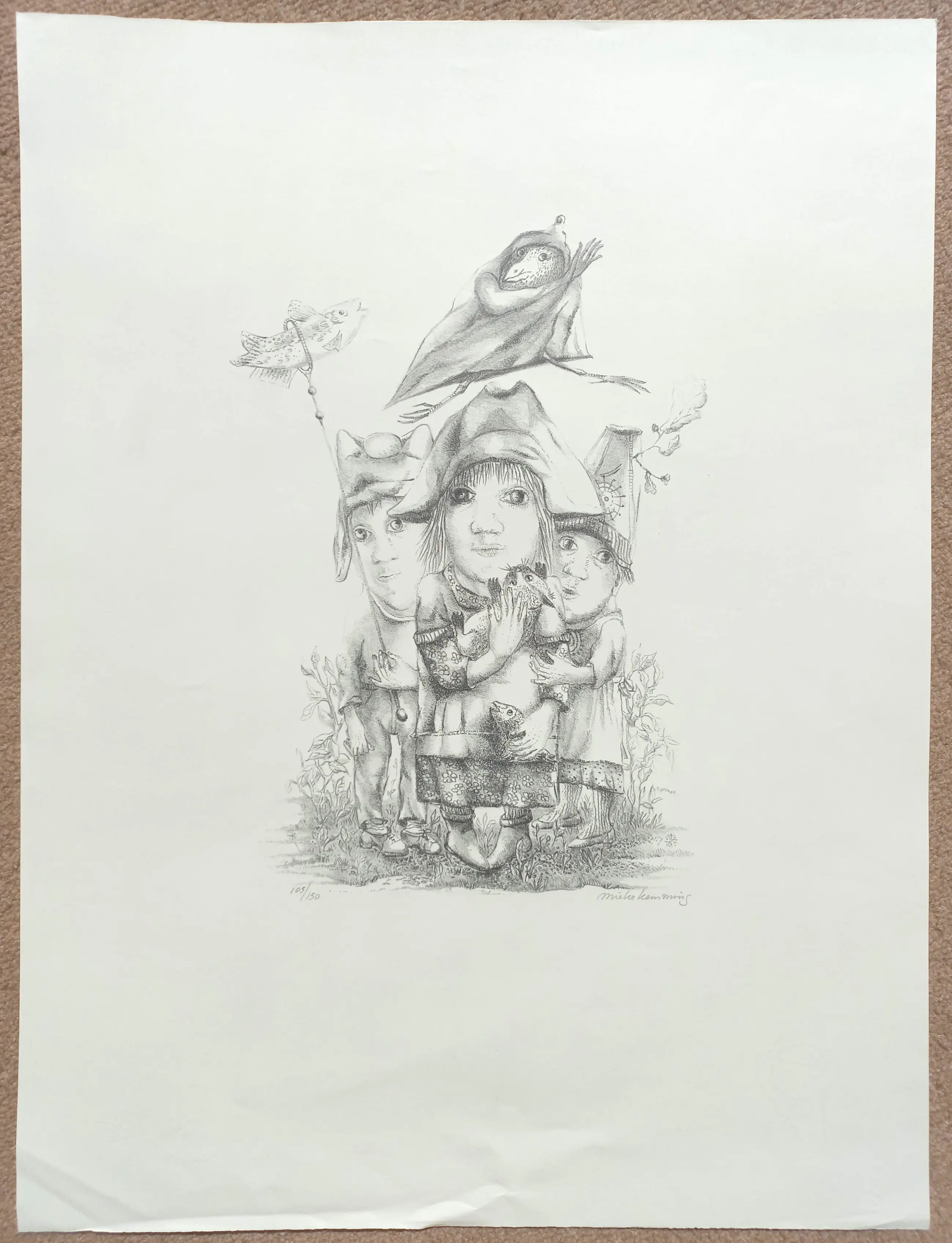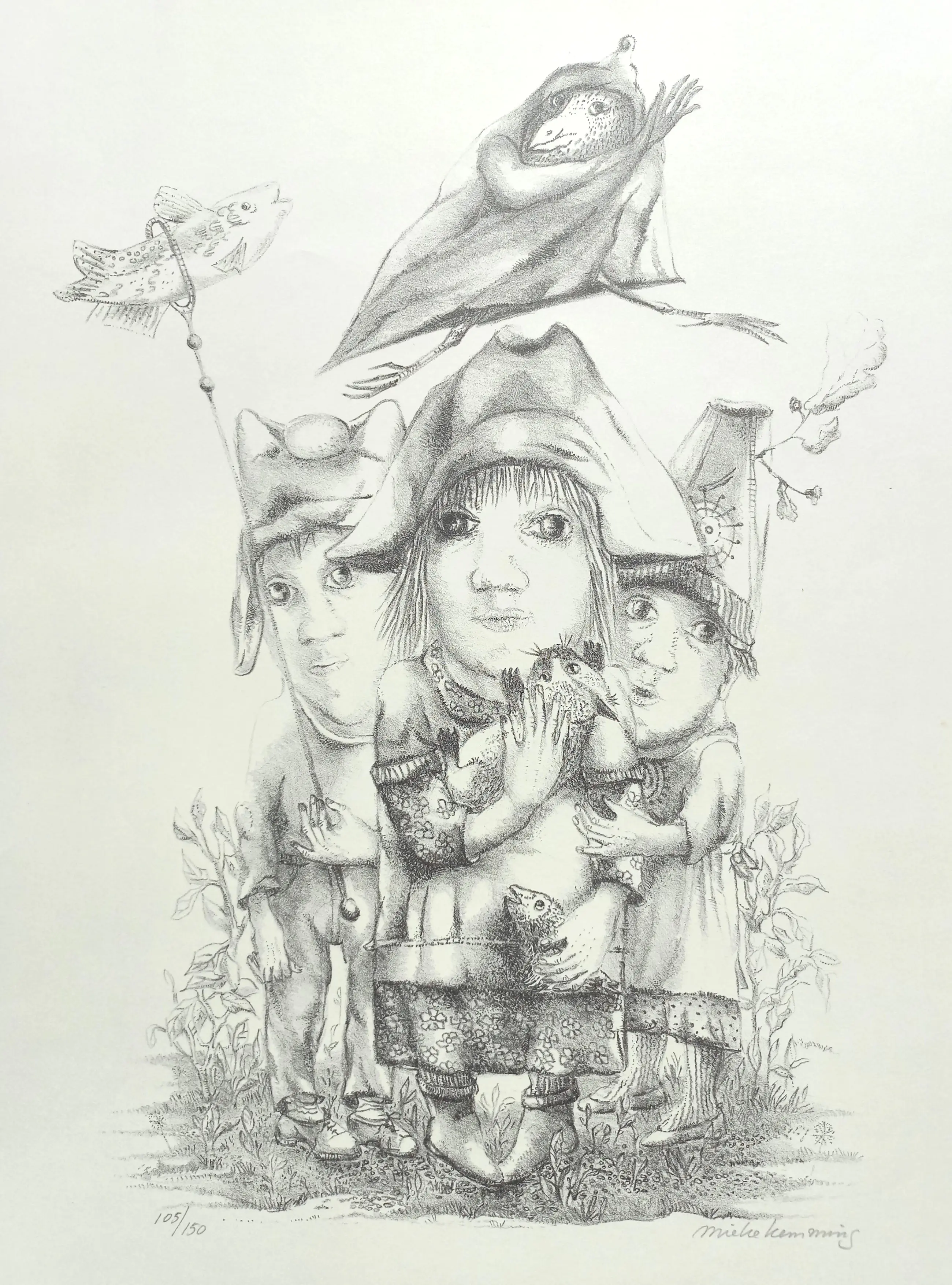 Karakteristiek werk van Mieke Kemming. Litho op papier, met potlood gesigneerd en genummerd (105/150). In zeer goede conditie.