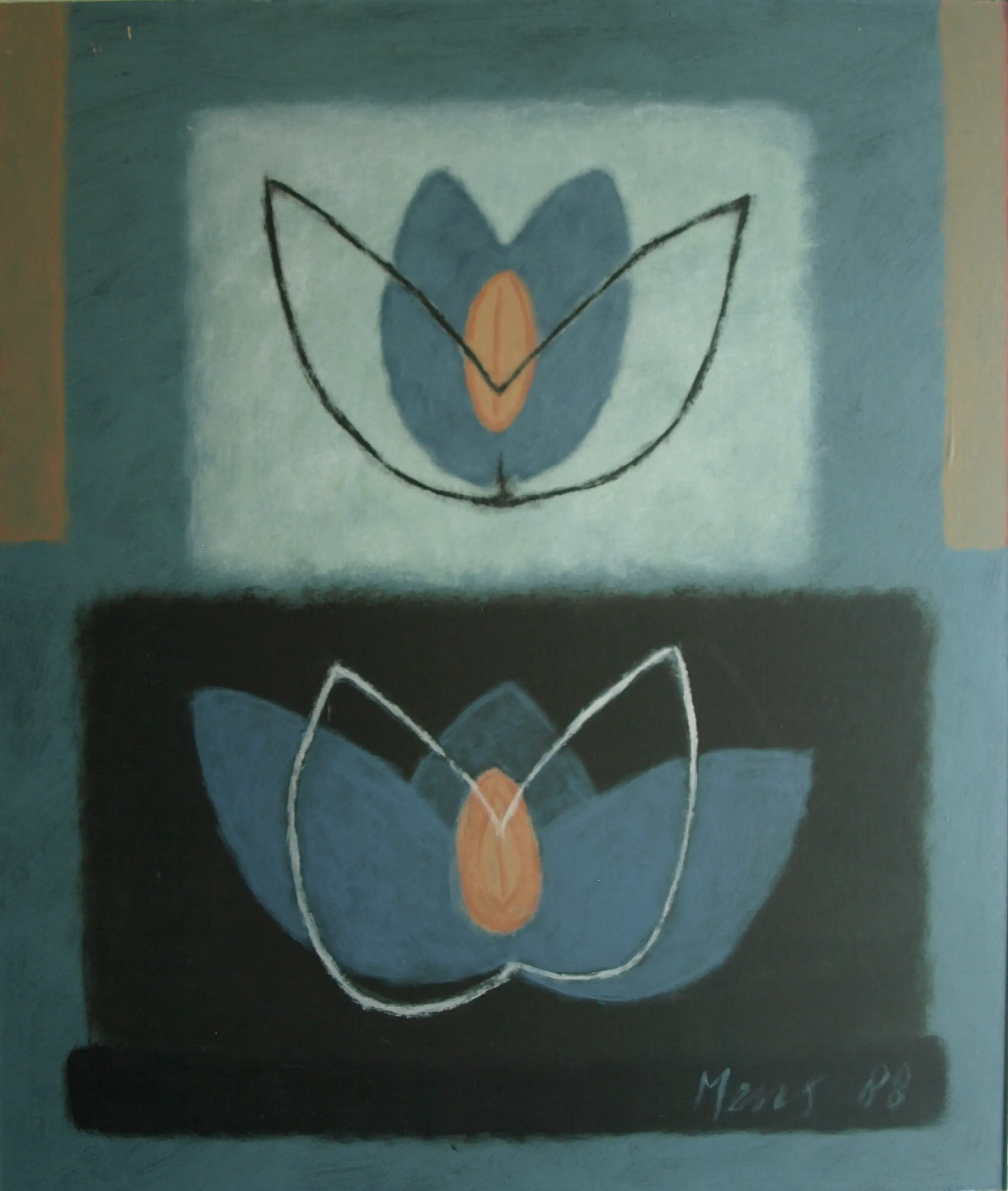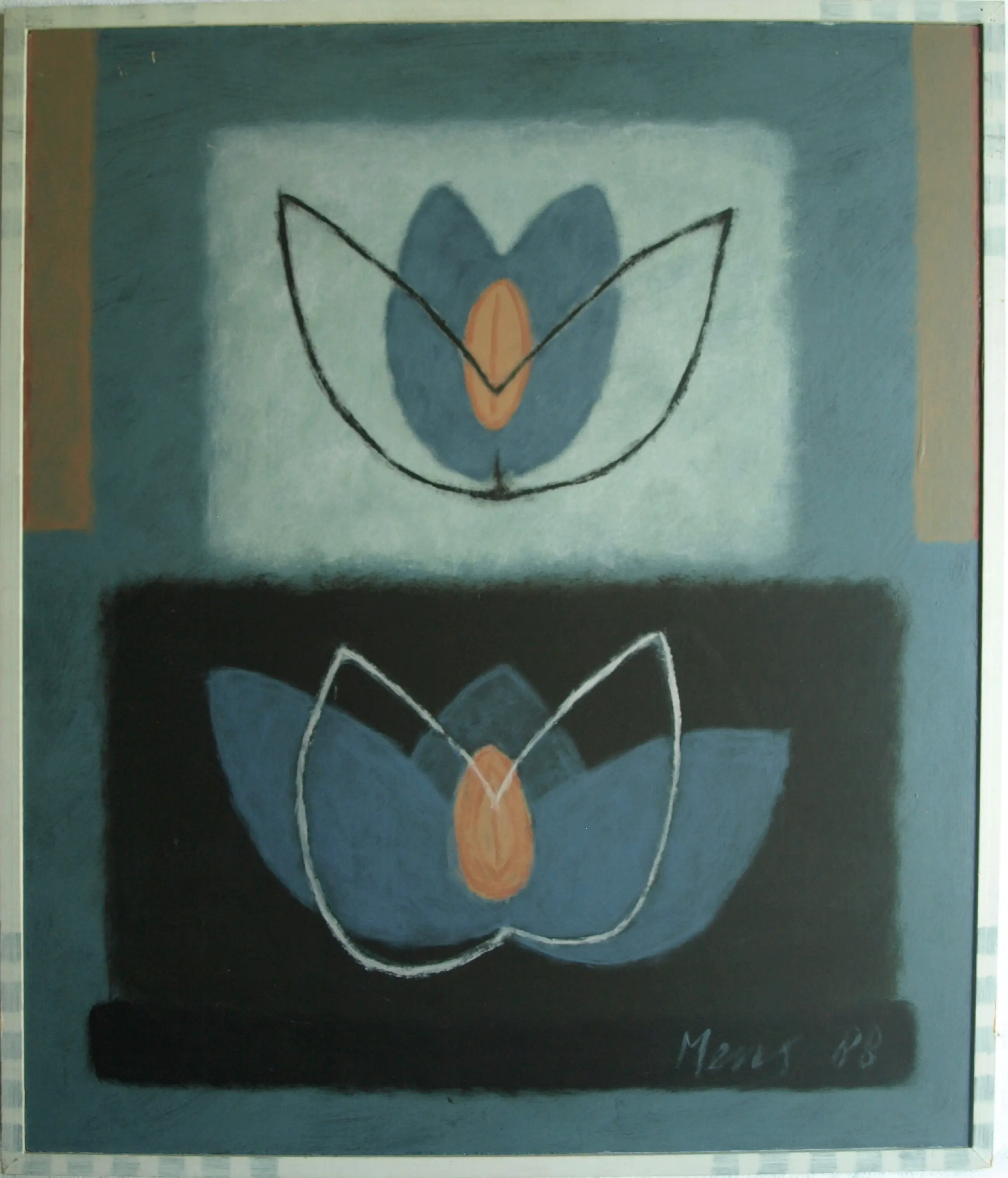 Een ingelijst schilderij van de Nederlandse kunstenares Mieke Mens. -Techniek: Pastelkrijt en acrylverf op board en ingelijst in een door de kunstenares beschilderde houten lijst. -Gesigneerd rechtsonder. -Afmetingen: Lijst, 75 x 64 x 1 cm. Beeld, 72 x 61 cm. -Herkomst: ‘Artoteek Oost Amsterdam’. -Conditie: In goede staat met 2 krasjes linksboven. Zie ook alle foto’s voor een eigen indruk. Het werk kan zo aan de muur.