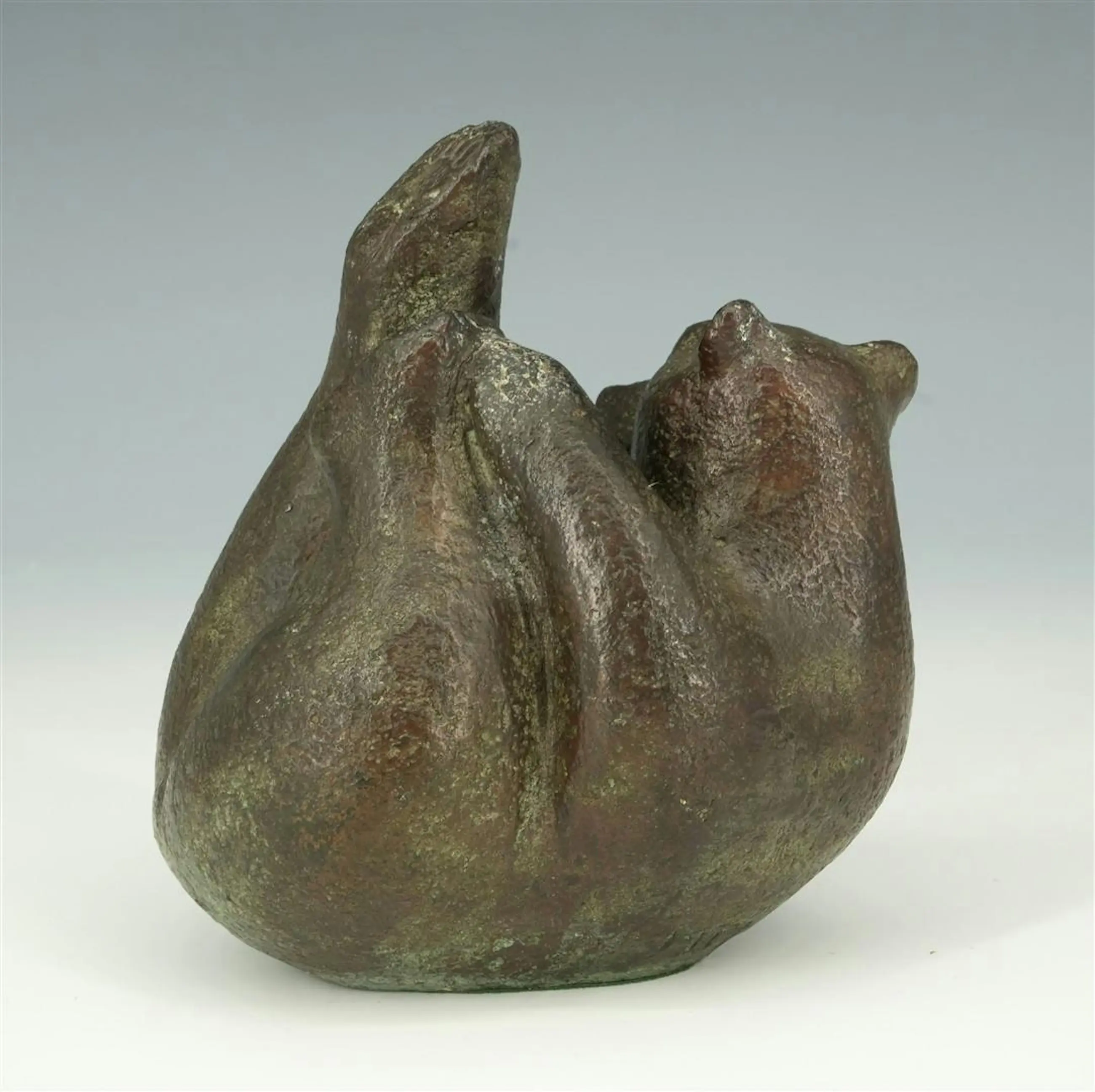 Gepatineerd bronzen beeld van Miep Maarse. Voorstelling van een liggende beer. Jaar: 1996. Afmetingen beeld: H12 x B11cm x h9.5cm.