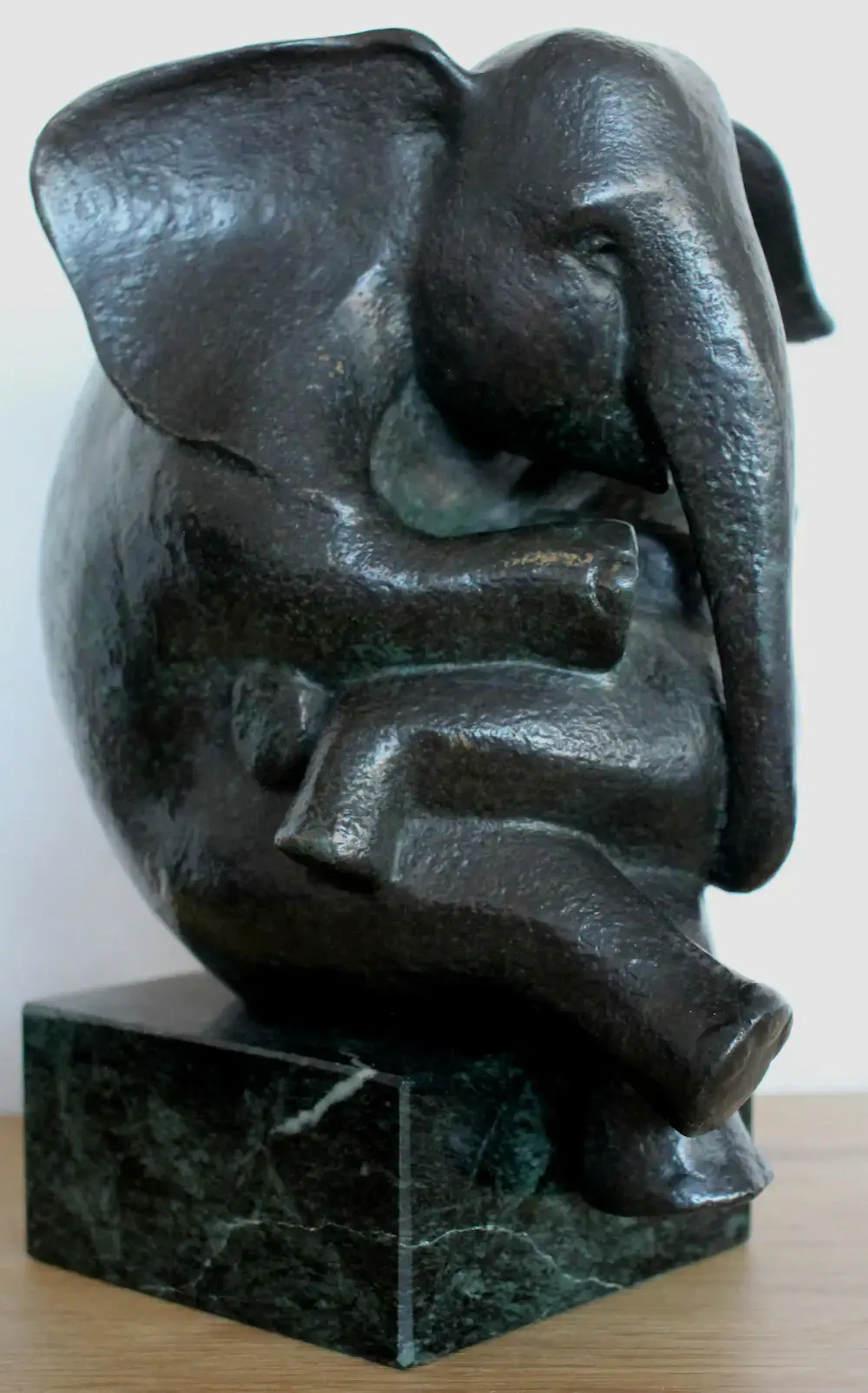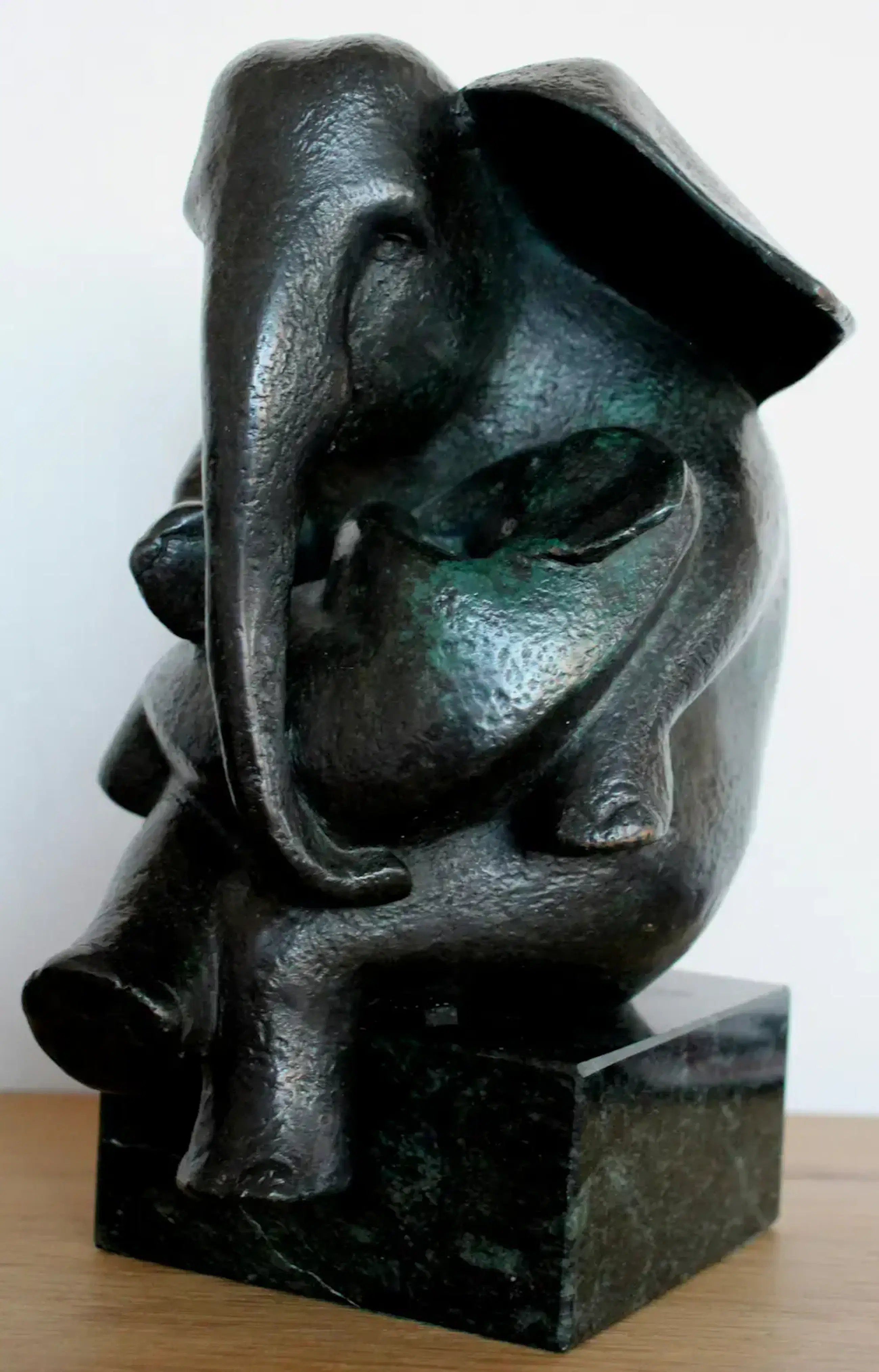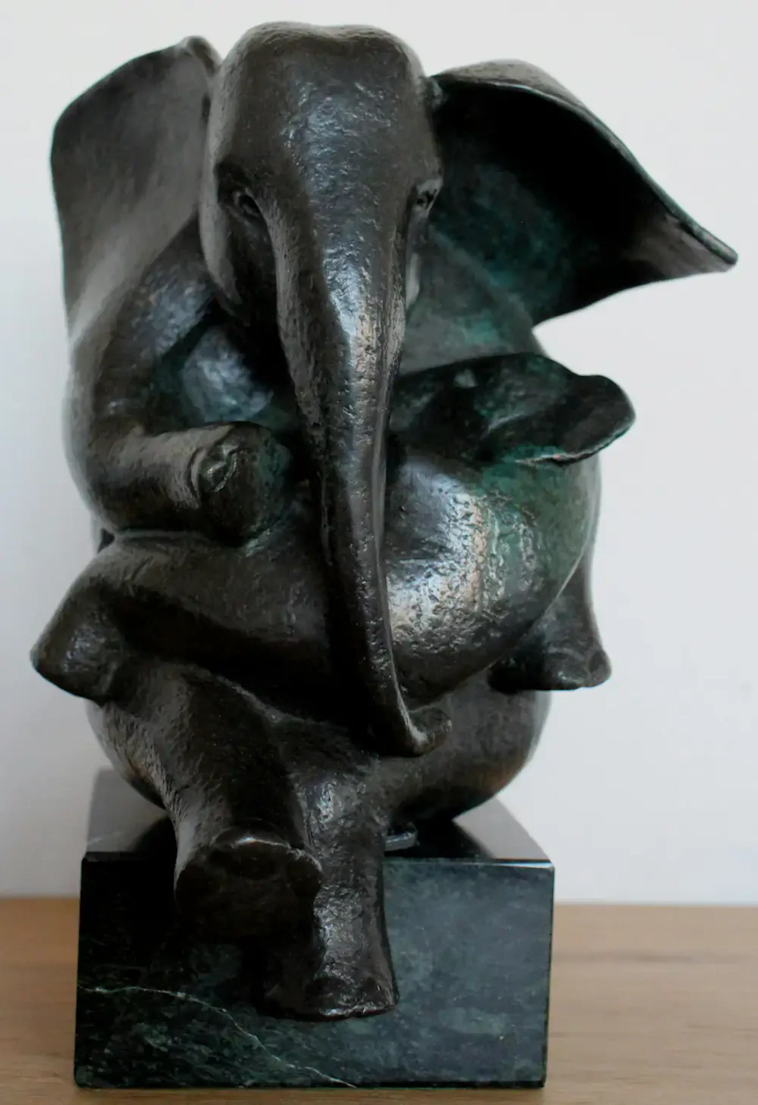 Gepatineerd bronzen sculptuur van Miep Maarse uit 2001. Titel: Parasol. Voorstelling van een antropomorfe olifant met kind(Deze schilderactiviteit kijkt naar het geven van menselijke eigenschappen aan dieren). Afmetingen beeld op sokkel: H24 x b18 x d13cm. Het beeld is gesigneeerd en gedateerd (M.M. 2001). Nummer: 5/8. De authenticiteit van het aangeboden werk wordt volledig gegarandeerd. Een certificaat van echtheid kan, op aanvraag, worden gemaild.