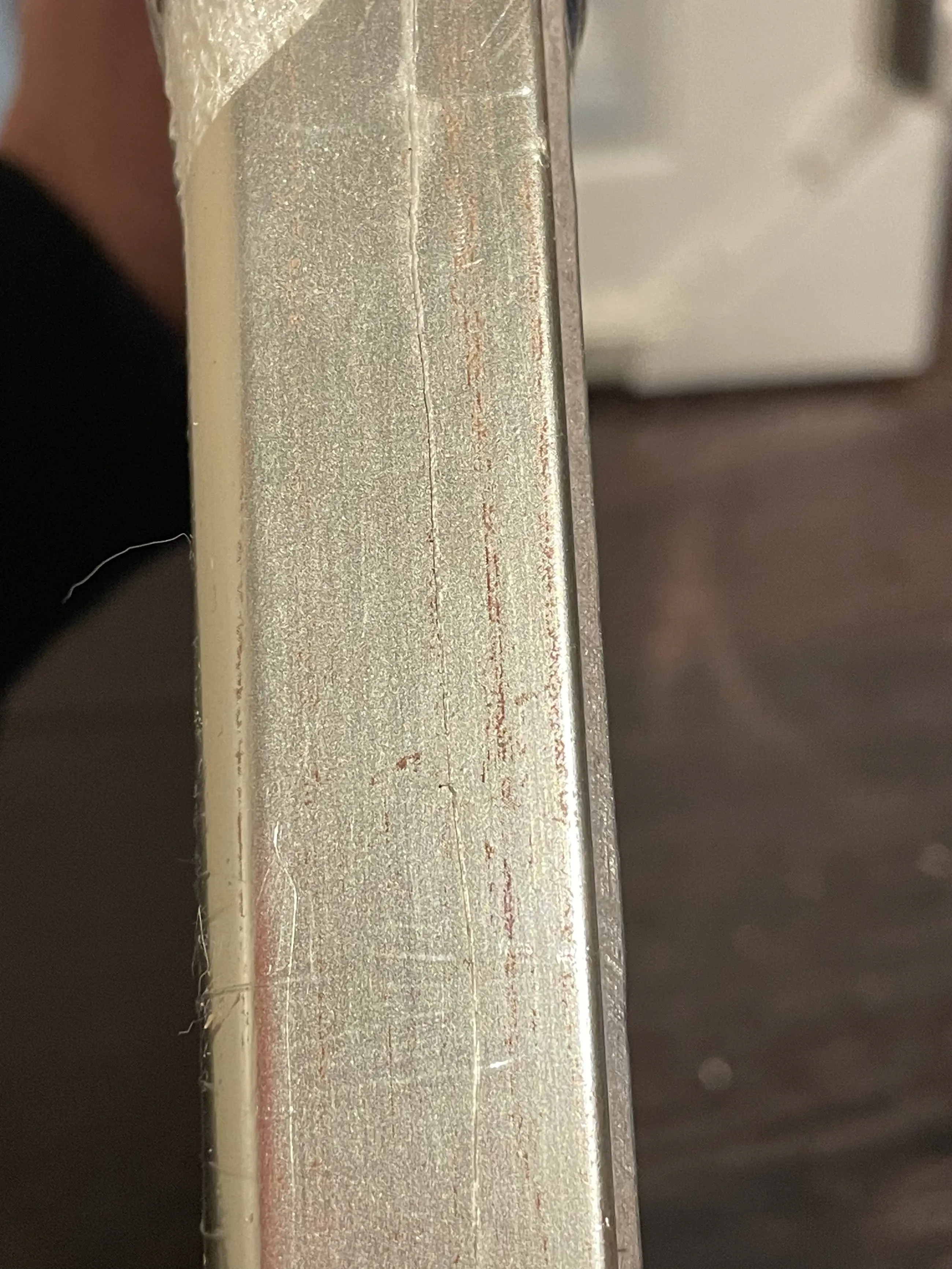 Lichte sleepsporen op de lijst. Niet hinderlijk bevinden zich onder het plastic.