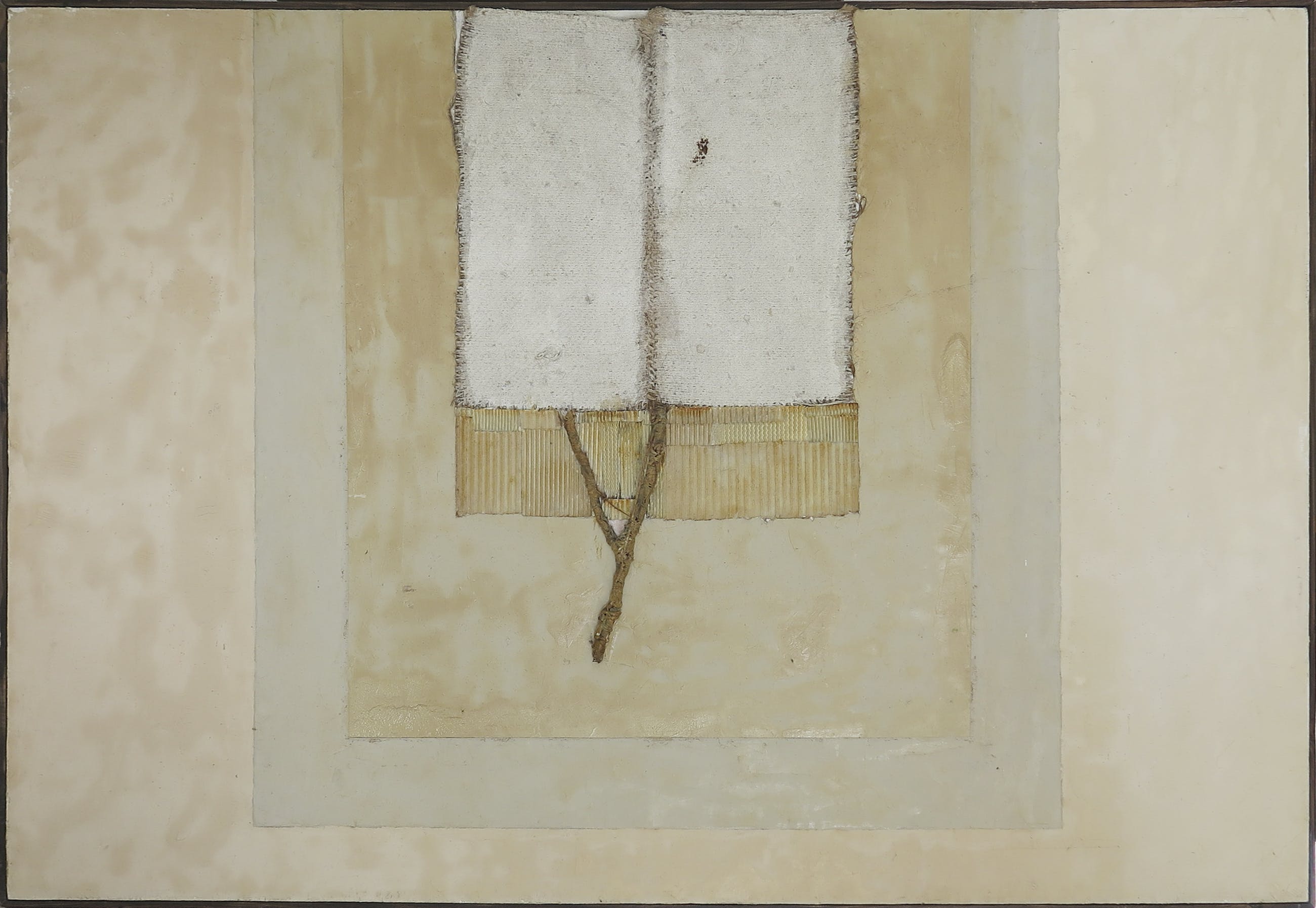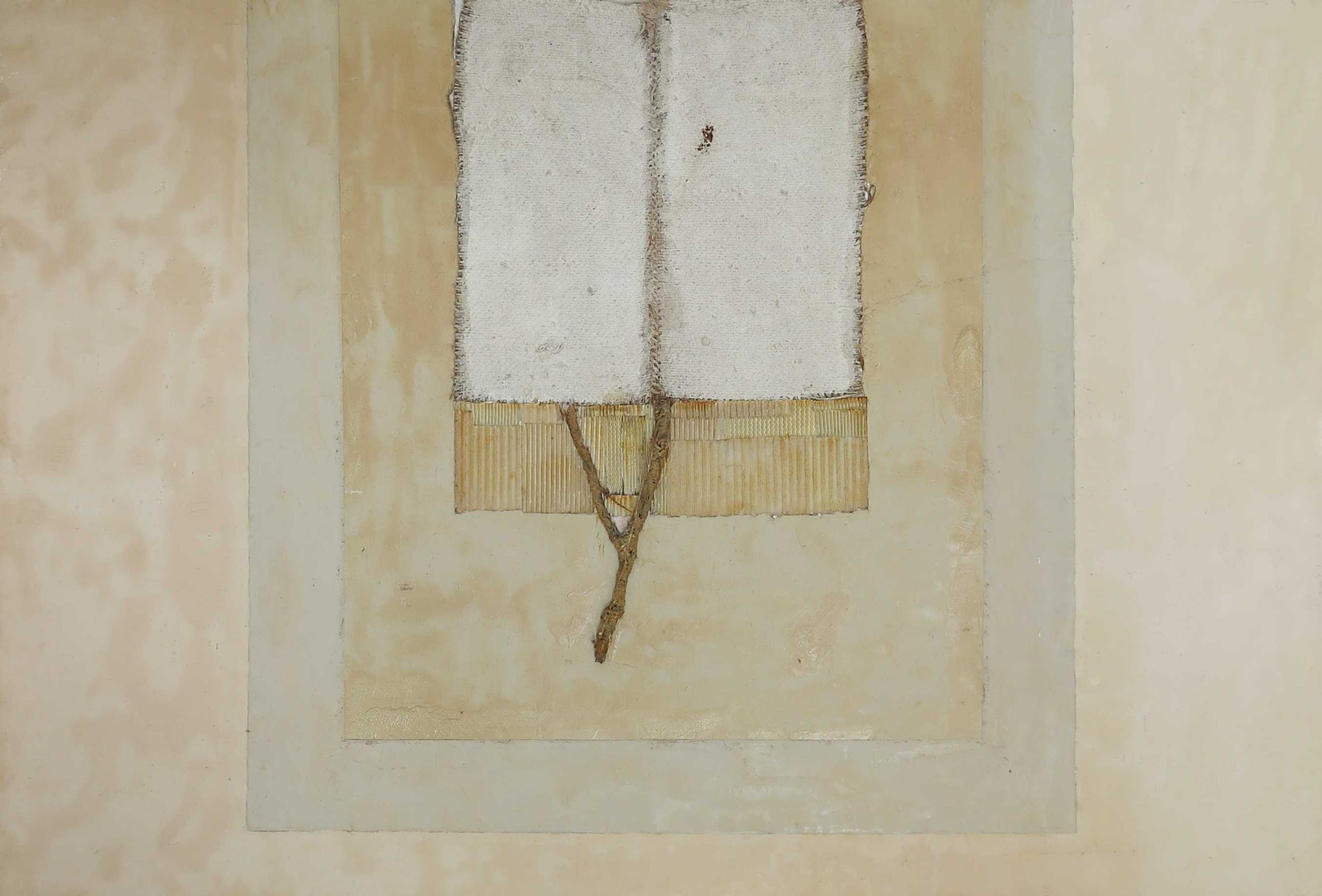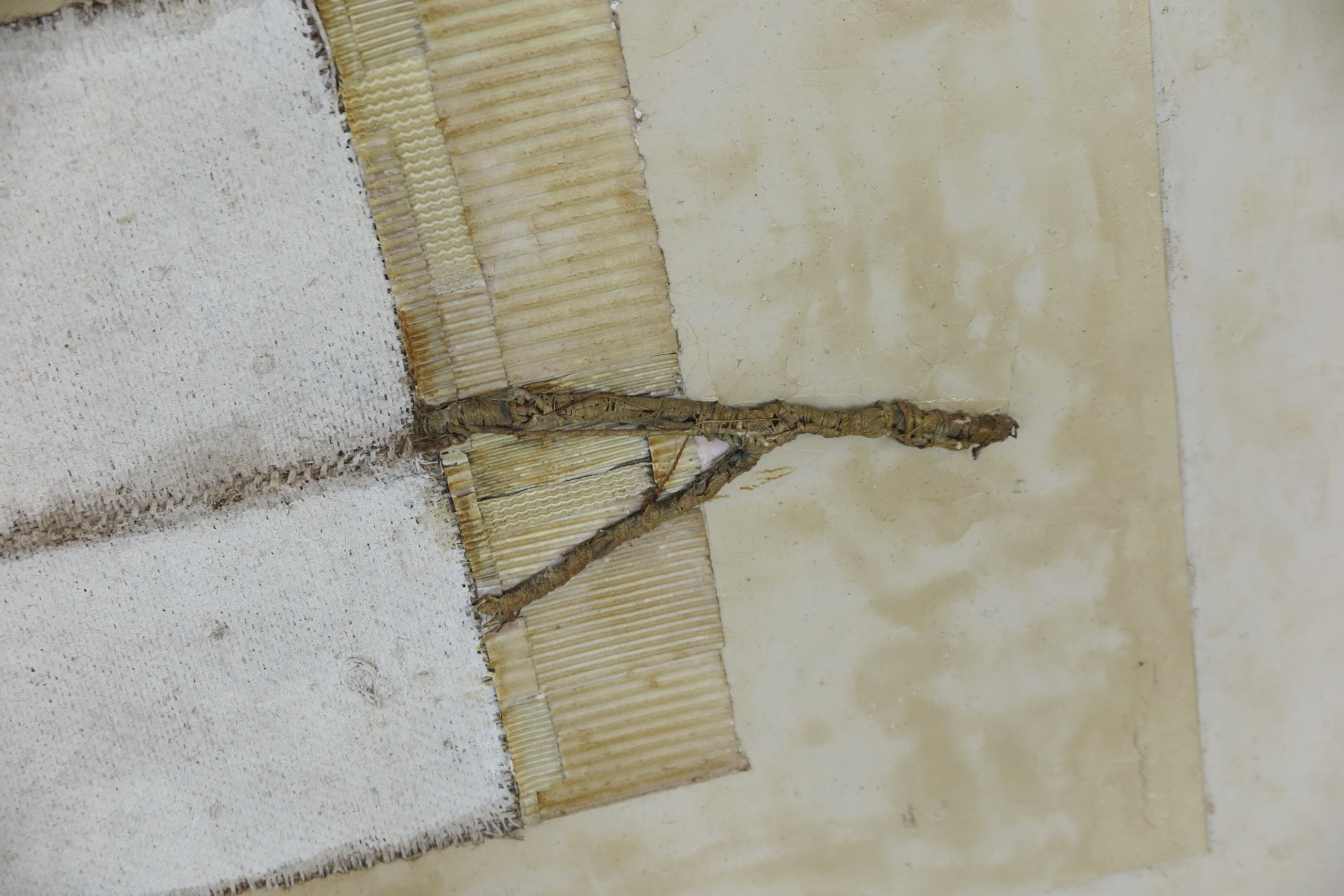 Gemengde techniek (olieverf, assemblage van jute en hout) op doek.