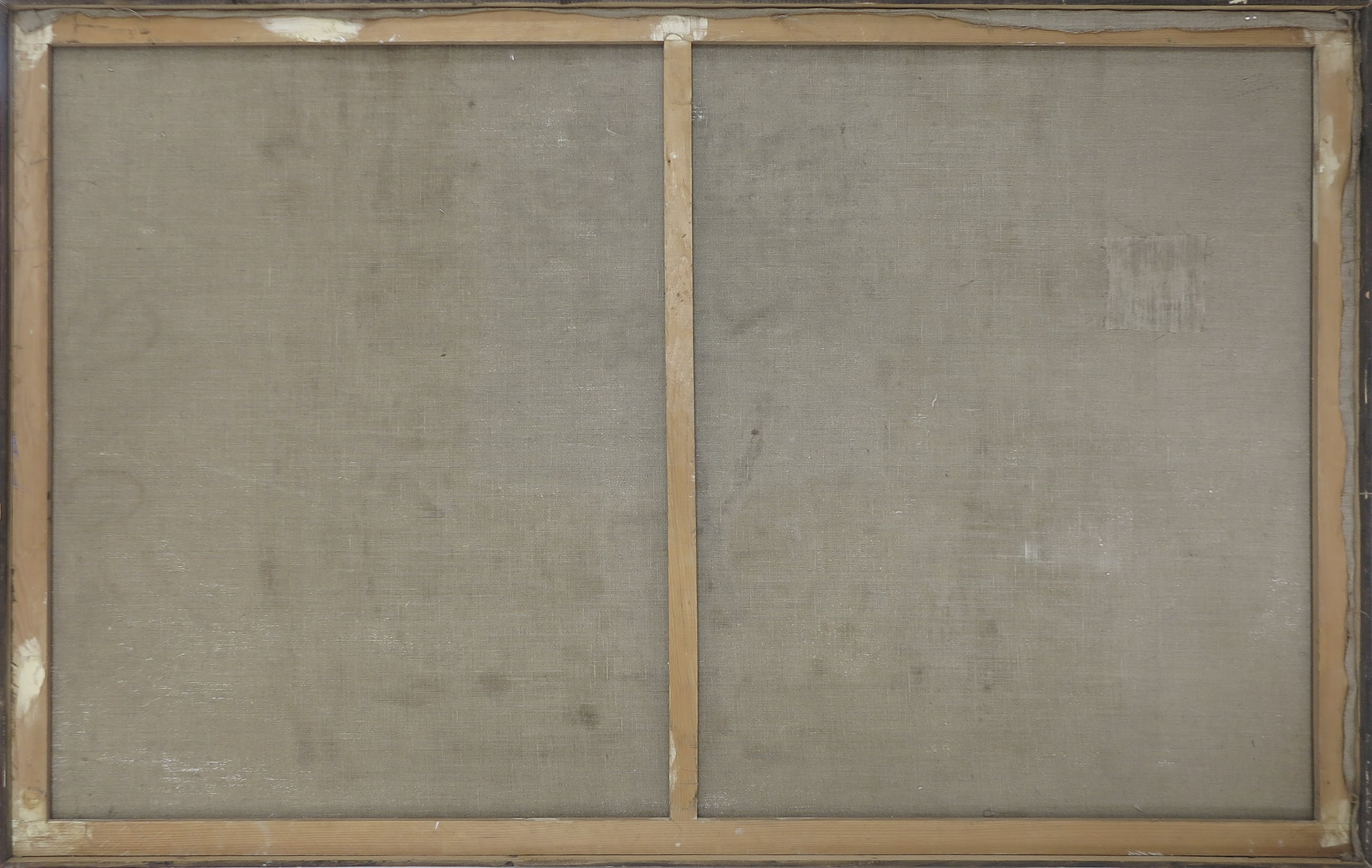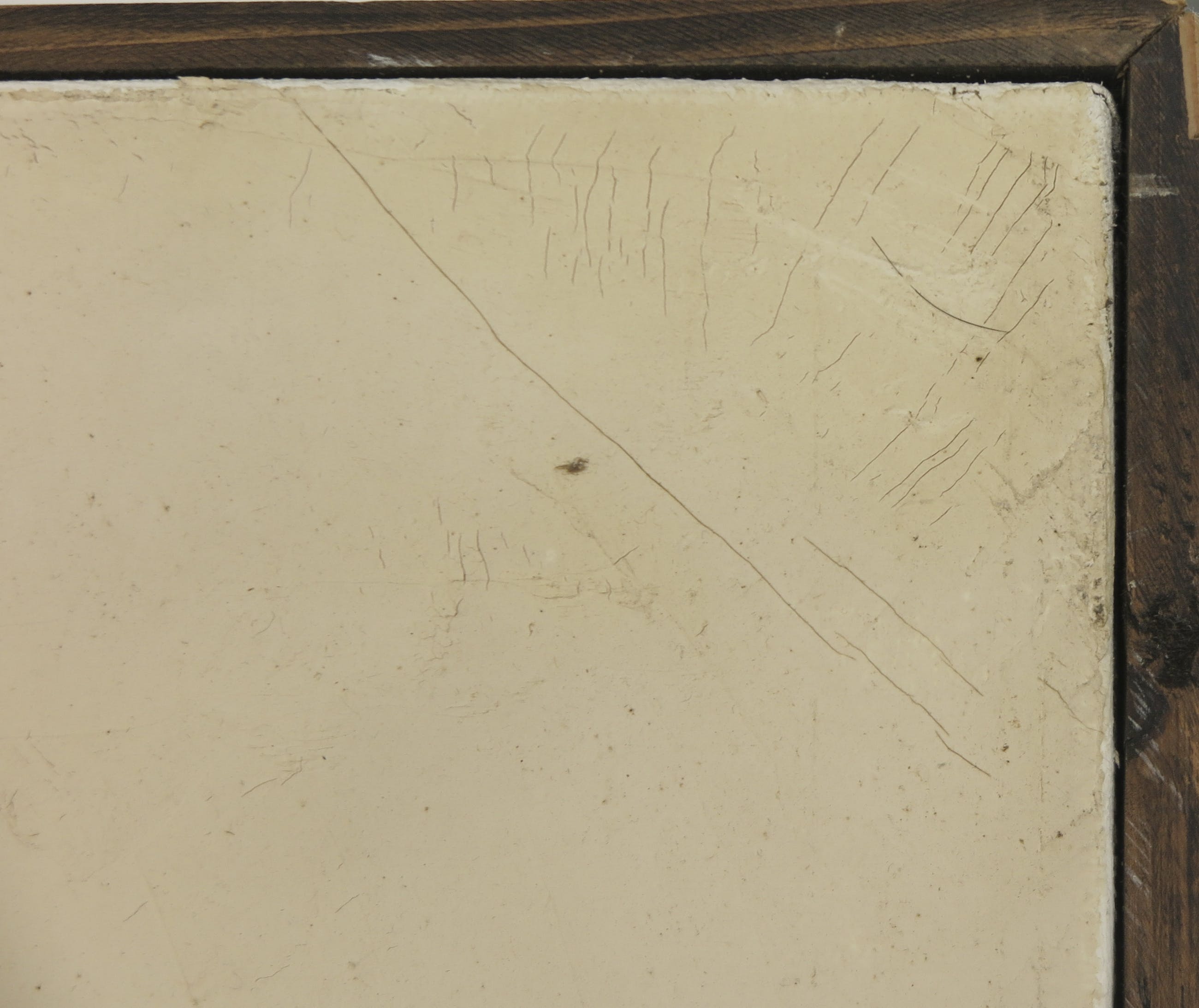 | Over het gehele oppervlak kleine vlekjes en wat oppervlaktevuil. Zie ook foto's. Op een paar plekken wat barstjes/scheurtjes in verflaag. Het werk is in het verleden gerestaureerd (zie 'patch' op achterzijde) | |