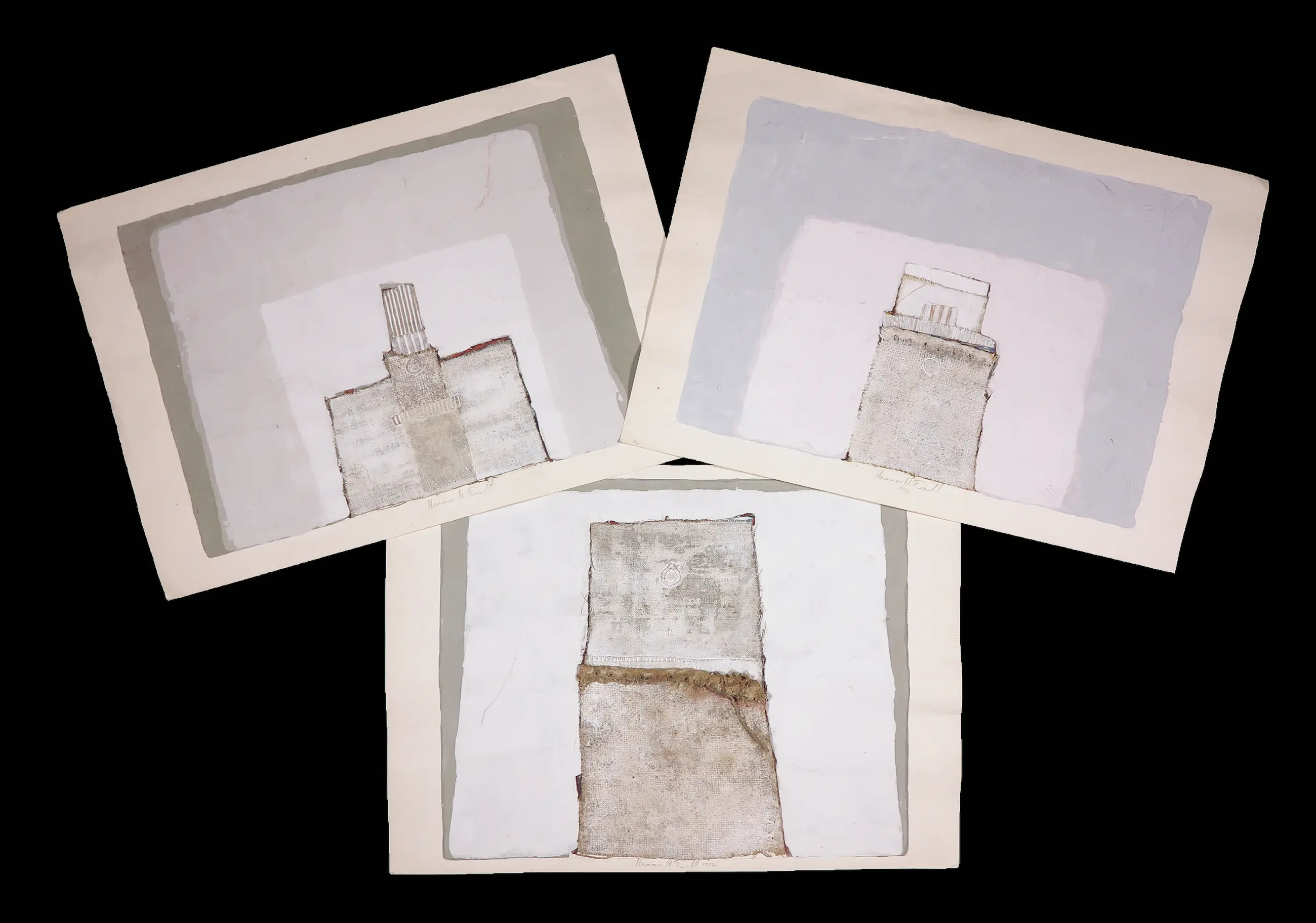 Drie werken van Servische kunstenaar Mihajlo Petkovic. Petkovic heeft bij deze werken gebruik gemaakt van meerdere (gewoven) materialen waardoor ze aanzienlijk reliëf hebben (zie foto). Hangesigneerd door de kunstenaar.