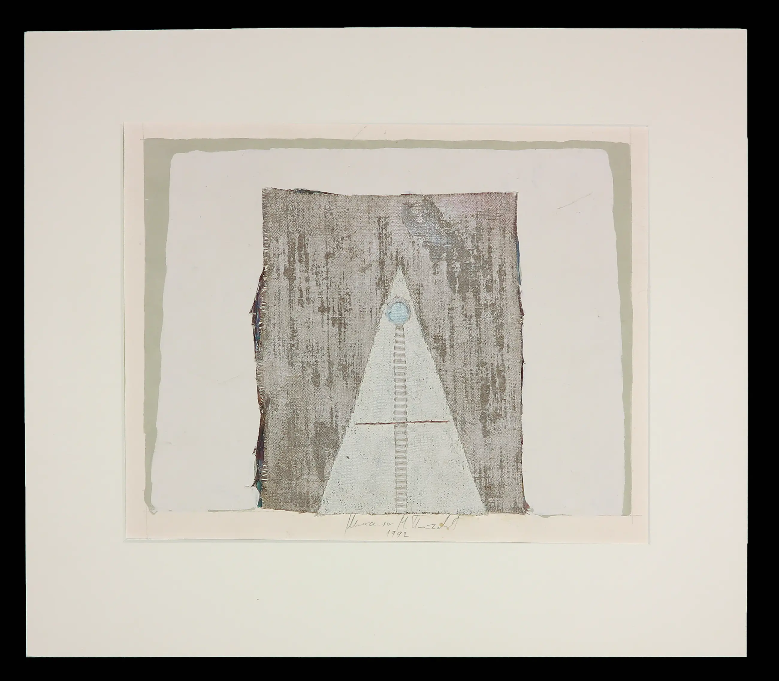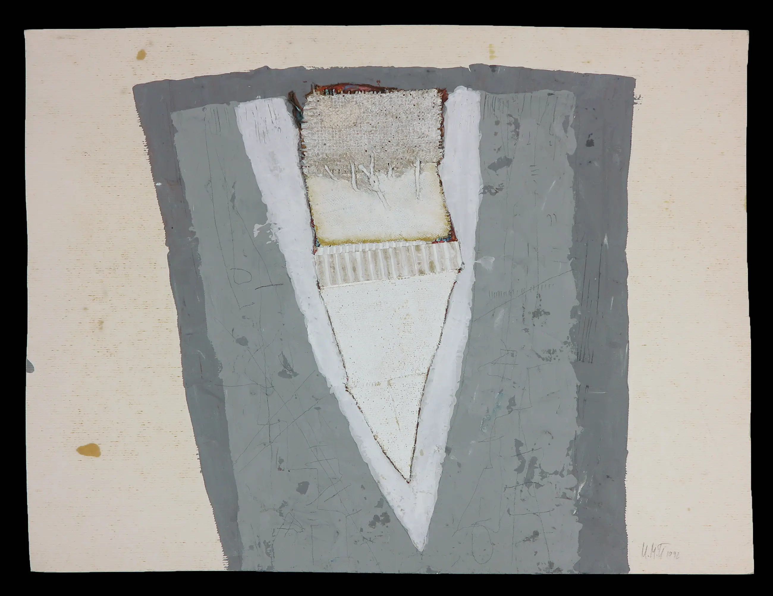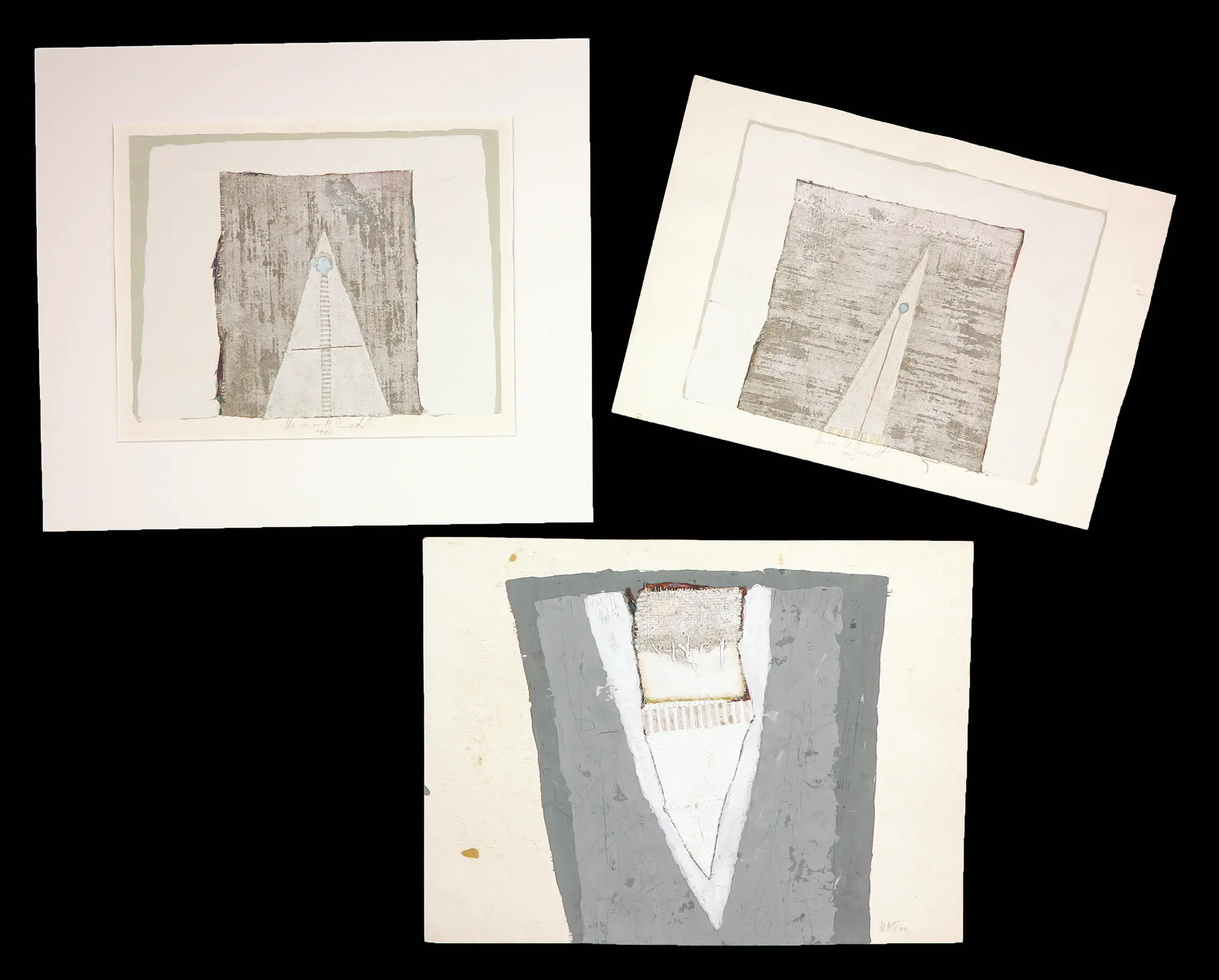 Drie werken van Servische kunstenaar Mihajlo Petkovic. Petkovic heeft bij deze werken gebruik gemaakt van meerdere gewoven materialen en karton waardoor ze reliëf hebben (zie foto). Hangesigneerd door de kunstenaar.