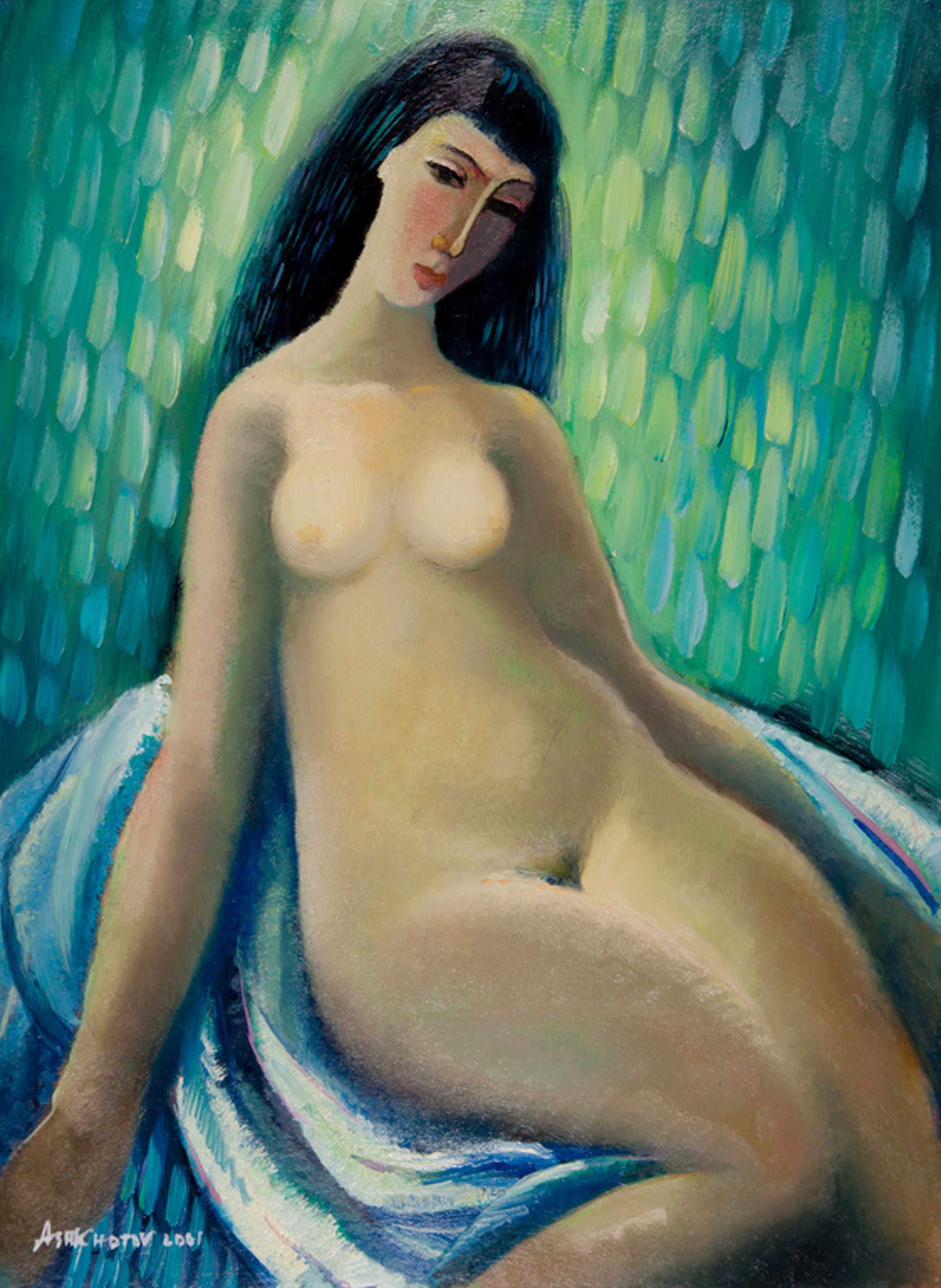 Olieverf op zwaar papier, 42 x 31 cm, gesigneerd linksonder met Askhotov 2000, goede staat.