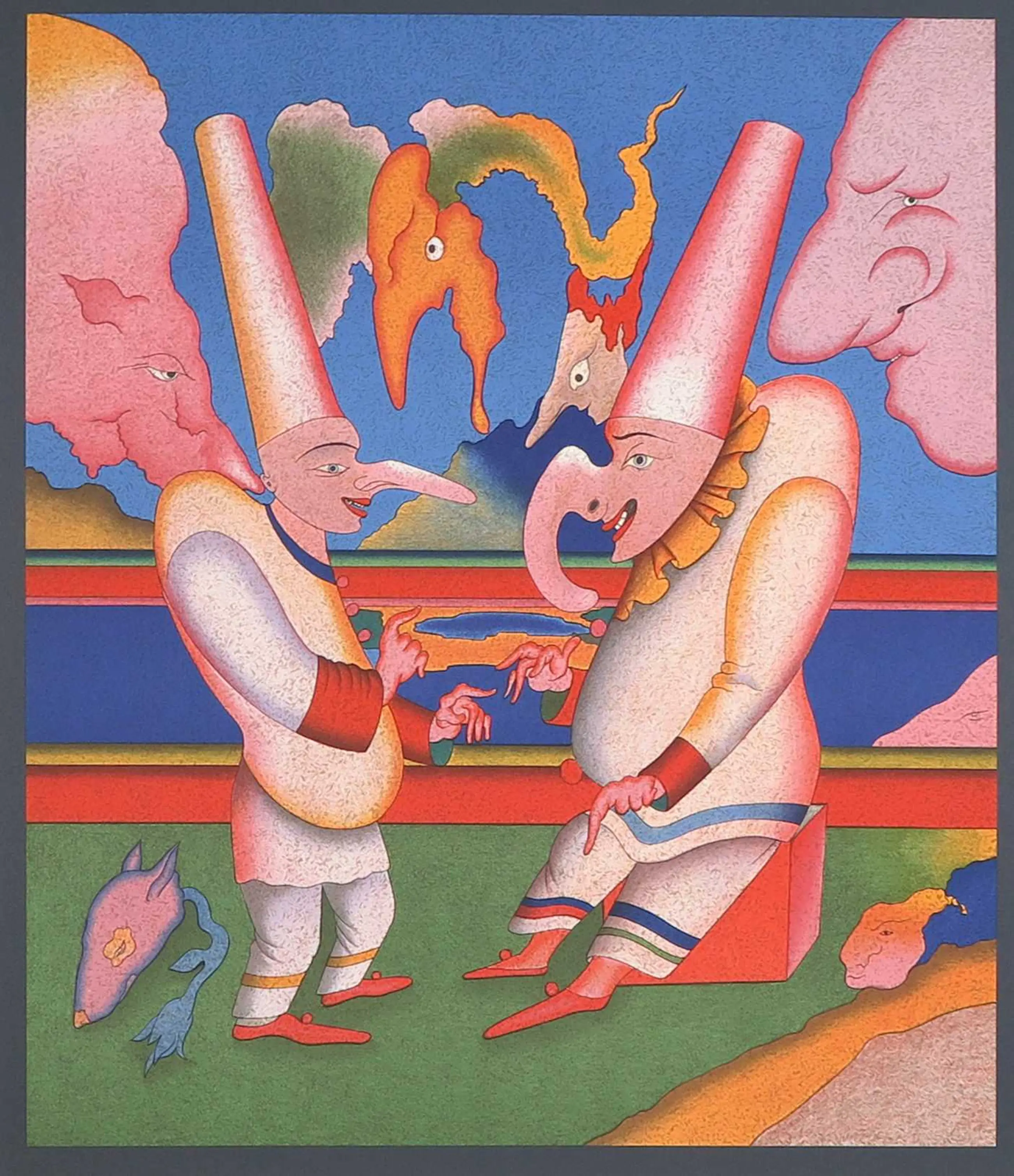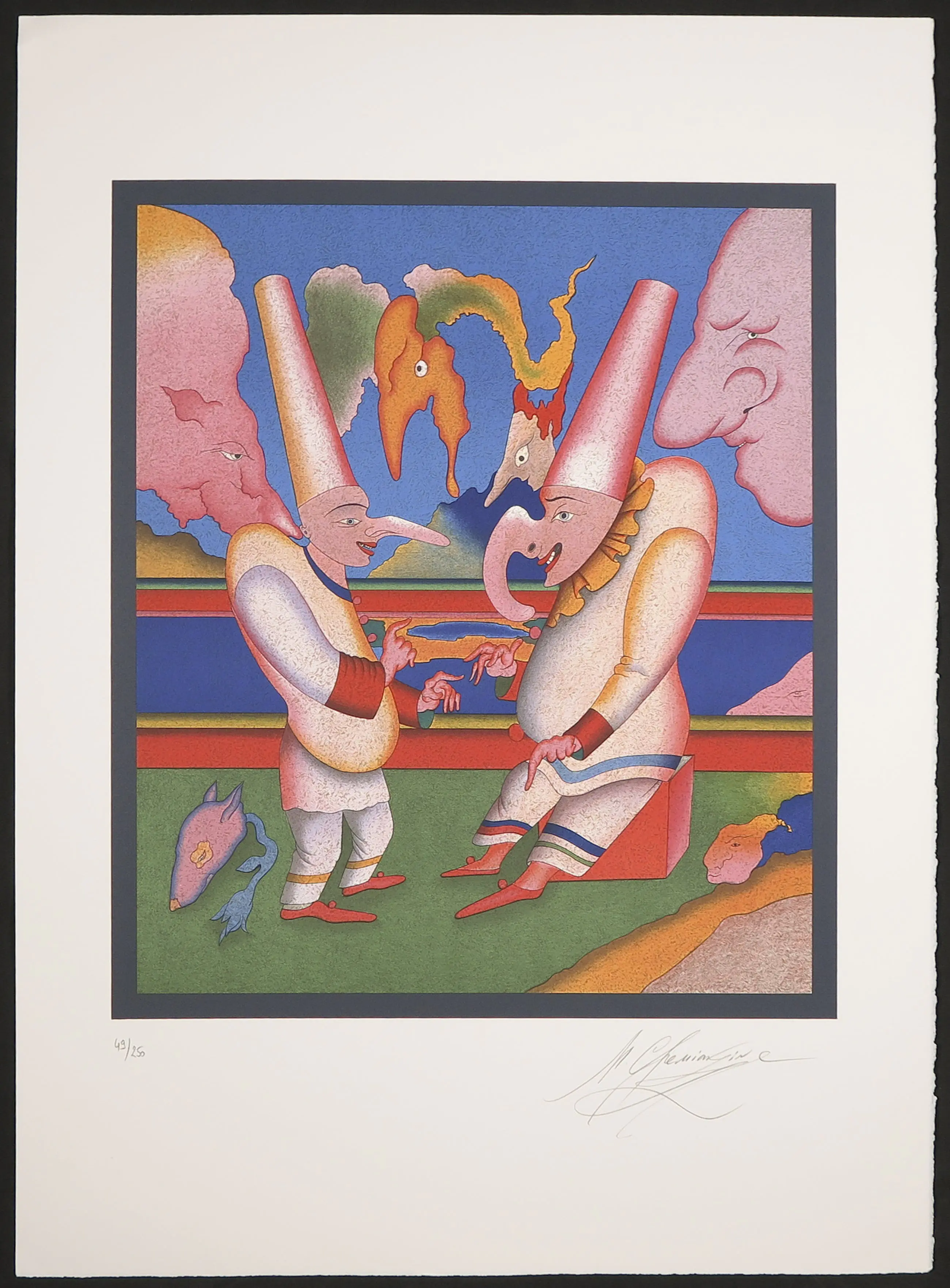 Mihail Mikhailovich Chemiakin (geboren op 4 mei 1943) is een Russische schilder, decorontwerper, beeldhouwer en een controversiële vertegenwoordiger van de non-conformistische kunsttraditie van Sint-Petersburg. De schitterend gekleurde compositie is 50 cm hoog en 44 cm breed. Verzending uitsluitend binnen EU en geschiedt goed opgerold en verpakt in een kartonnen koker. Ophalen geniet de voorkeur.