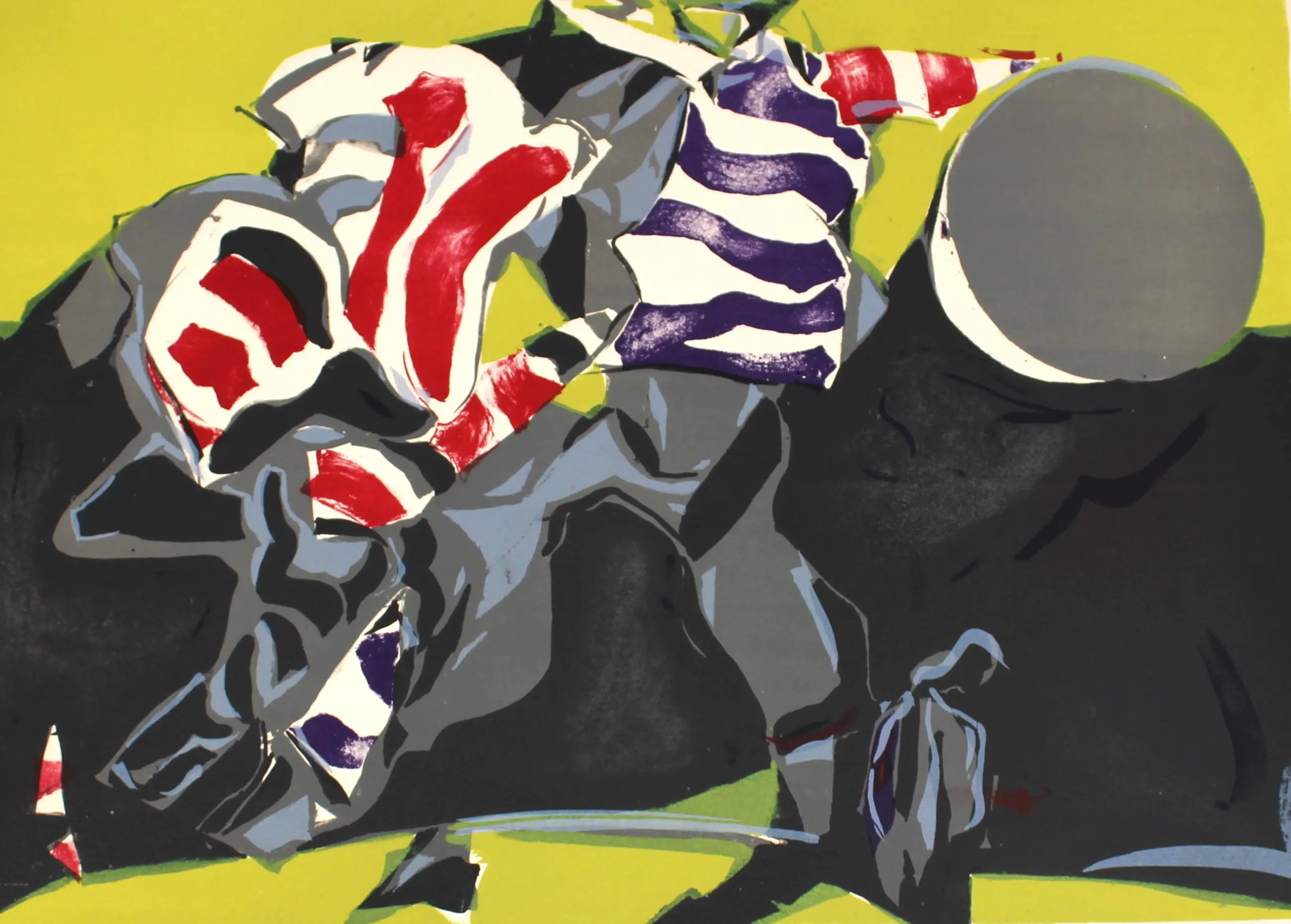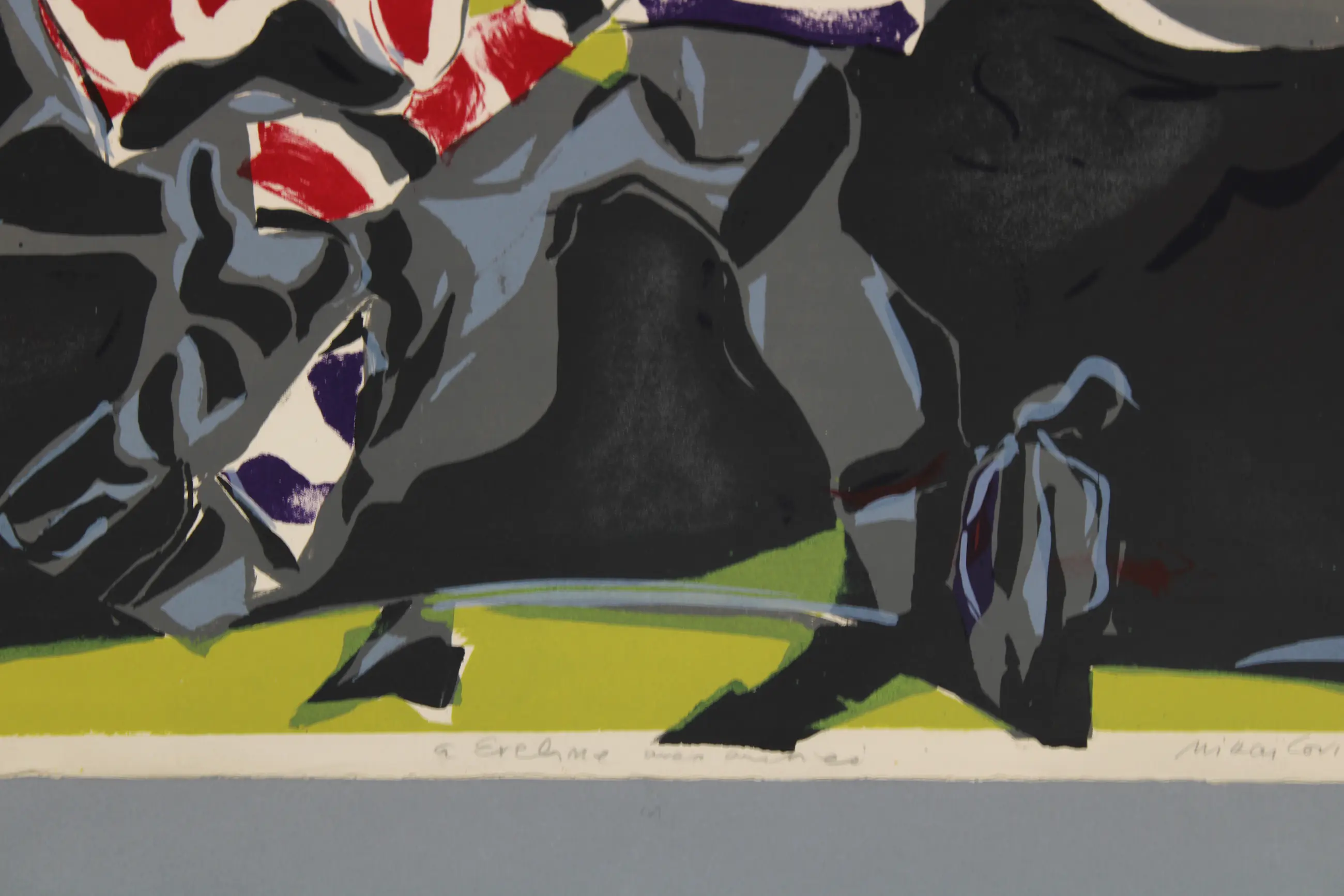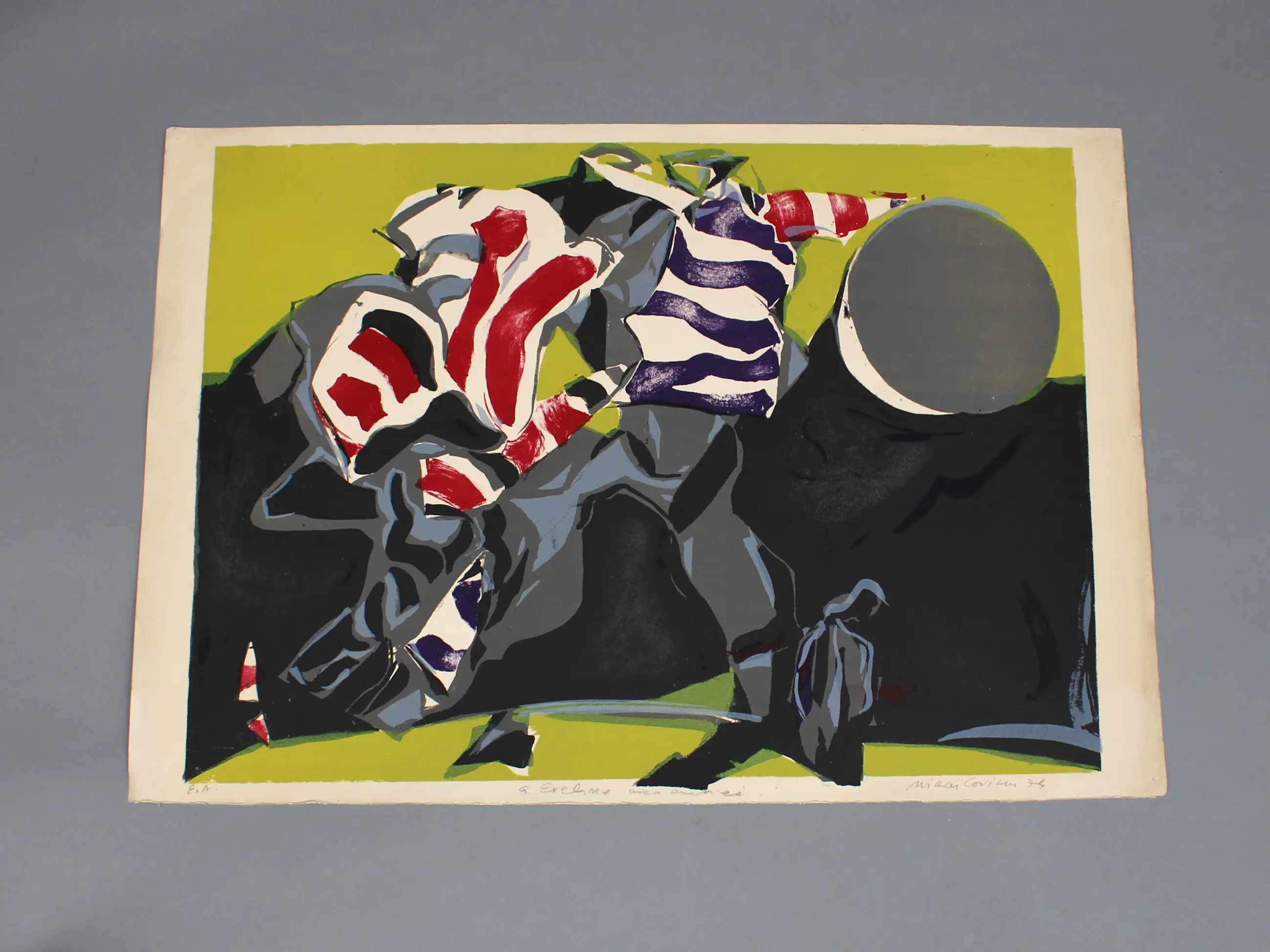 Kunstenaar: Milorad Bata Milhailovitch (1923-2011) Titel: Football Jaartal: 1974 Techniek: Litho Oplage: E.A. Papiermaat: 76 x 53 cm. Afbeeldingsmaat: 67 x 49 cm. Conditie: Gesigneerd in potlood, enkele klein vouwtjes en verkleuring, aan de randen maar buiten de afbeelding