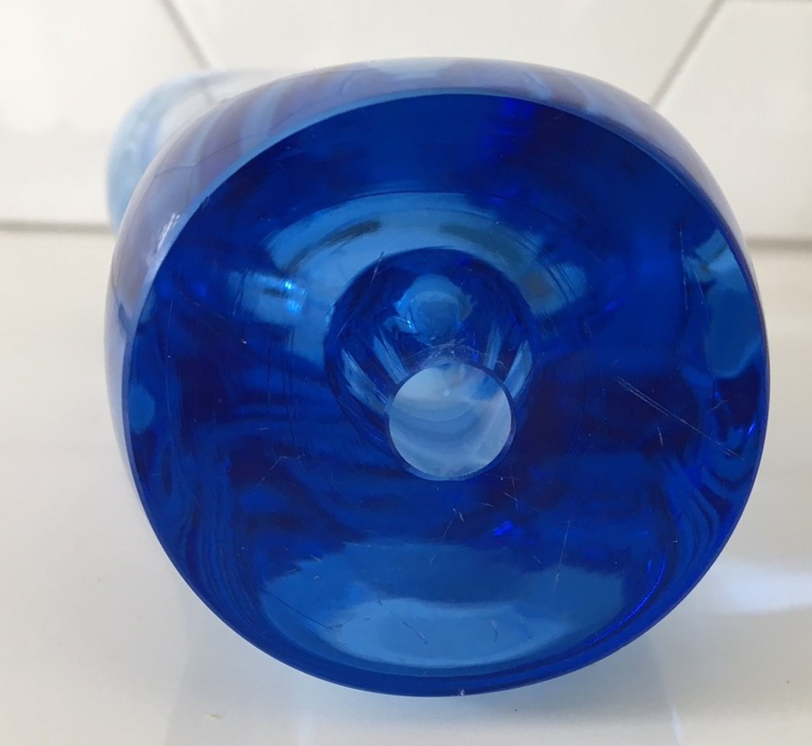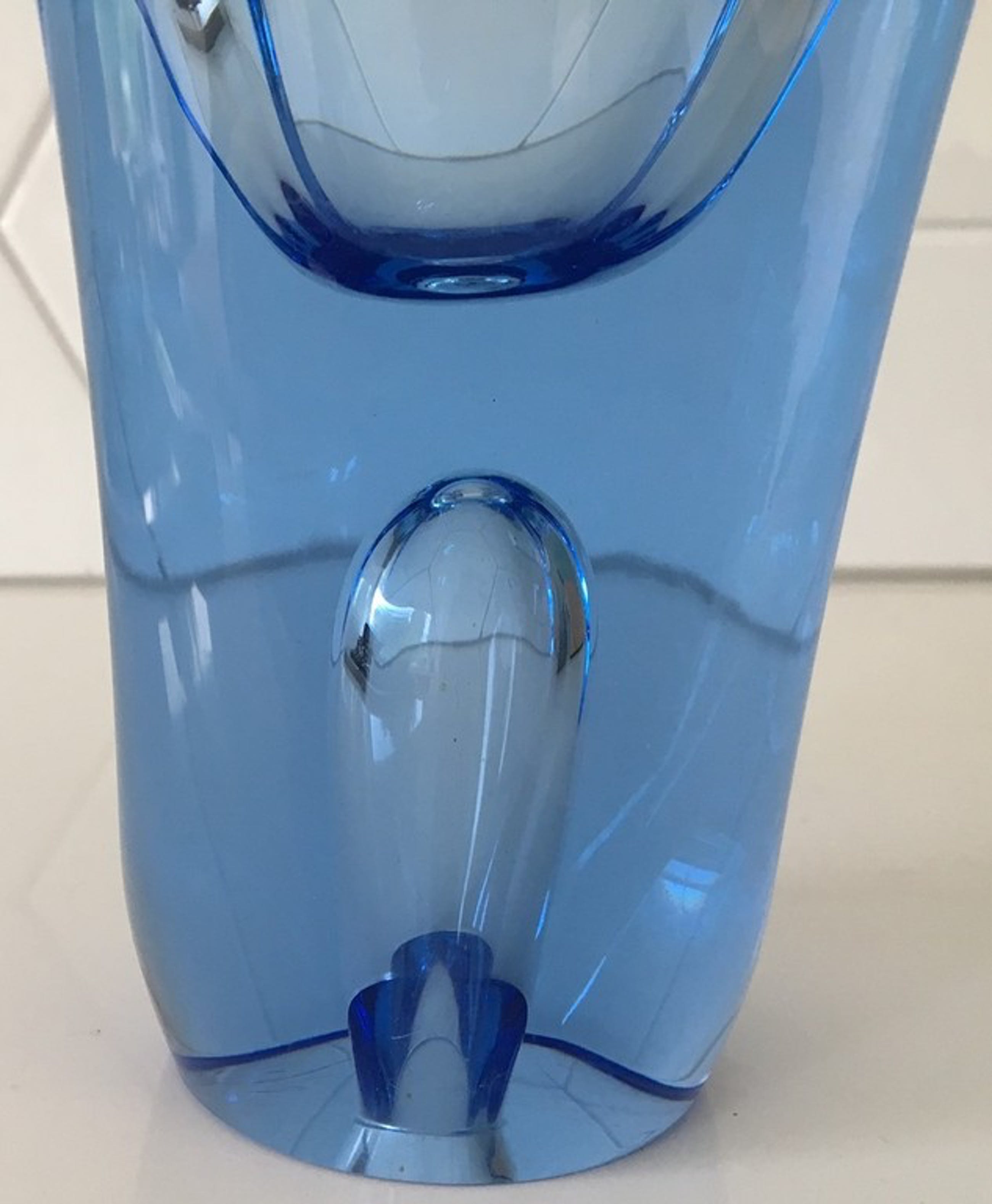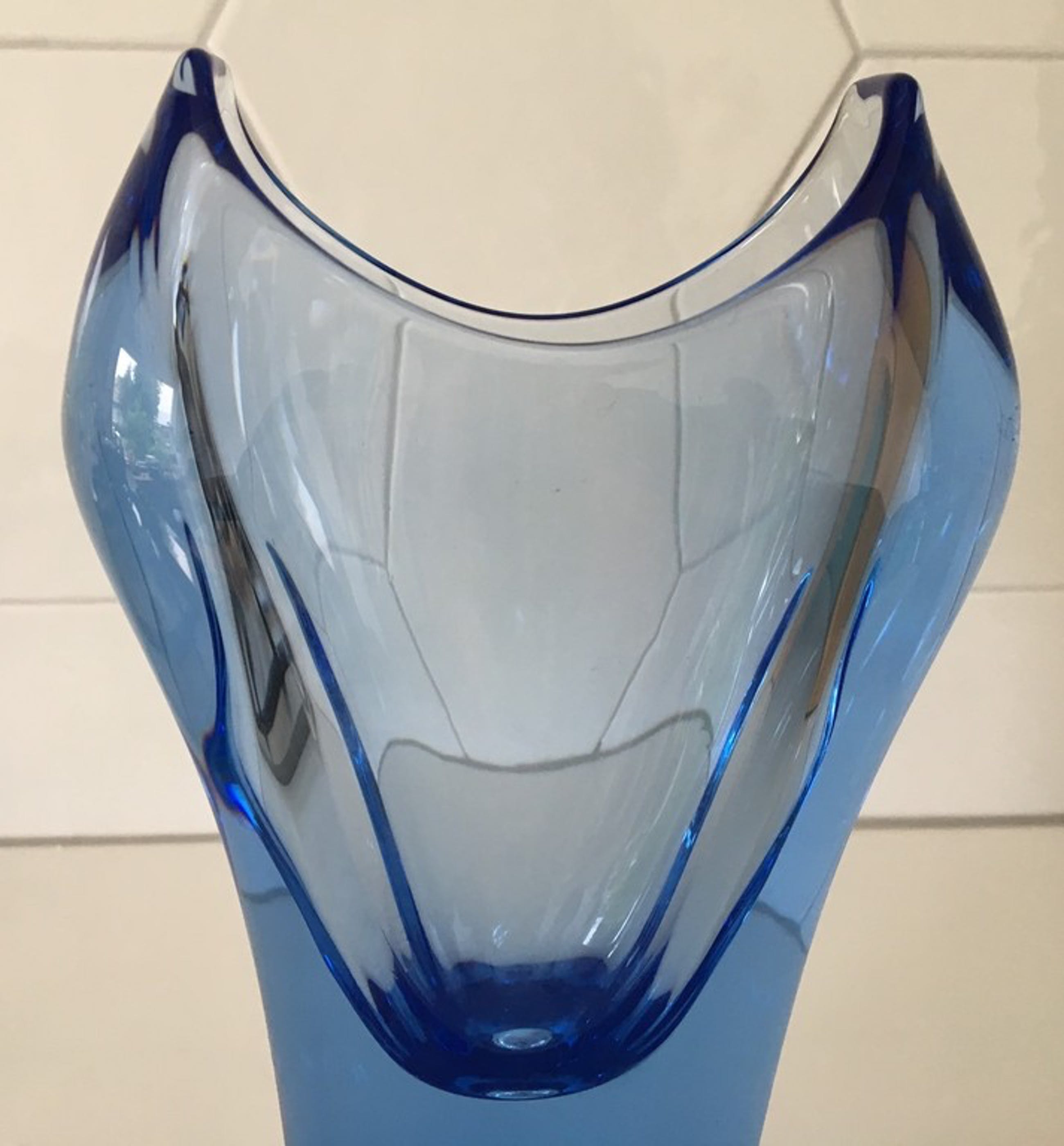 Prachtige lichtblauwe dubbelwandige vaas ontworpen door Miloslav Klinger in de jaren'60 voor de glasfabriek Zelezny Brod Sklo, ook wel bekend als ZBS. De vaas is in prima onbeschadigde conditie, geen aanslag of vuil wet wel wat gebruikskrasjes onderaan de voet. Niet gemerkt.