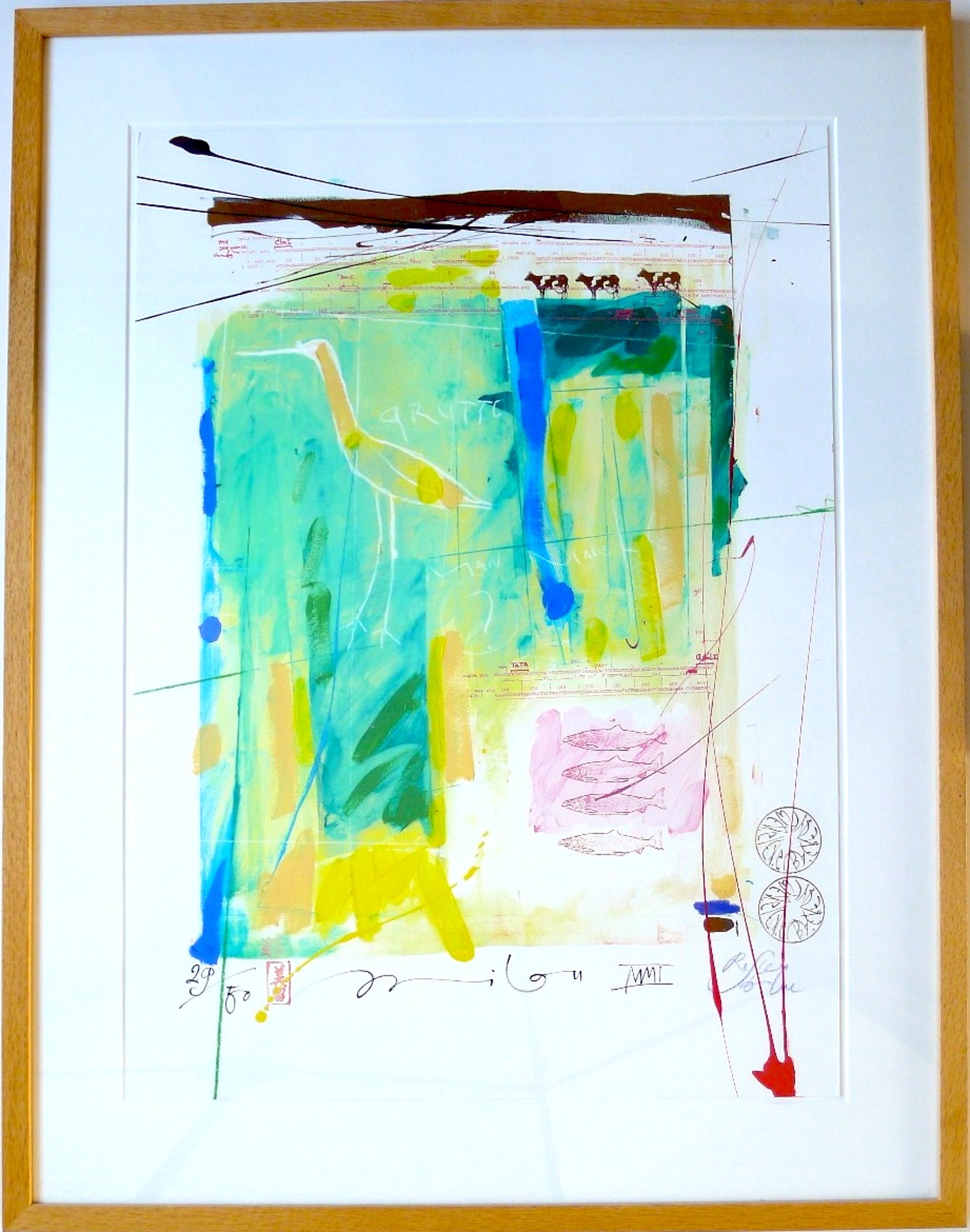 Een artistieke impressie van de Grutto in zijn landelijke groene weide omgeving. Een illustratief beeld dat helaas niet vaak meer in Nederland te spotten is en daarom een goede herinnering is. Een prachtig werk in een typische stijl voor Milou Hermus met frisse kleuren, met de hand aangebrachte stempels en een sierlijk kalligrafisch handschrift. Iedere druk is anders.
