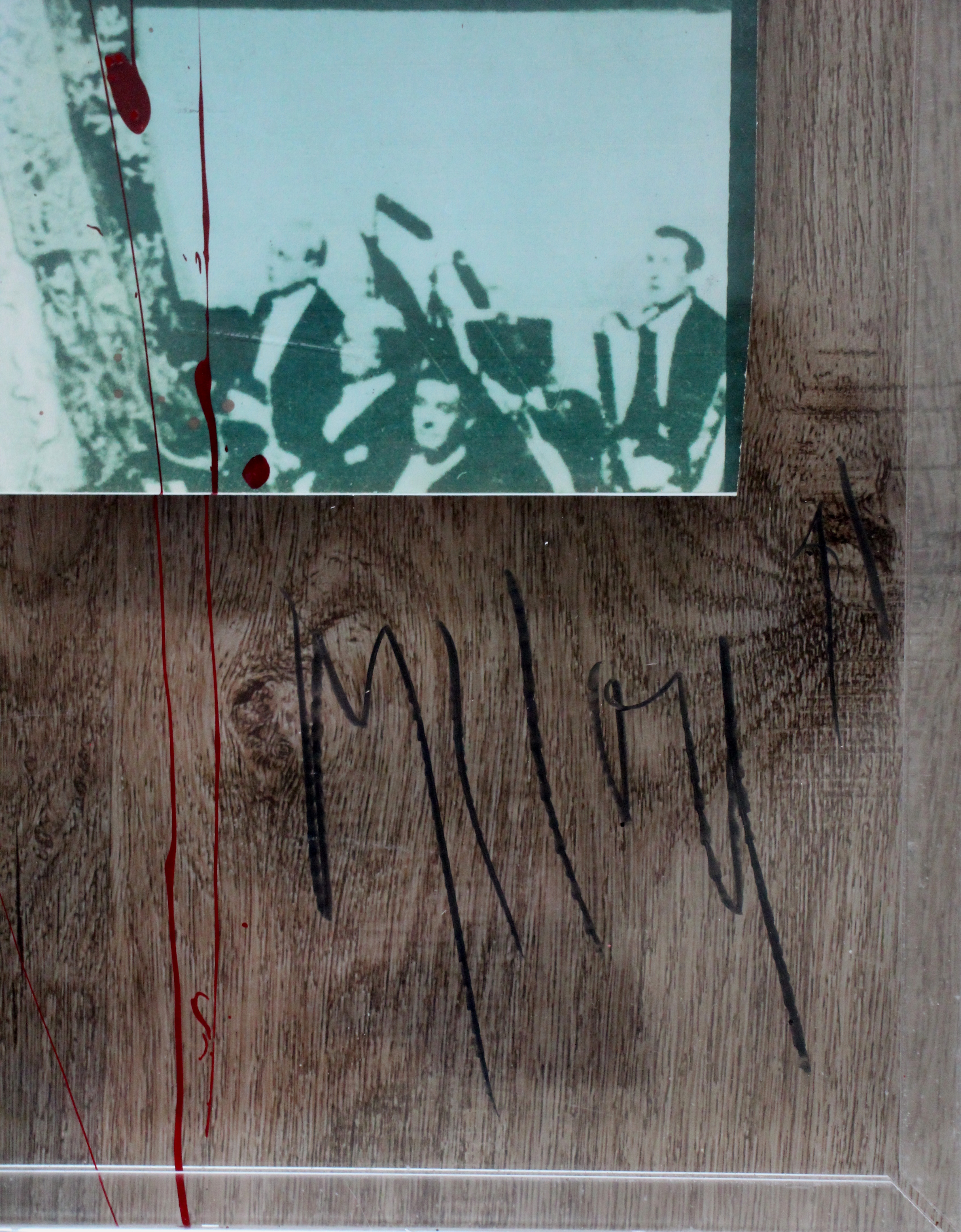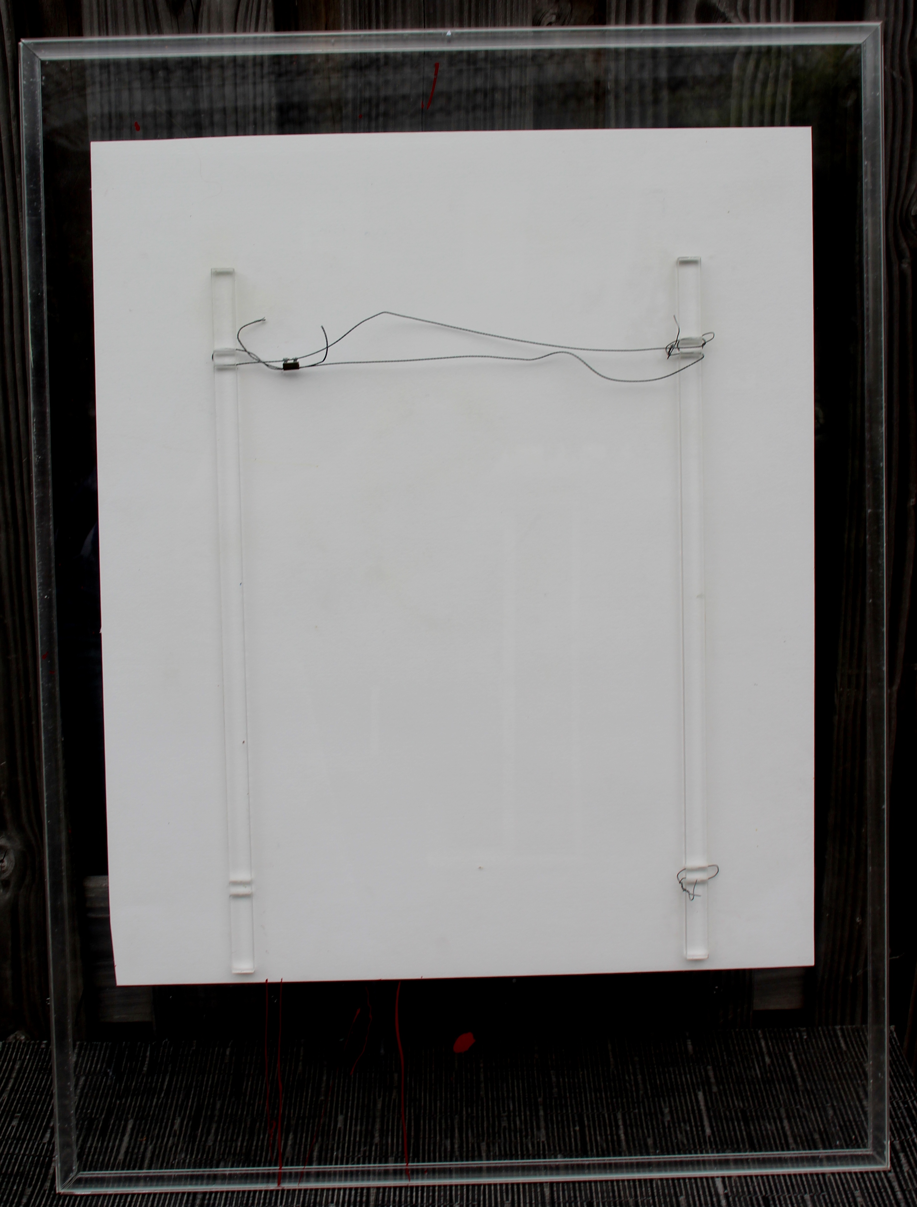De lijst is van Perpex waartussen de prent is geklemd. Door een een strip aan de achterkant komt hij los van de muur. Een fraai effect.De authenticiteit van het aangeboden werk wordt volledig gegarandeerd. Een certificaat van echtheid kan, op aanvraag, worden gemaild.