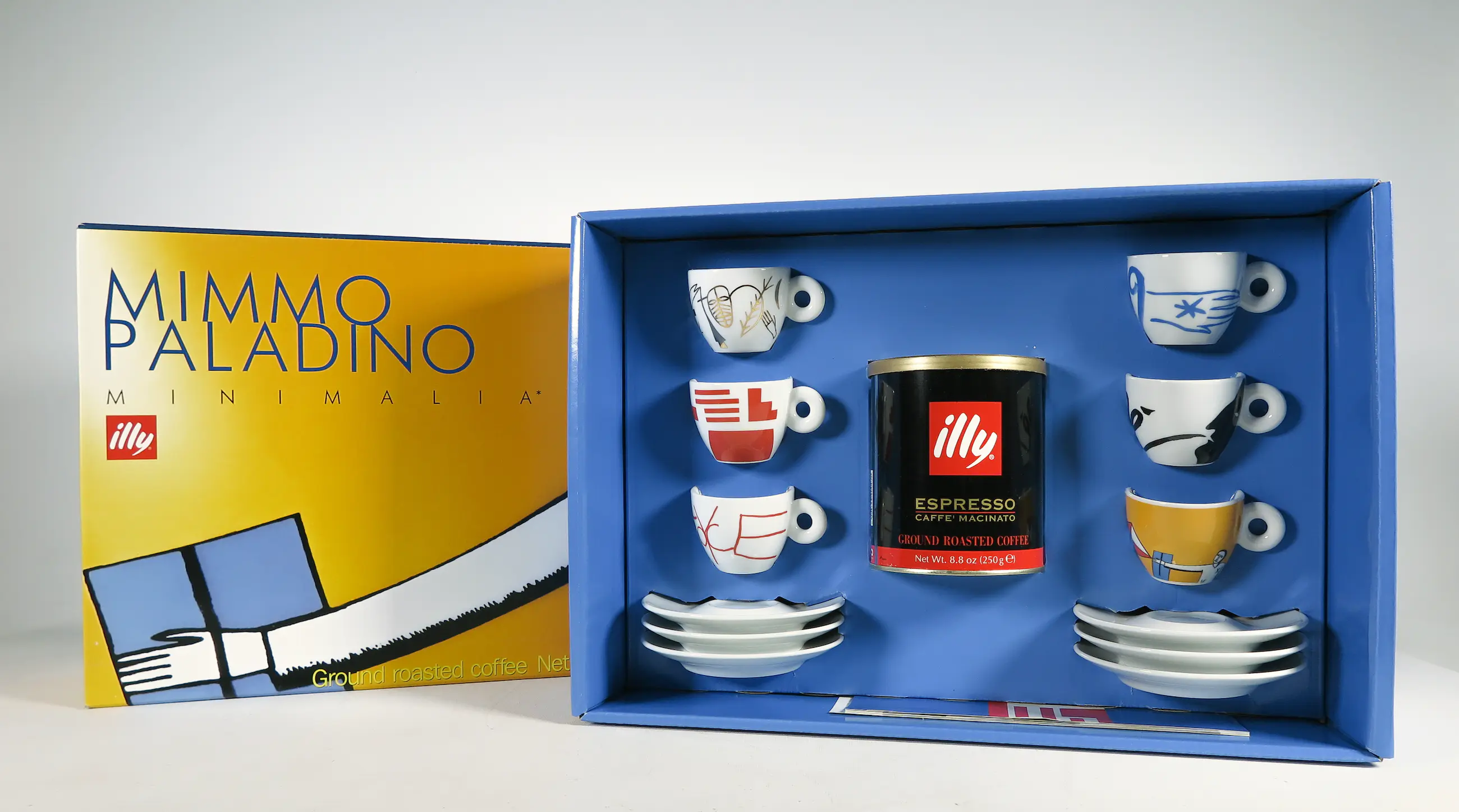 Ontworpen door Mimmo Paladino voor het koffiemerk Illy, een 6-persoons porseleinen espresso-set, bestaande uit zes kopjes, zes schoteltjes en een blik met koffie.