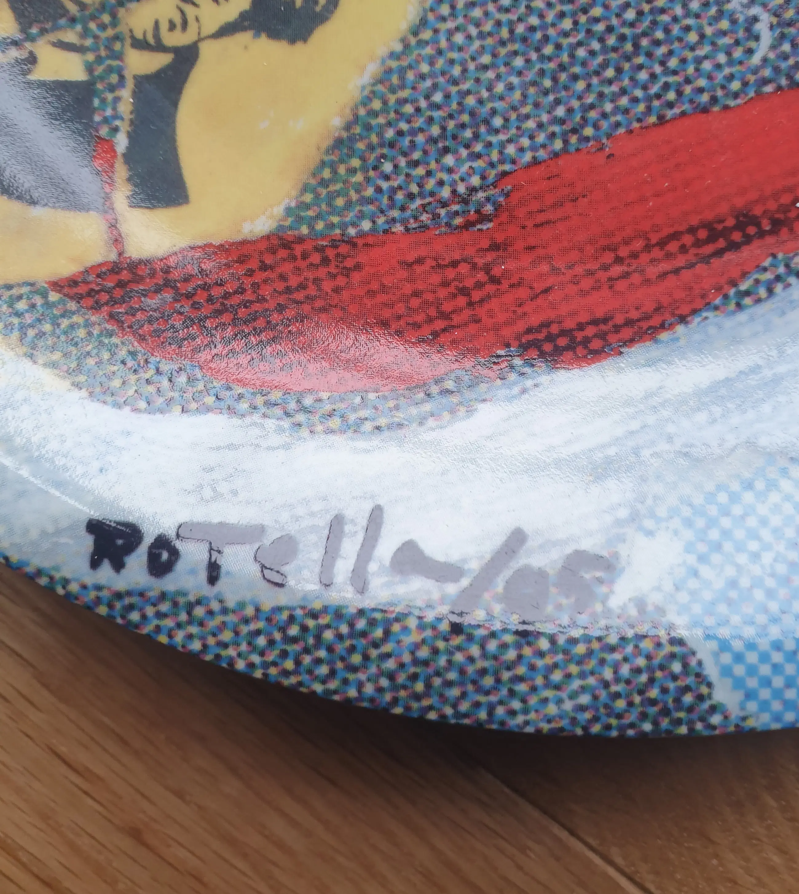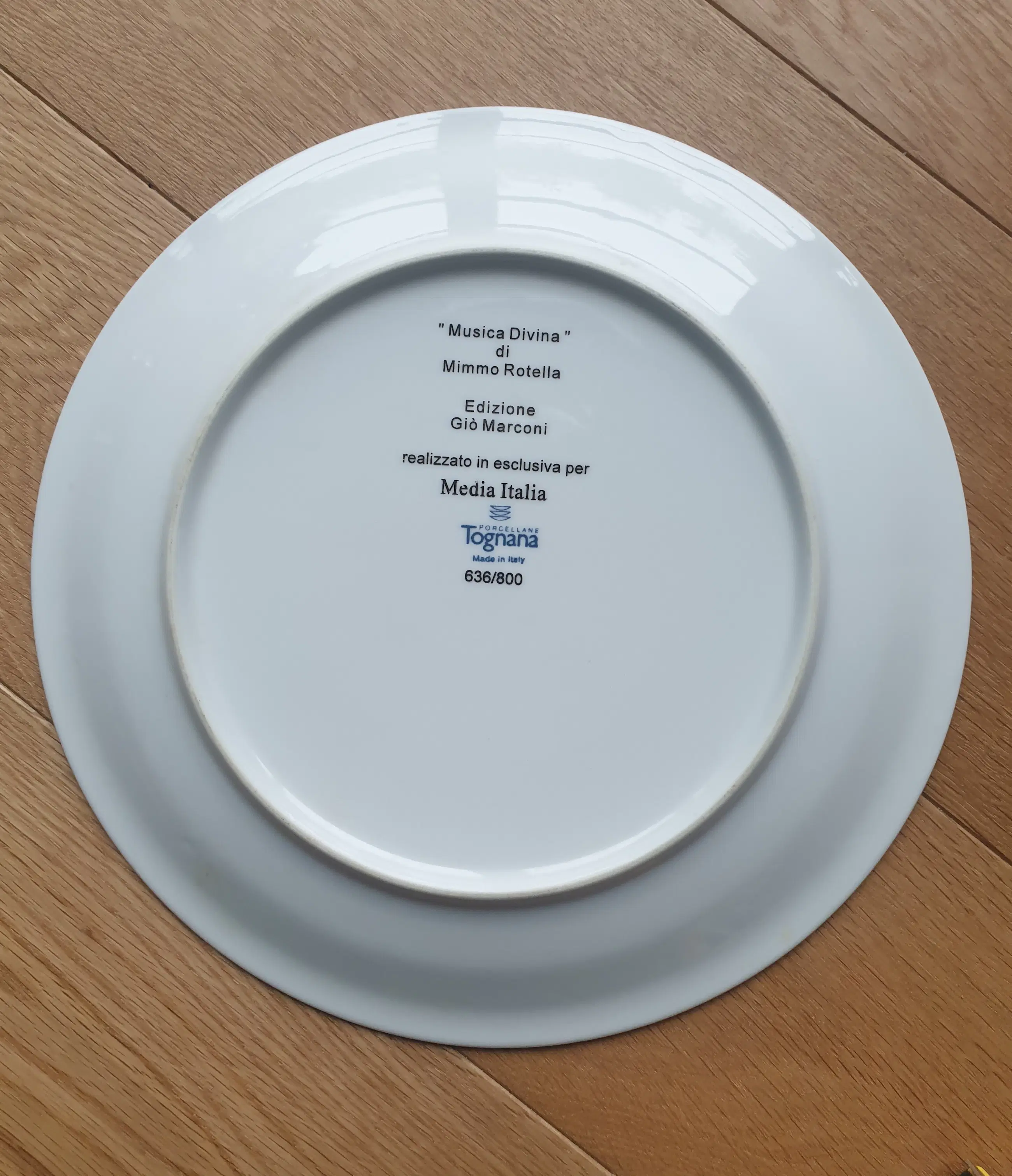 Tognana (Italië) Porseleinen bord van Mimmo Rotella uit 1995. "Musica Divina". Gesigneerd en gedateerd (1995) op de voorzijde. Bord met een diameter van 24 cm. Nummer 636/800. Wordt aangetekend verstuurd, maar kan ook afgehaald worden.