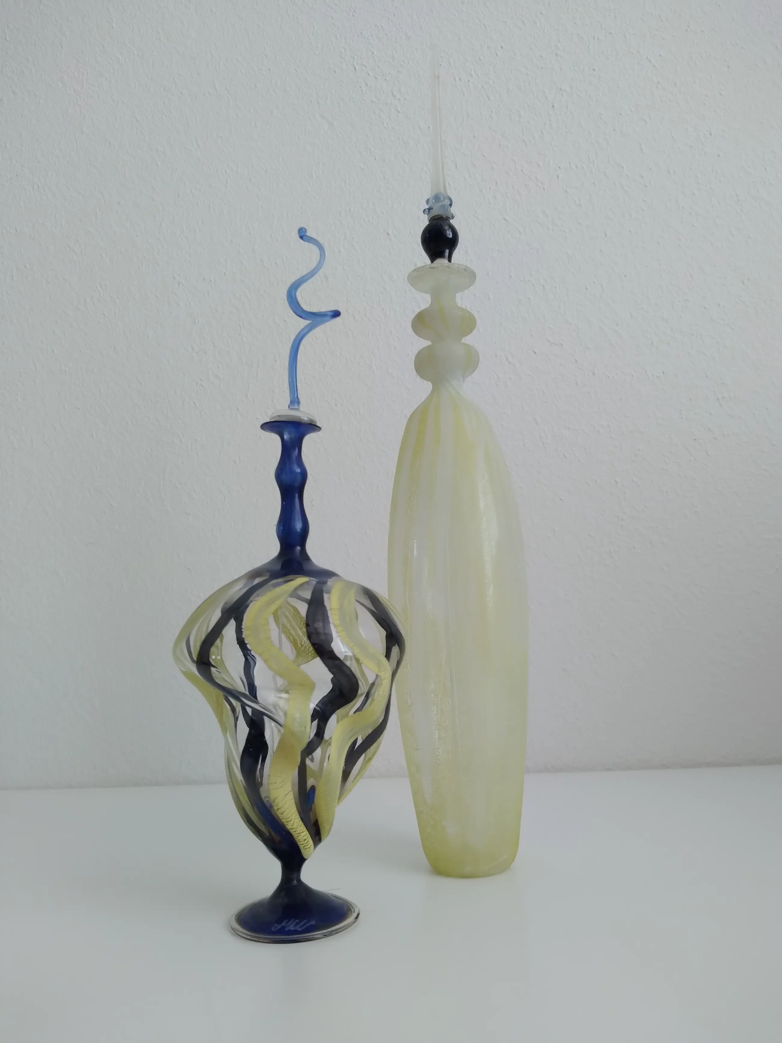 Twee fantasie flesjes van ultra dun glas in geel en blauw, vervaardigd door glaskunstenaar M. van der Waal.