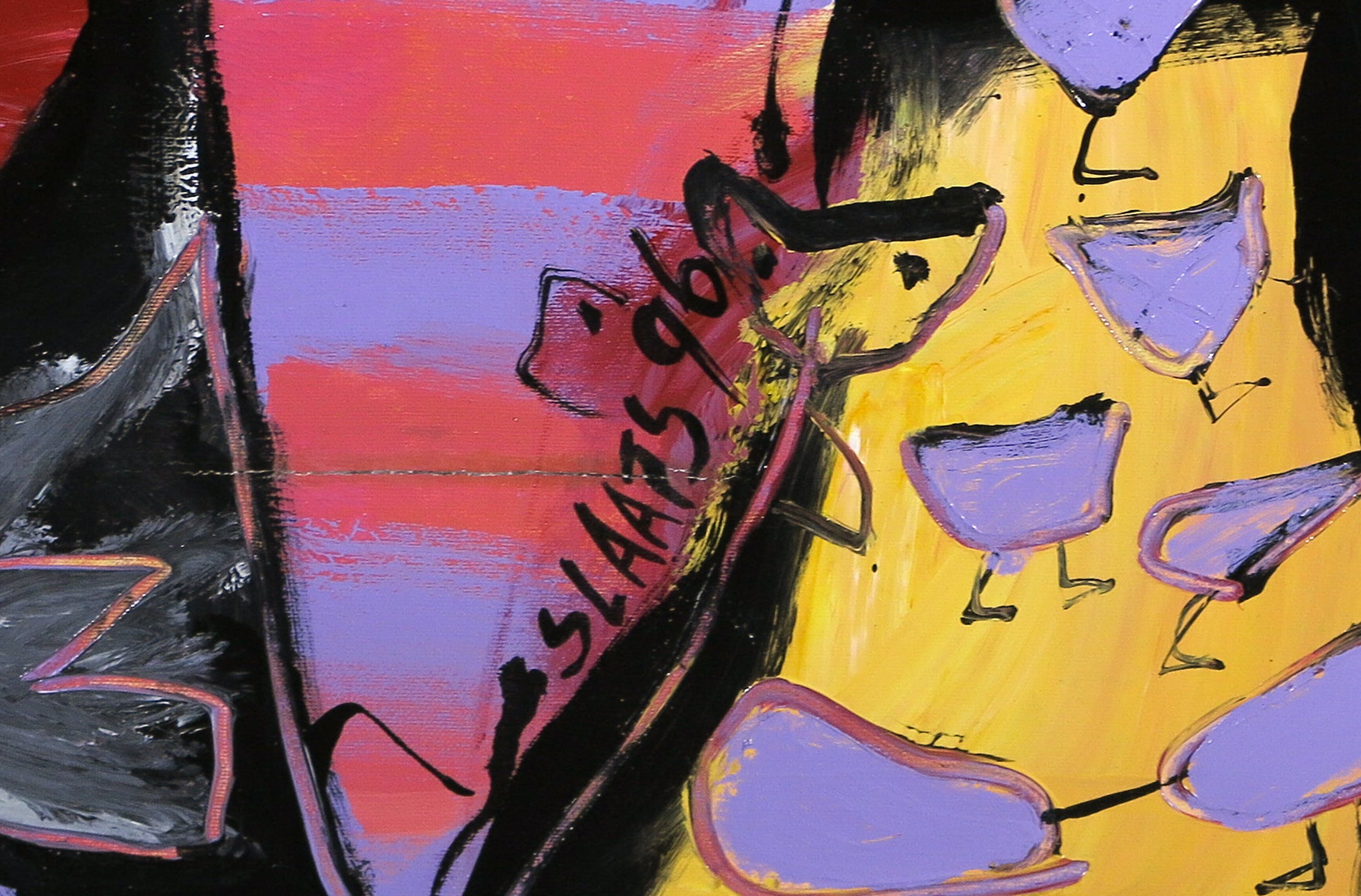 | Lichte slijtage van de verflaag langs de randen van het doek. | |