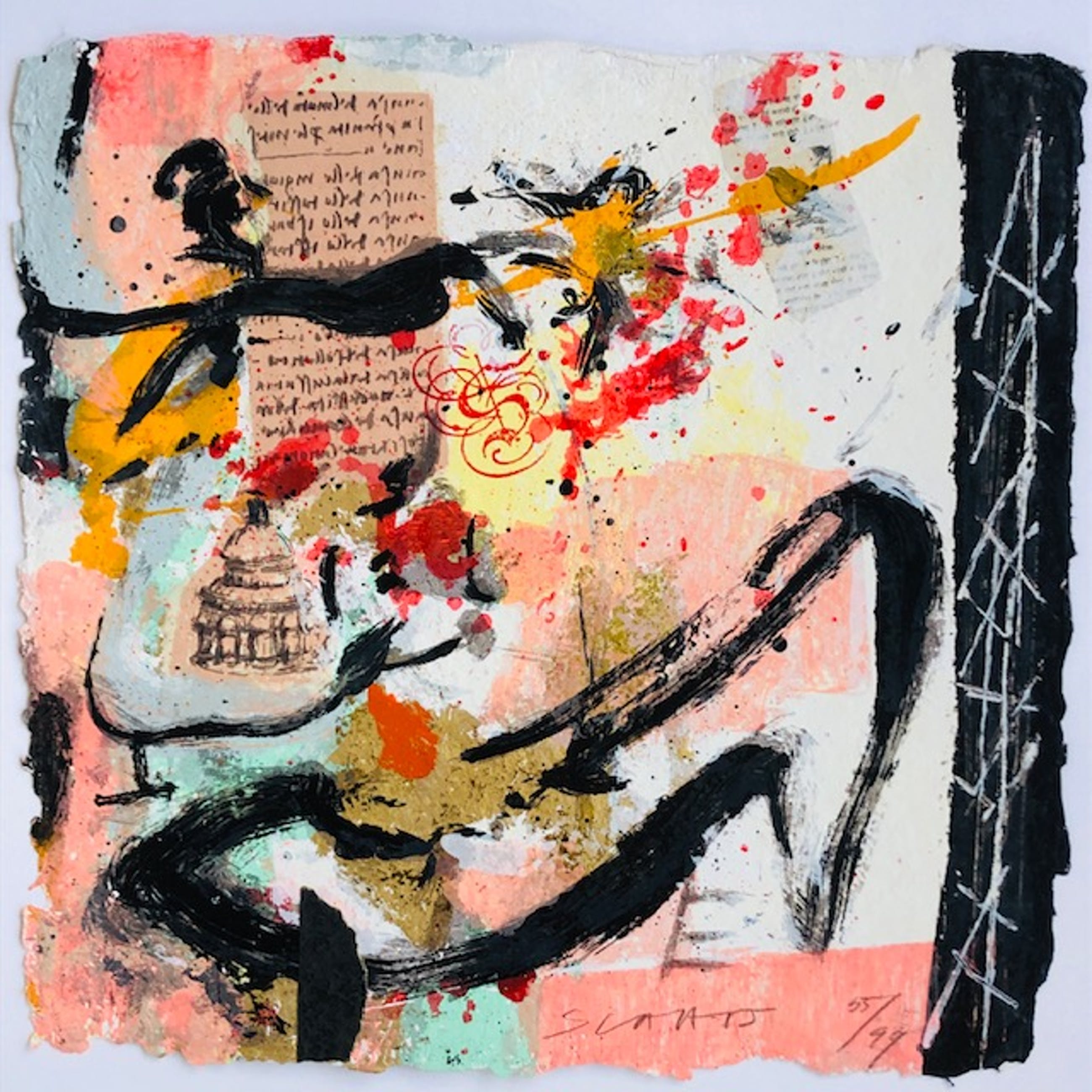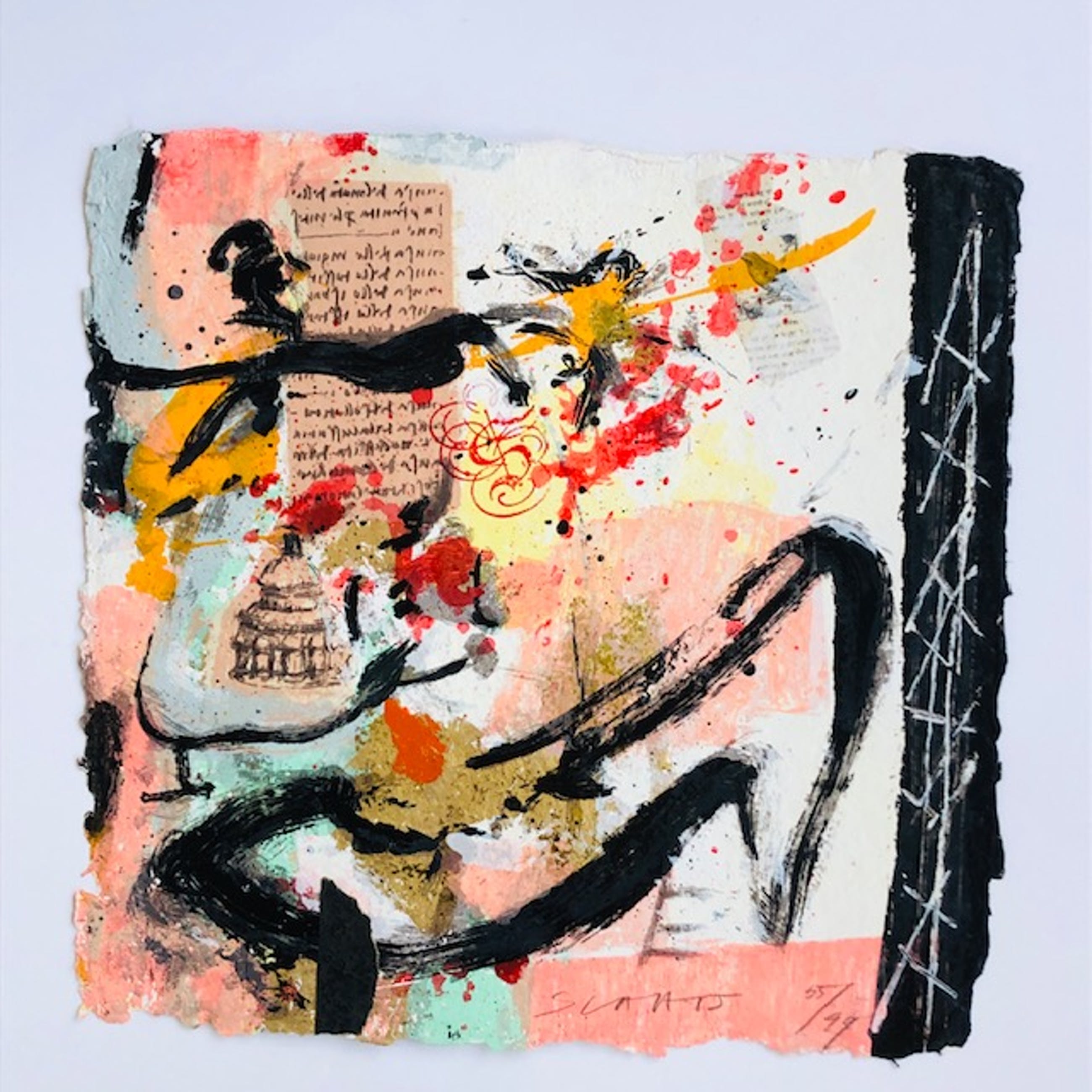 Abstracte compositie van  van Miriam Slaats. Uitstekende druk met veel kleur. Lijkt eerder origineel werk te zijn maar is een zeefdruk.