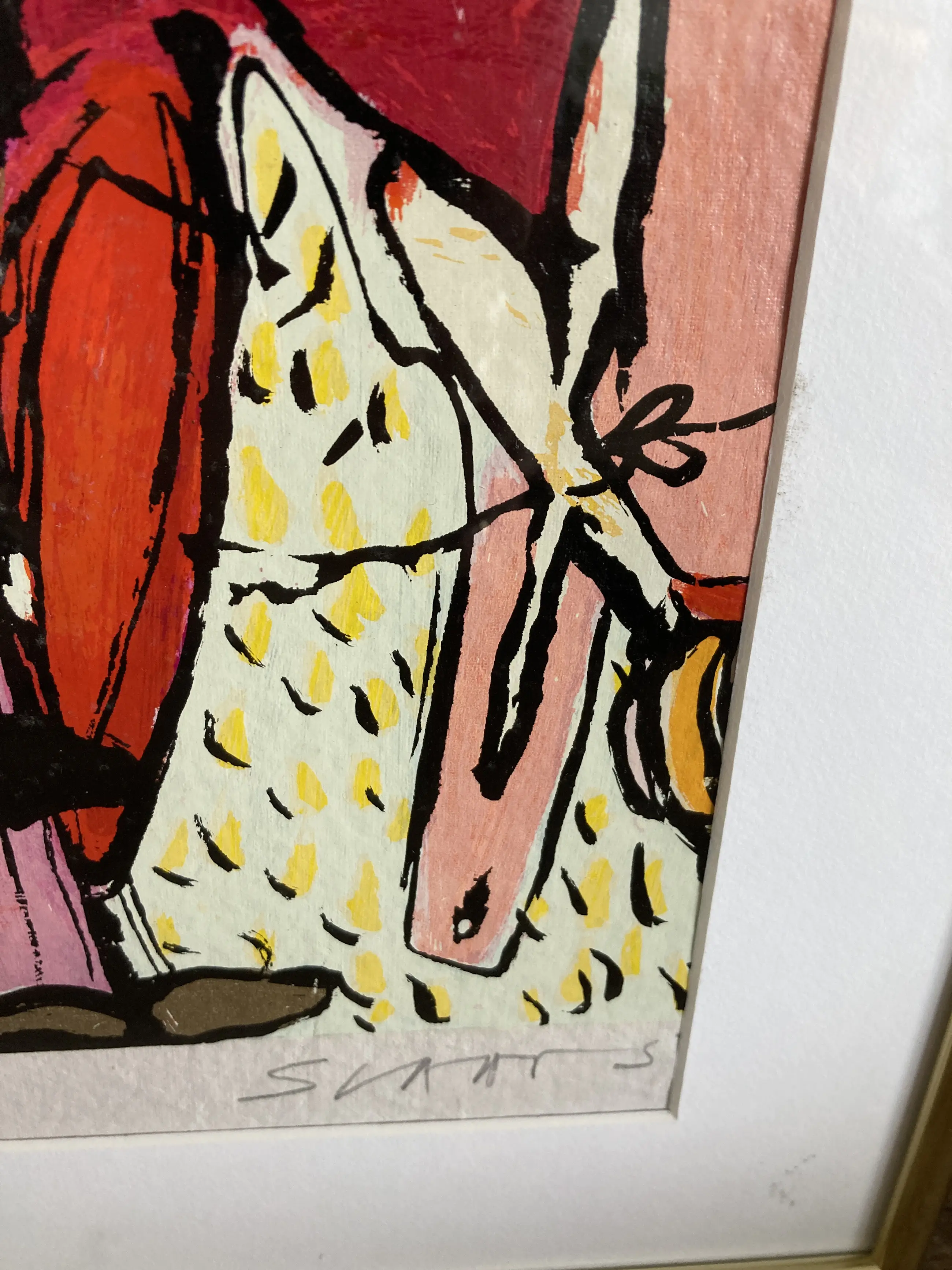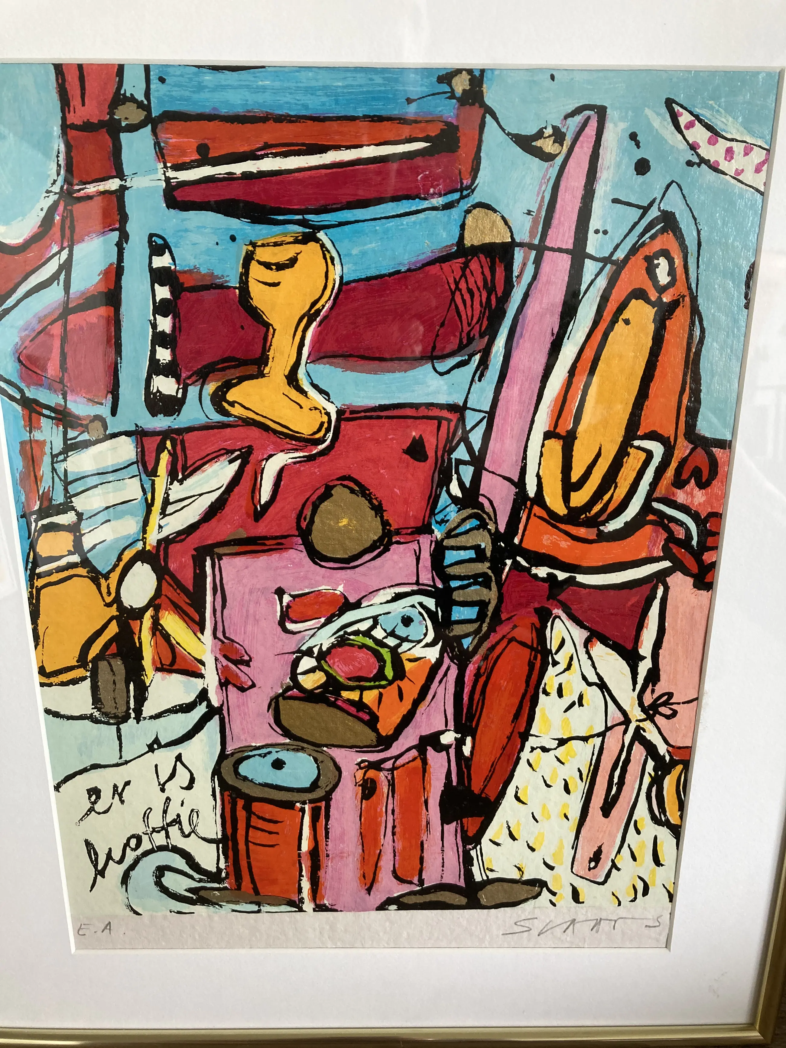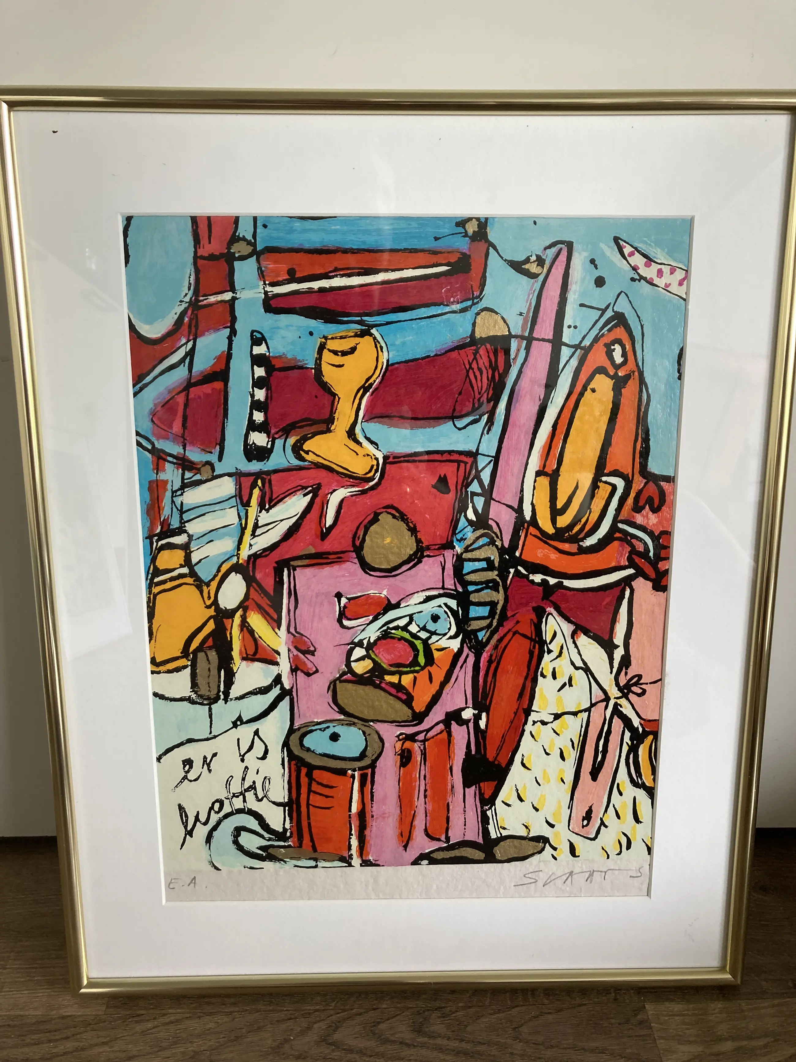 Kleurrijke zeefdruk in een goudkleurige metalen lijst met een fraaie passe partout. Met l.o. E.A. Met potlood en r.o. Slaats met potlood.