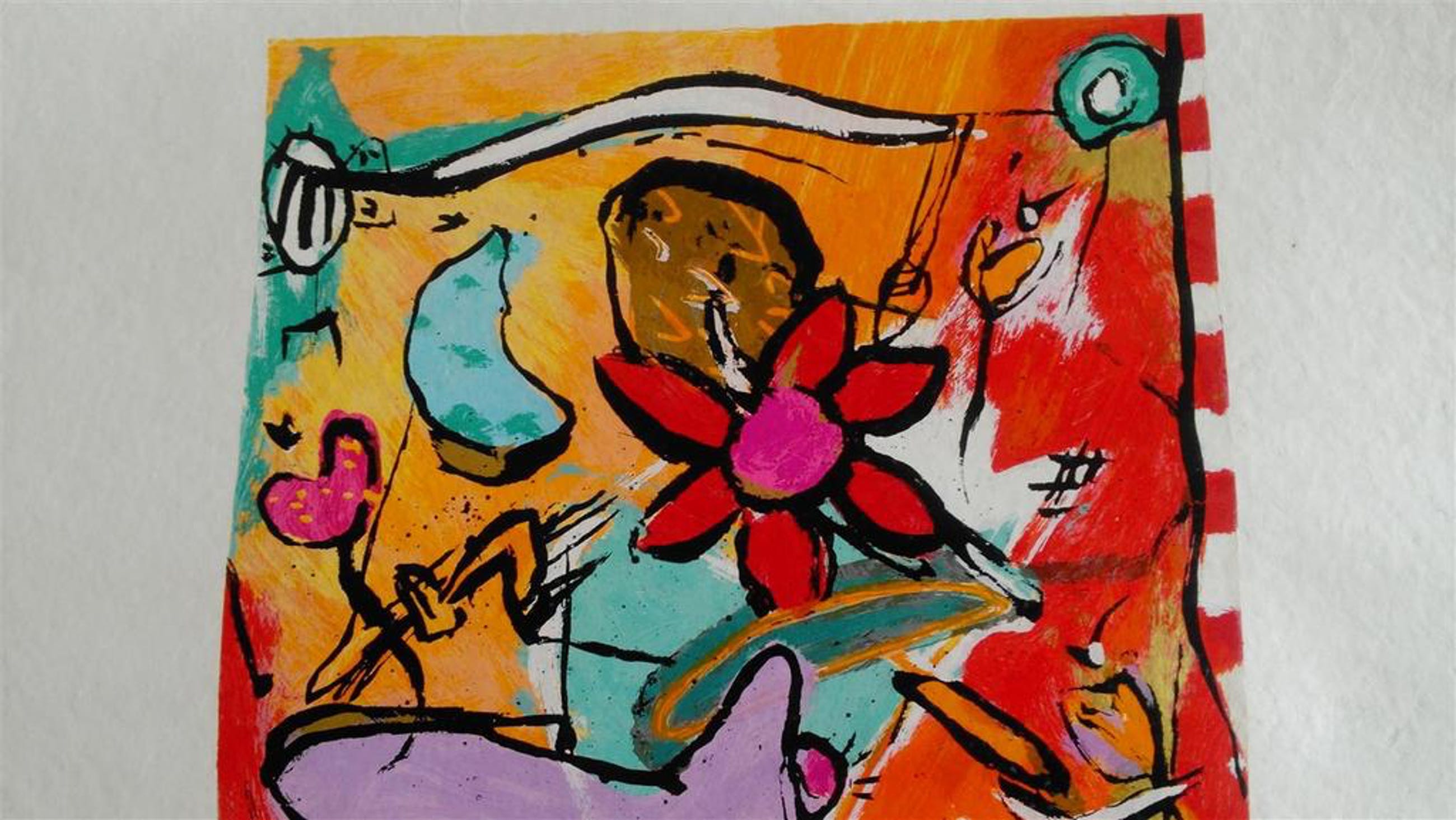 Vrolijke zeefdruk op geschept papier met gekartelde randen Titel Lente Snufje