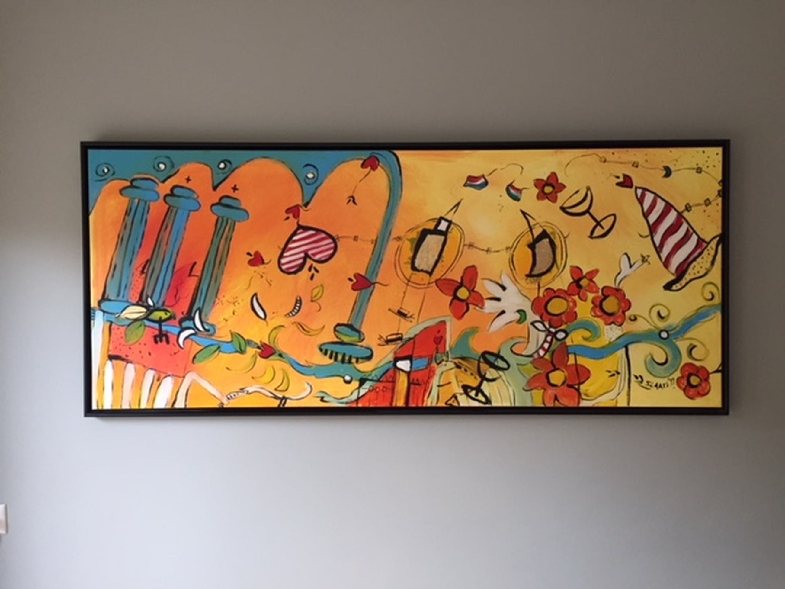 Schilderij van kunstenares Miriam Slaats, geschilderd ca. 2000. Voorzien van bladgouden details. In opdracht geschilderd, betreft een bruiloft in venetië. Afmeting 174 x 74cm. Gesigneerd rechtsonder. We zijn eerste eigenaar.