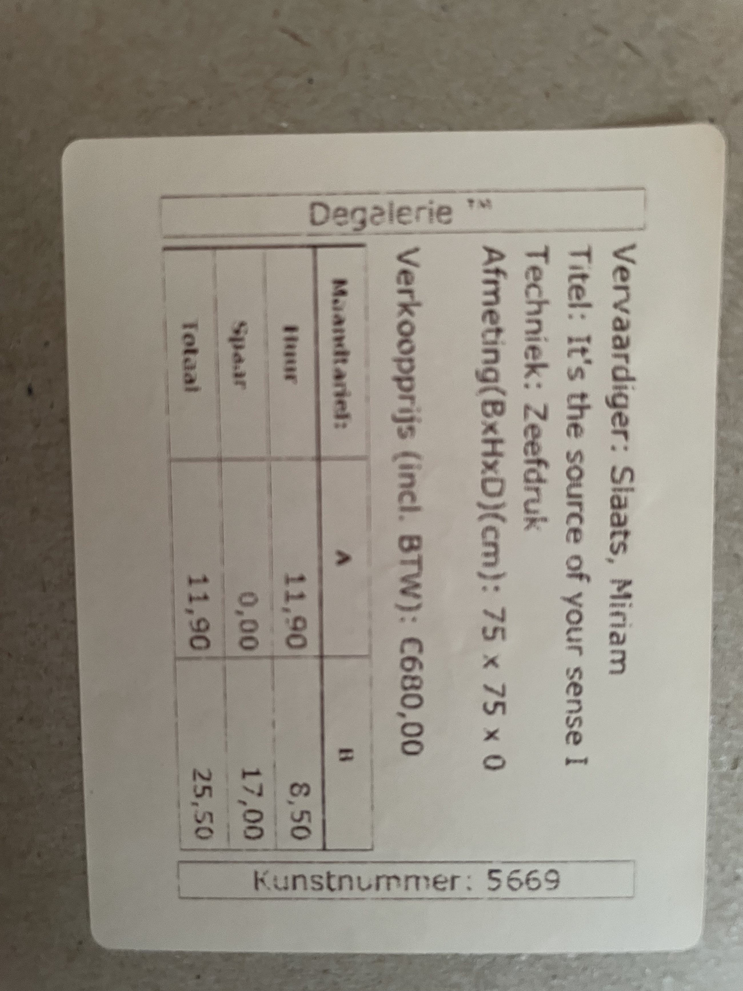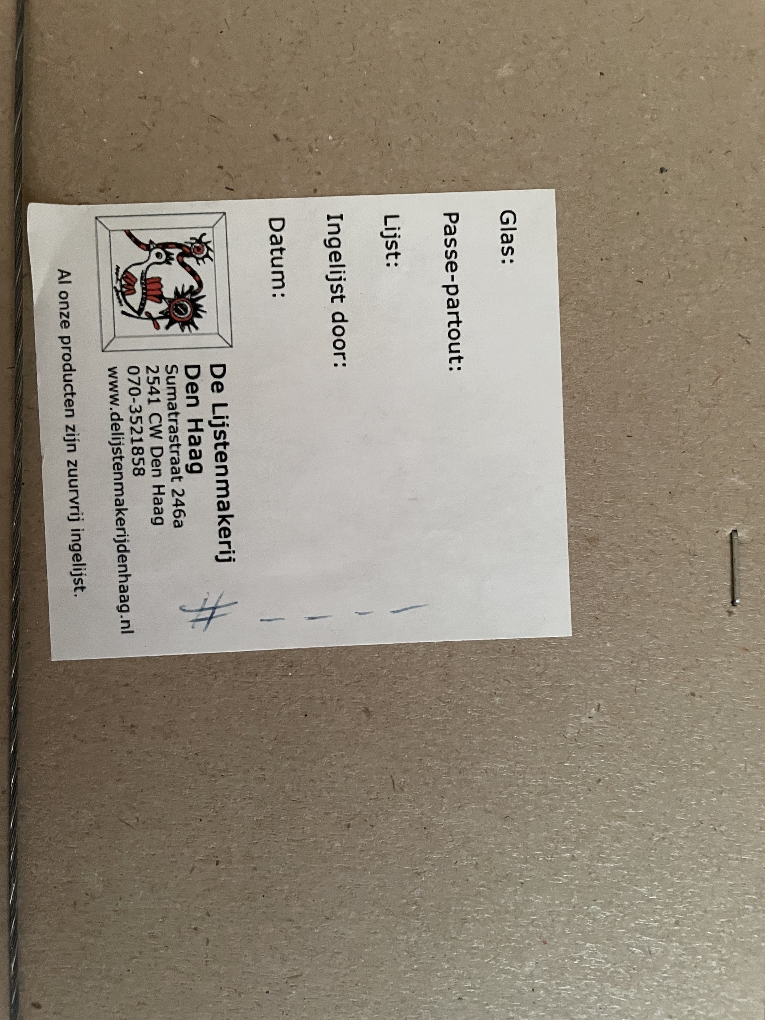 | Afhalen | Het werk is af te halen op locatie. Als koper dient u zelf verpakkingsmateriaal mee te nemen. De locatie is: Leiderdorp, Nederland | ||||||