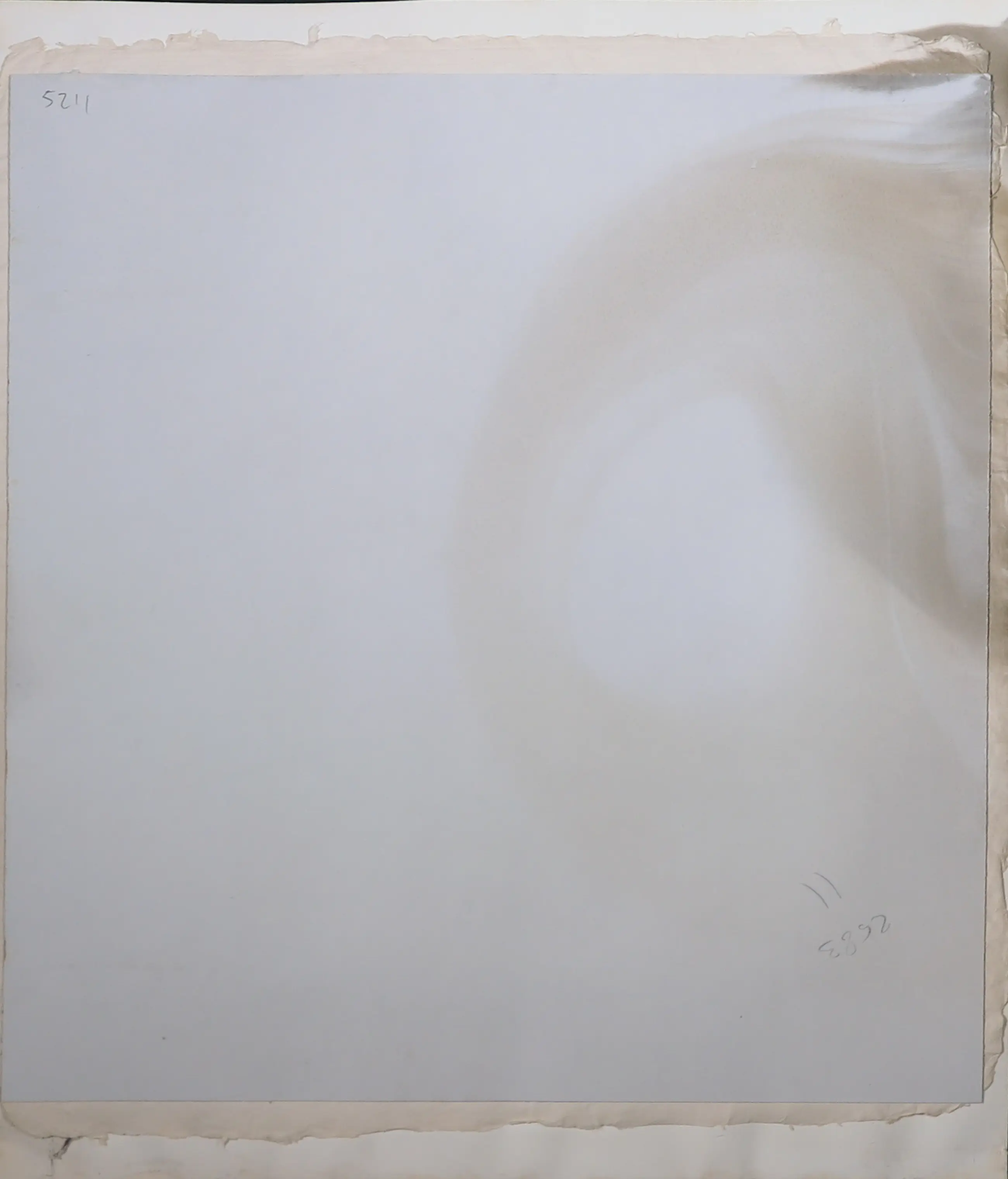 | Hoewel het werk zelf in goede staat is, heeft het passe-partout behoorlijke vochtschade opgelopen. Op de voorkant is dit vooral onderaan zichtbaar. Op de achterkant zit de vochtschade voornamelijk rechts, en dan vooral op het onderblad dat aan het werk is vastgelijmd. | |||||||||||