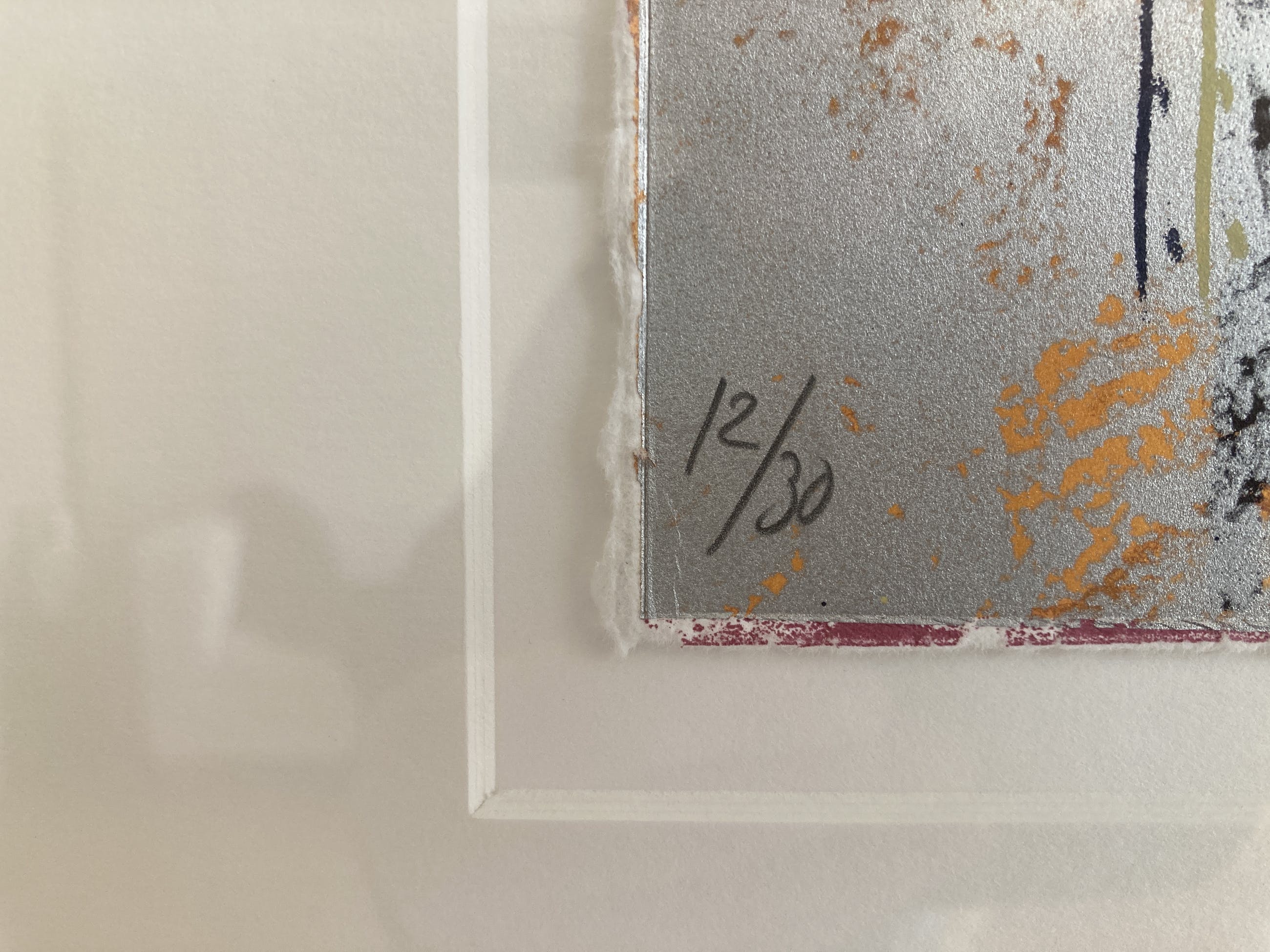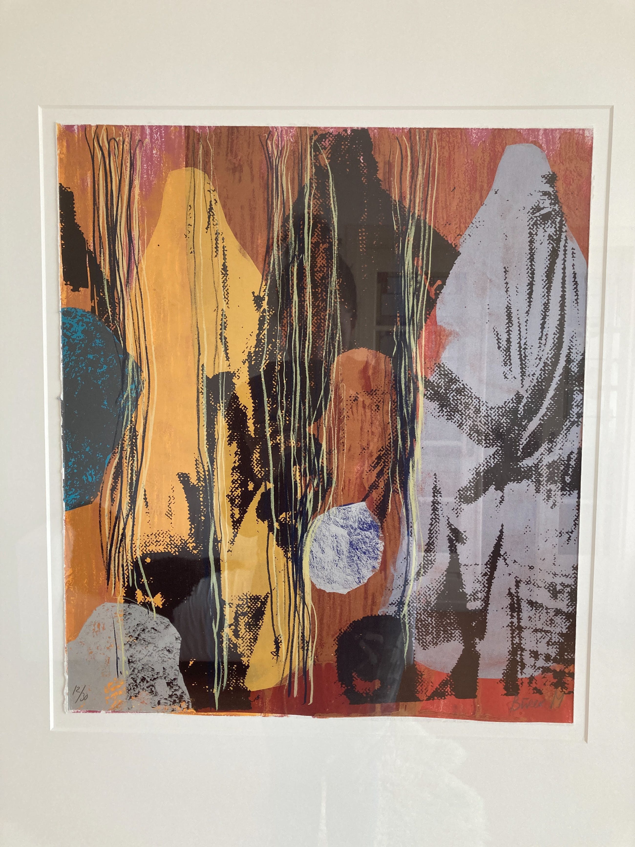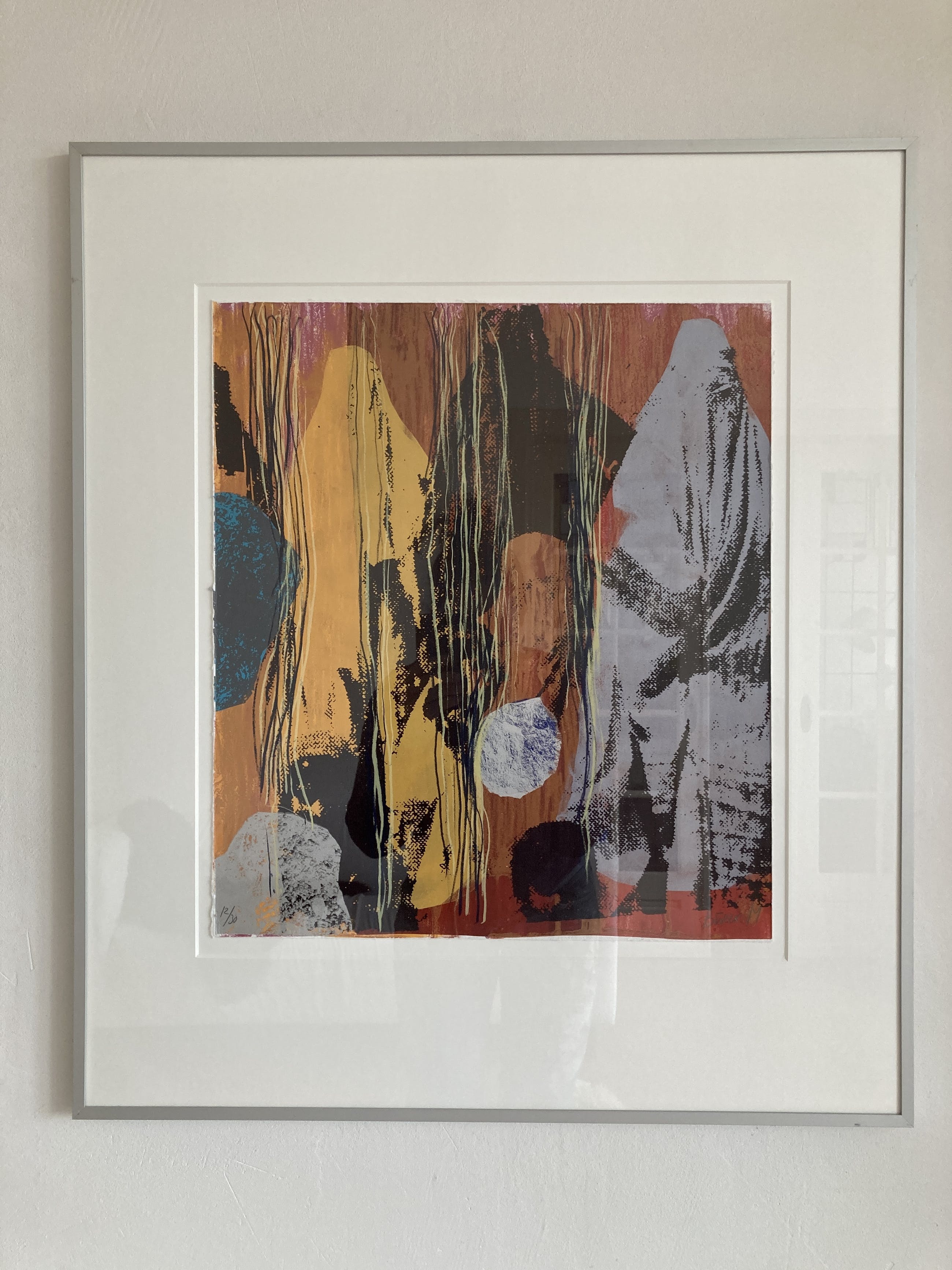 Enige tijd geleden was er in het Centraal museum Utrecht een overzichtstentoonstelling van het werk van Mirjam Burer . De zeefdruk die ik verkoop is nummer 12 van een kleine oplage van 30. De zeefdruk is is gemaakt met aardse tinten en een contrasterend zeeblauwgroen.