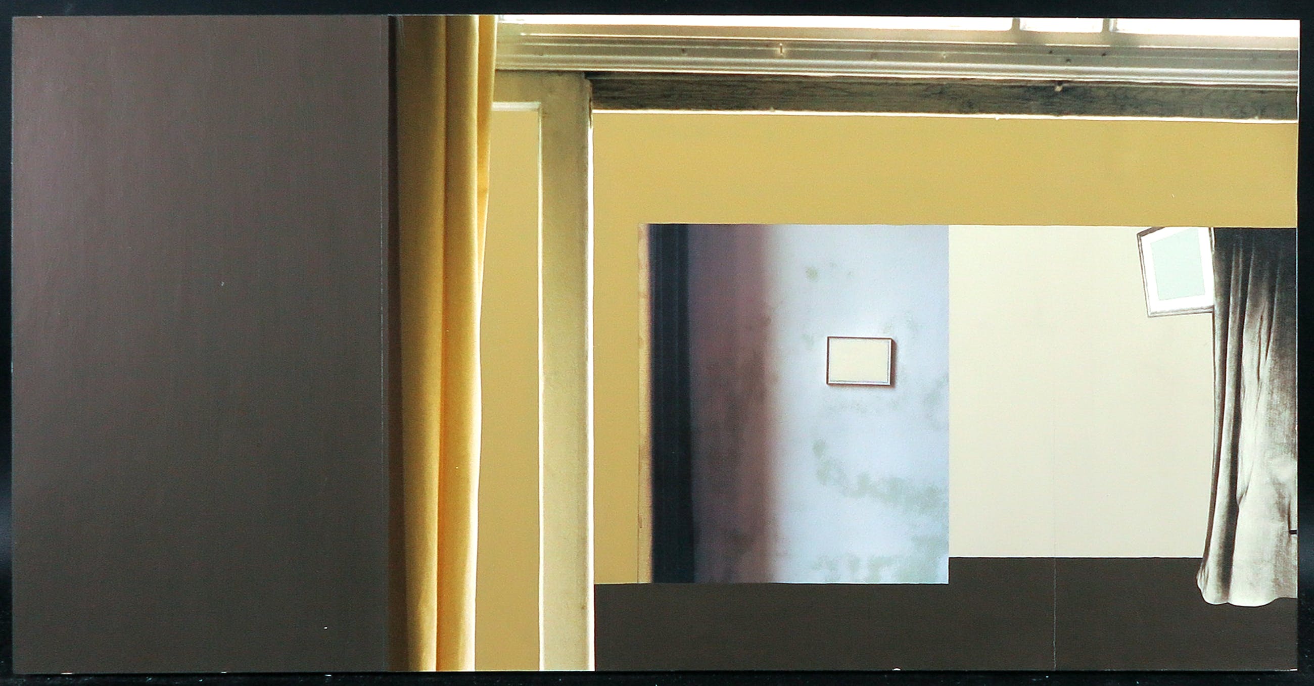 | Langs de randen laat het papier iets los van het paneel, waarschijnlijk is dit nog te lijmen. Er lopen een paar verticale scheurtjes in de verflaag. | |