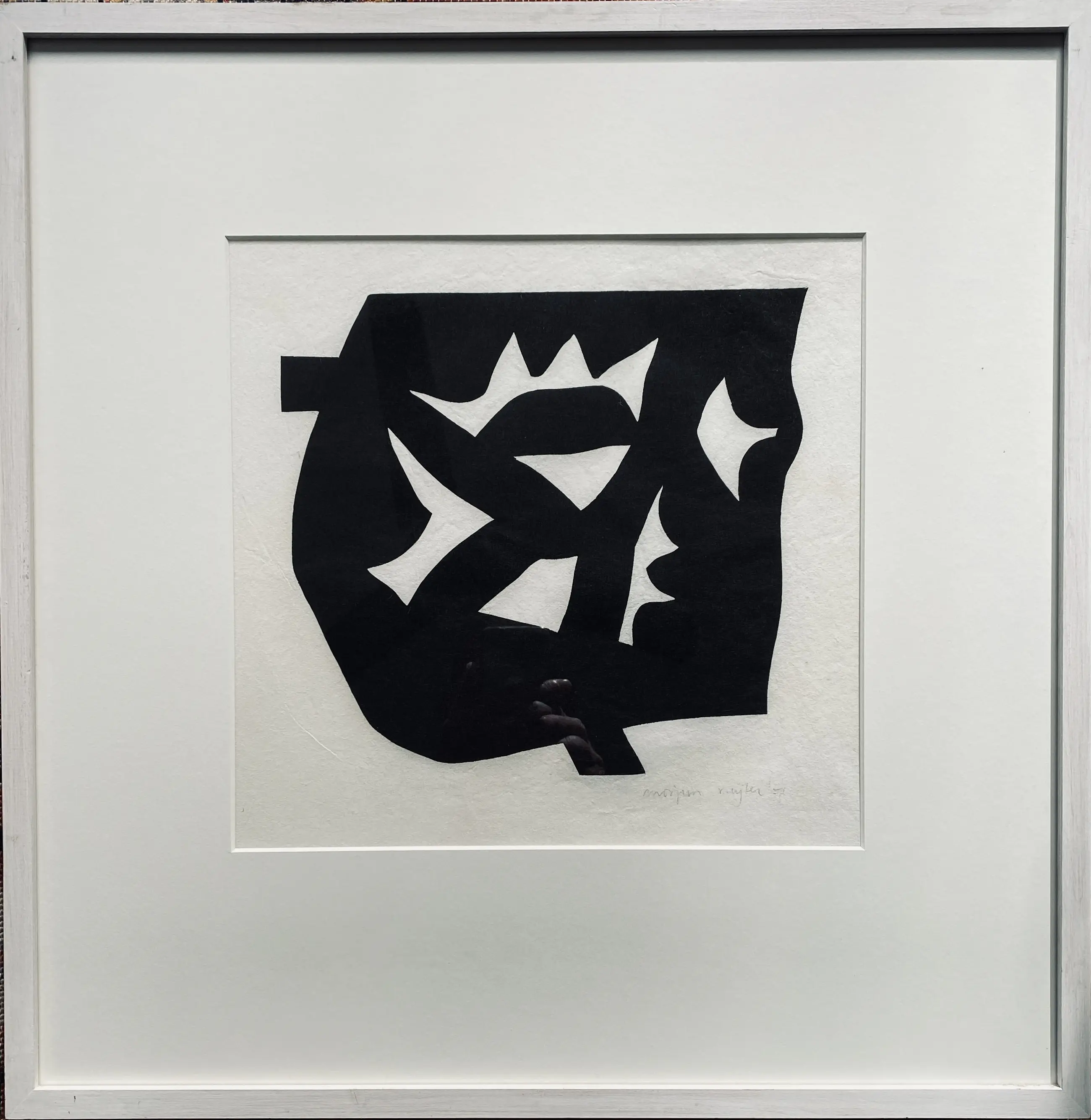 Origineel werk van Mirjam Ruijter, gesigneerd en gedateerd 1971. Deze krachtige abstracte compositie speelt met geometrie en negatieve ruimte, waarbij scherpe witte vormen contrasteren met een organische zwarte kern. Het werk is professioneel ingelijst achter glas en verkeert in uitstekende staat. Een uniek stuk voor liefhebbers van minimalistische kunst met een filosofische ondertoon. Ideaal voor een modern interieur of een verzamelaar van Nederlandse abstracten.