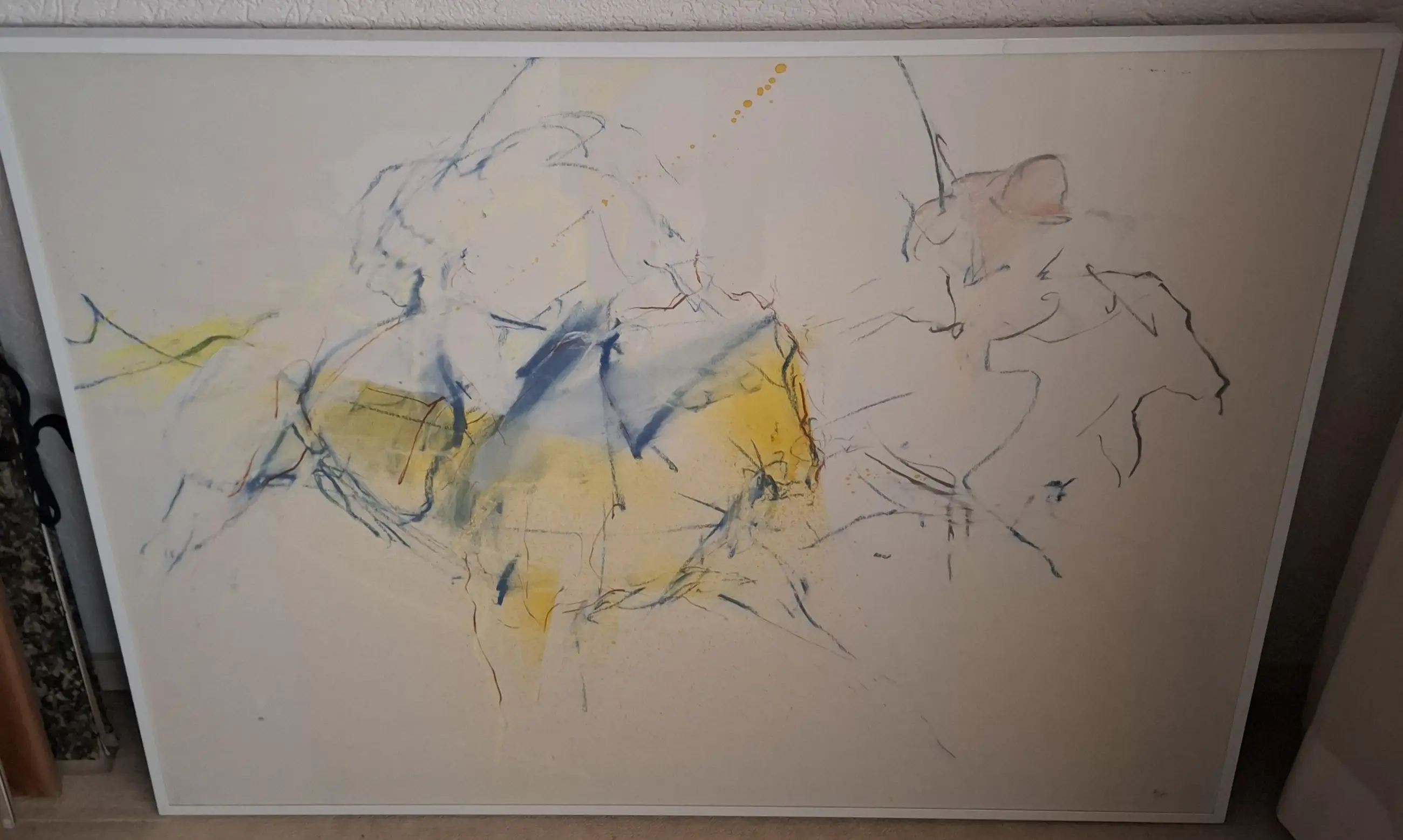 Een abstracte tekening, gesigneerd door Mirjam Verhoeff. Het kunstwerk is ingelijst en verkeert in goede staat. Formaat: 101 x 77 cm.