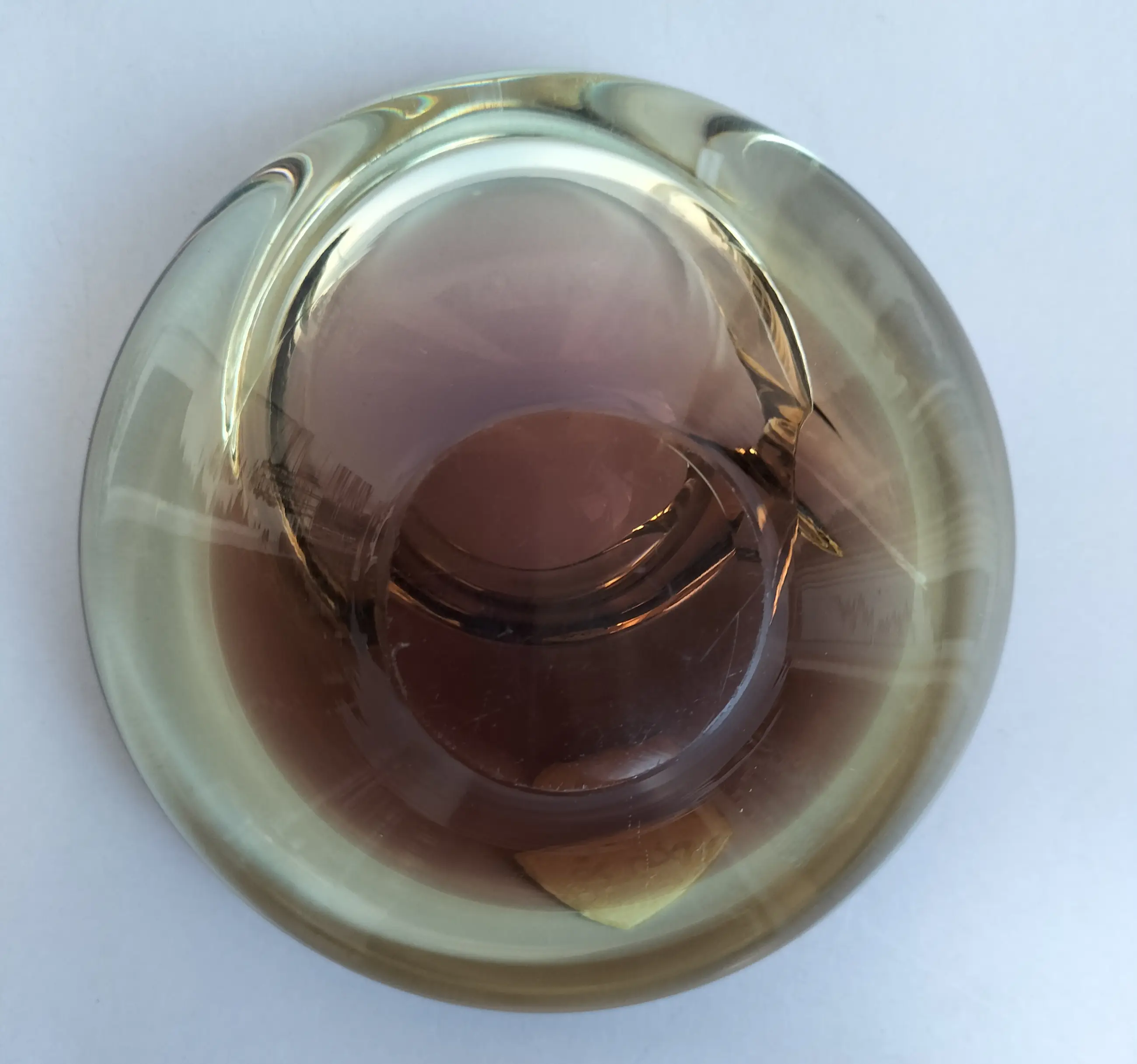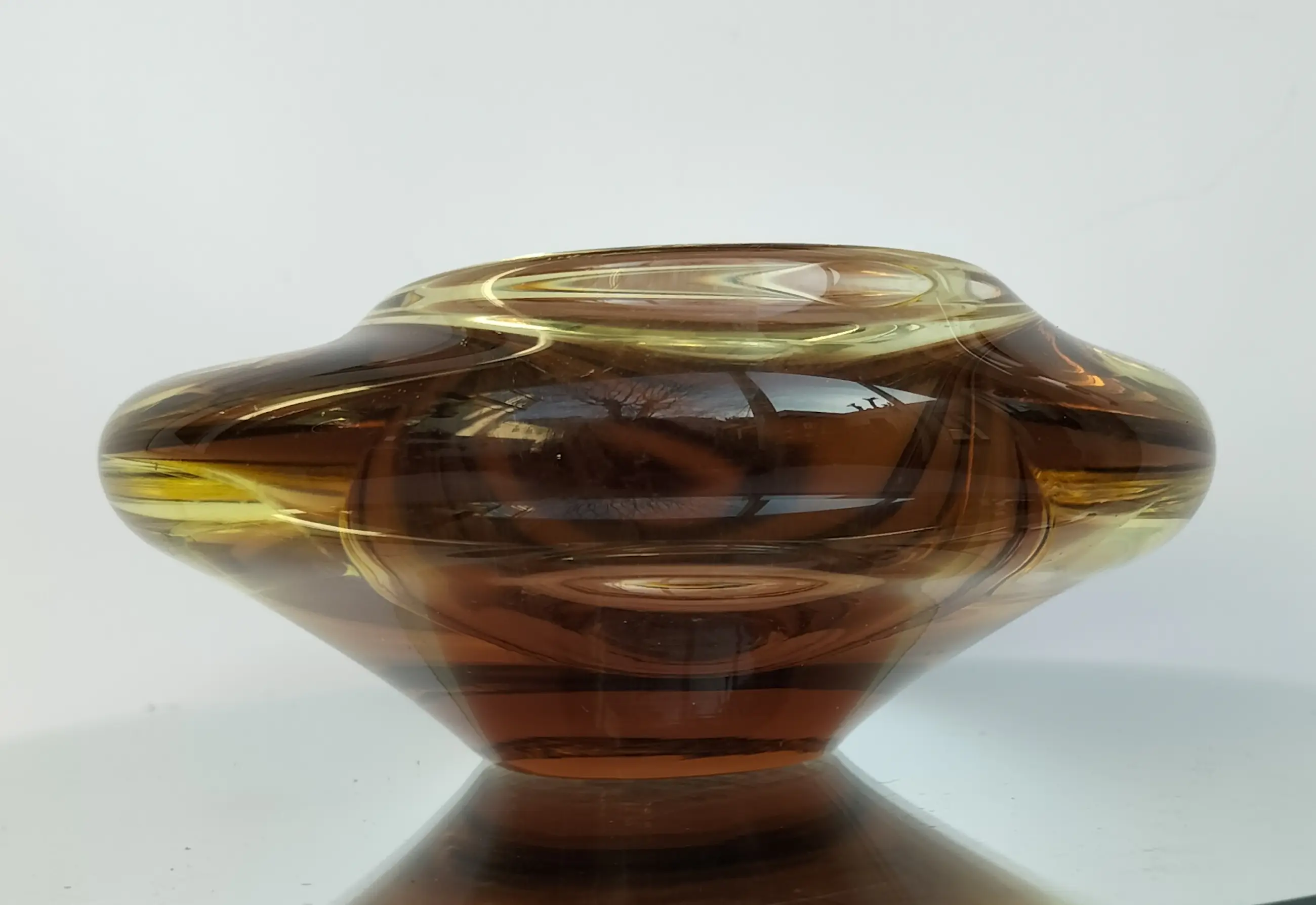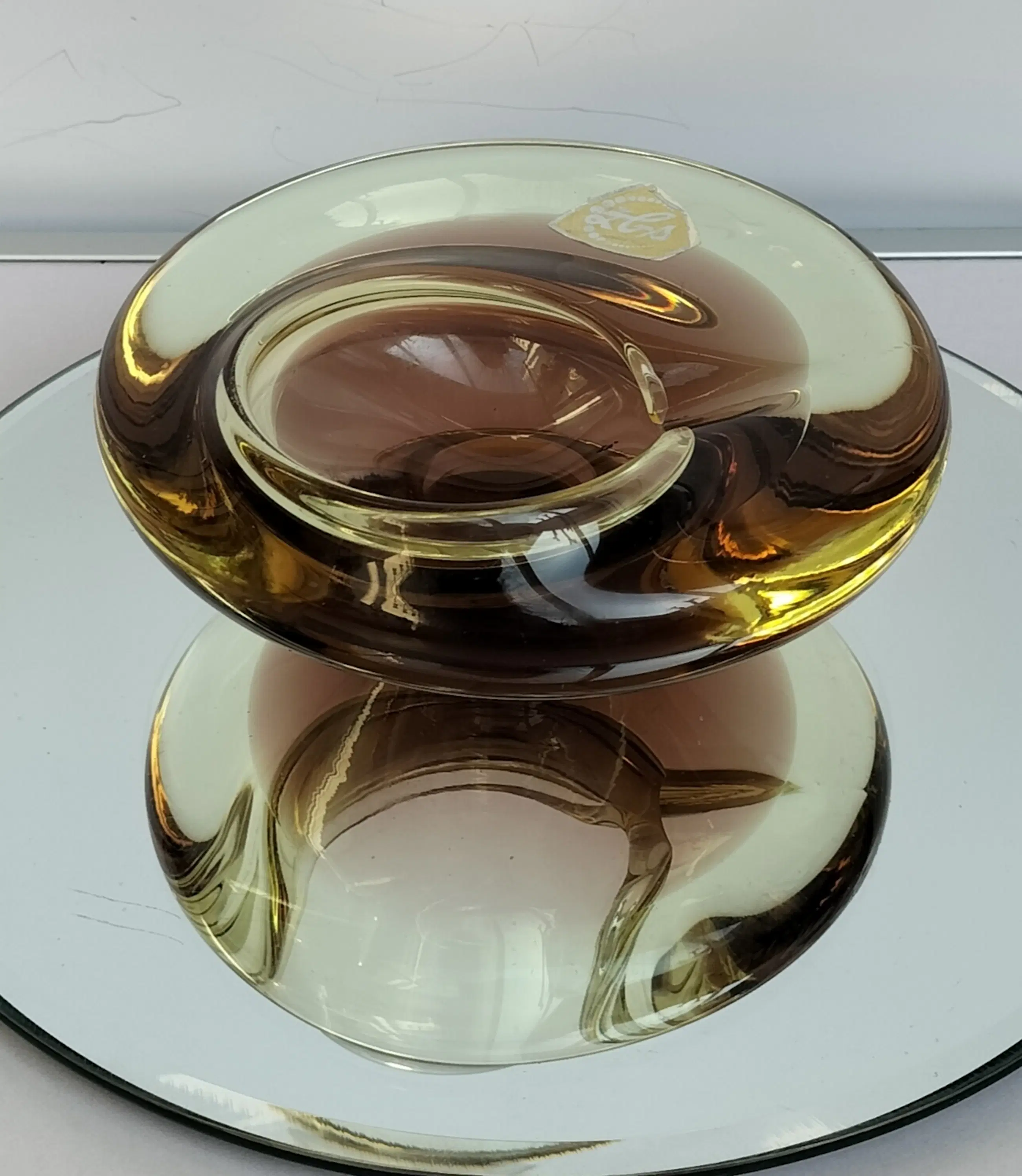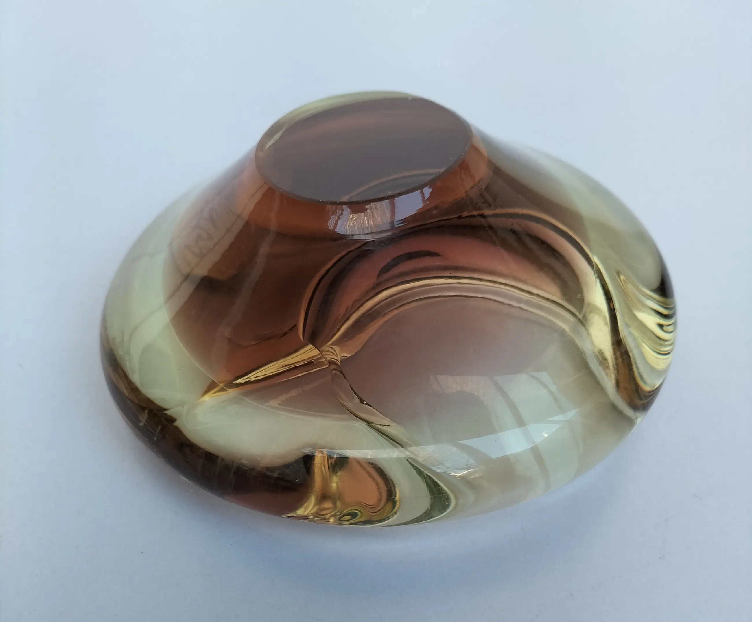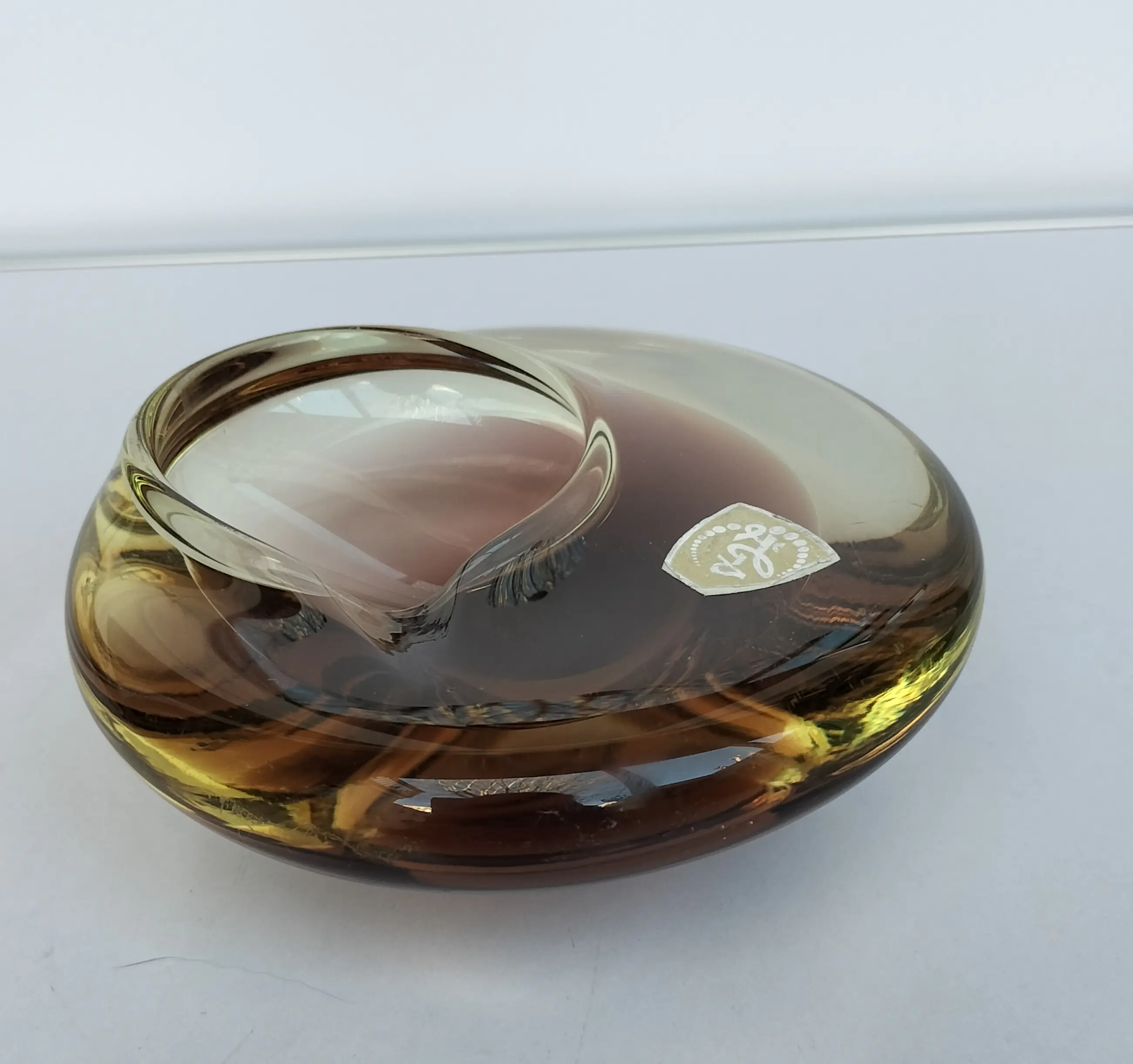 Prachtige glazen schaal uit de periode 1960-1969 van Miroslav Klinger van Zelensky Brod Sklo uit de Tsjechische Republiek. Het schaaltje heeft een aparte vorm waarbij de bovenzijde doet denken aan de vorm, zoals een asbak voor een pijp heeft.