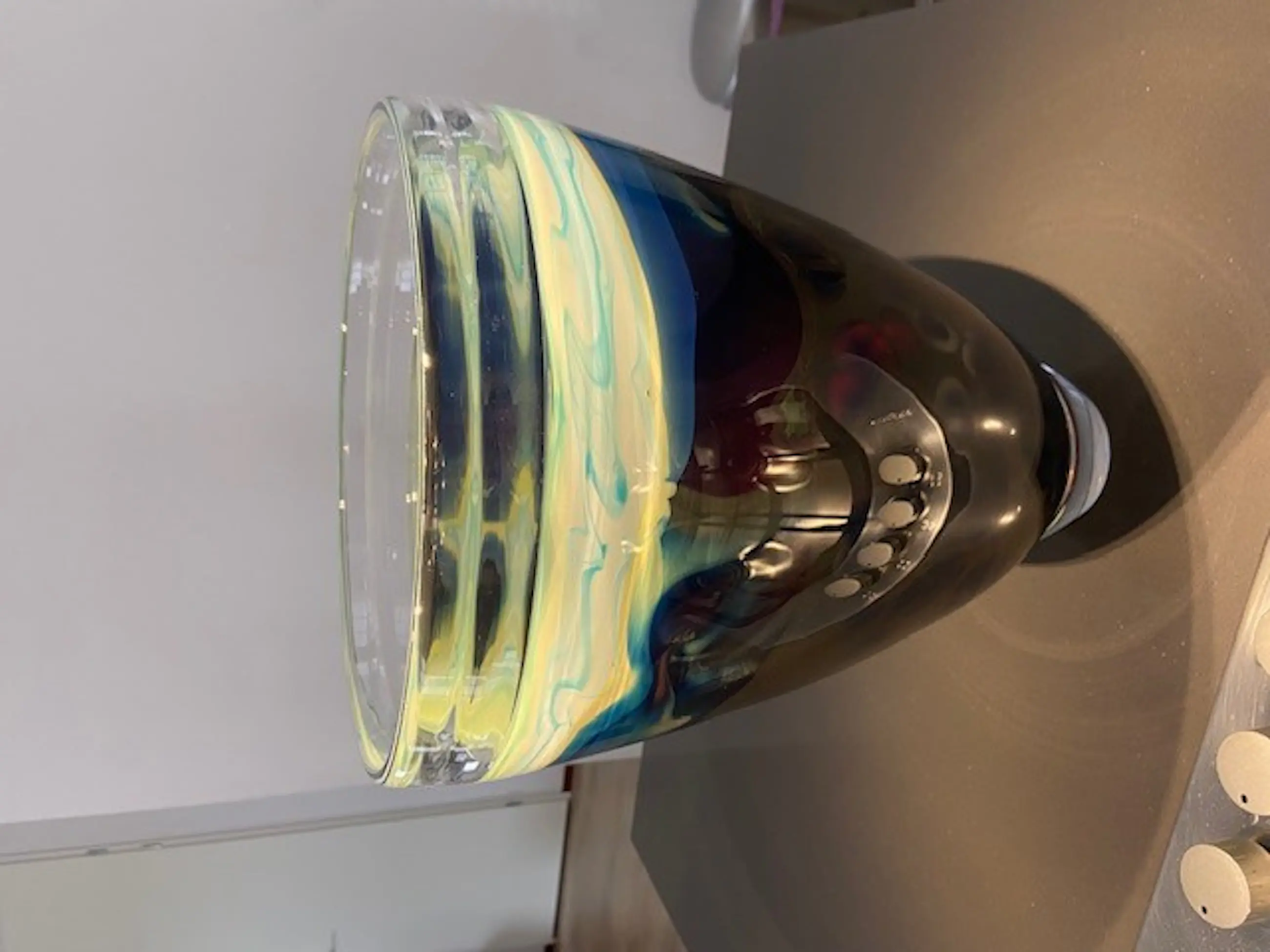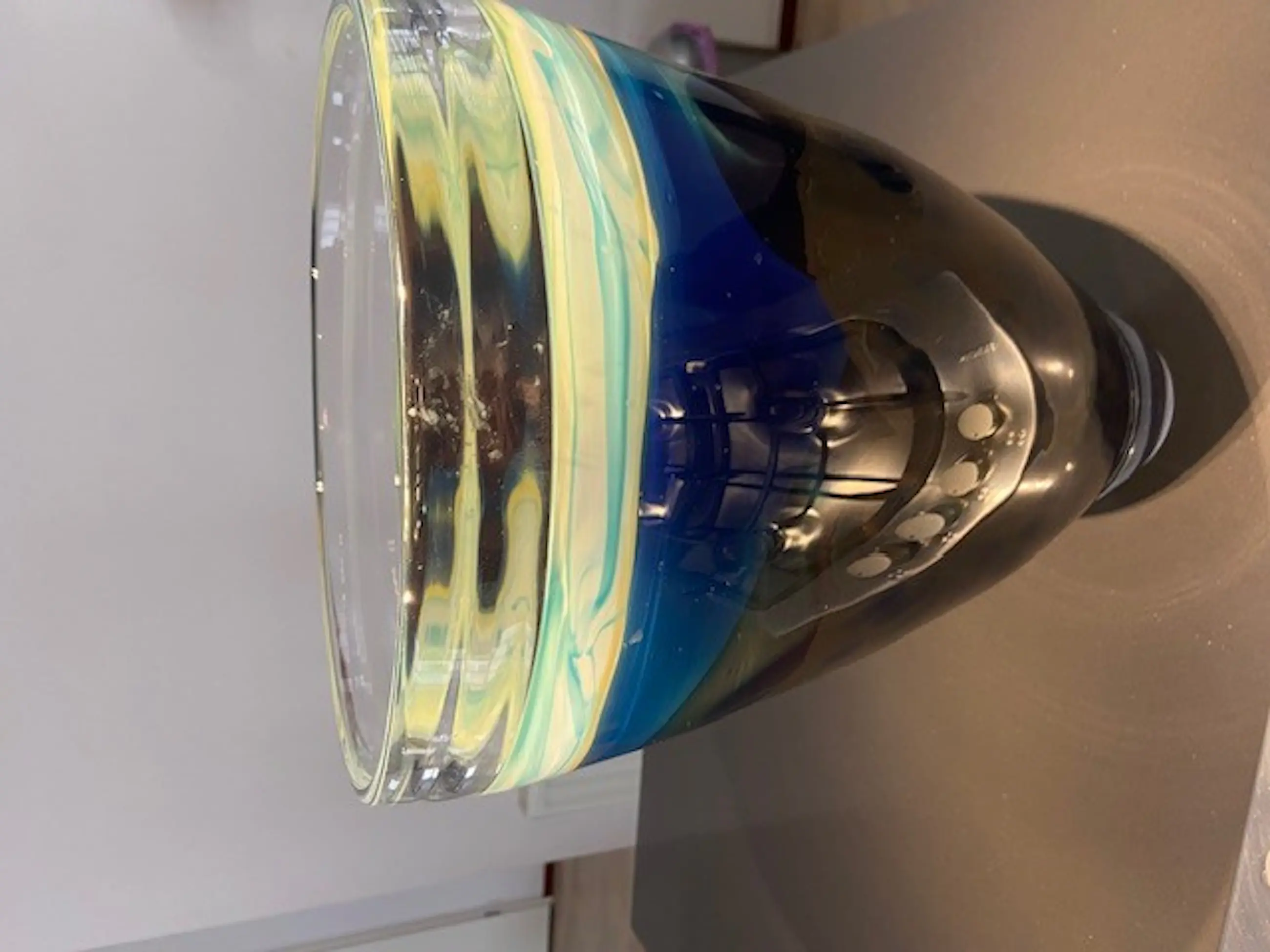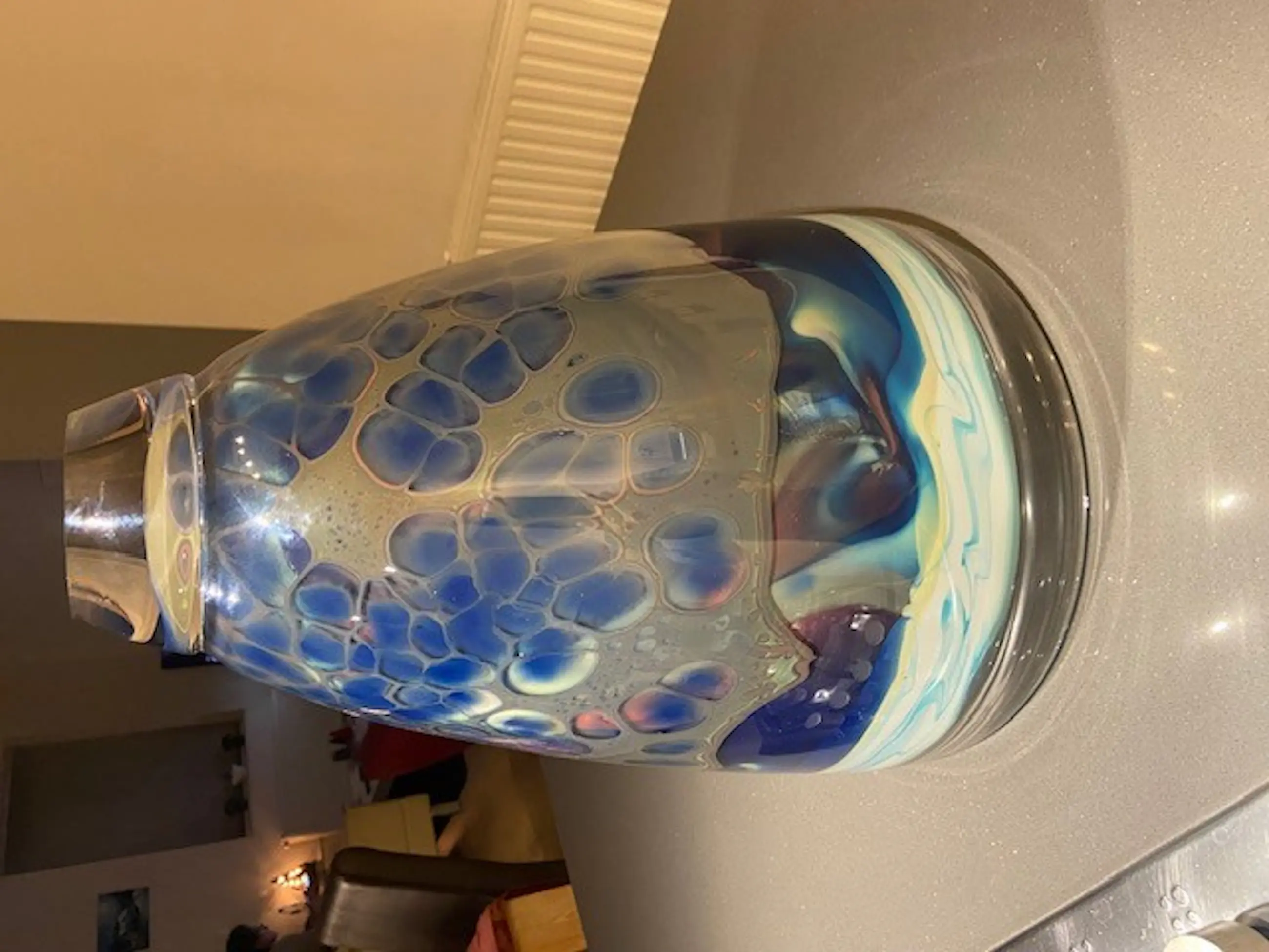Betreffende vaas (kunstglaswerk) jaren geleden als geschenk gekregen van Dhr. Misha Ignis. Dit in verband met de hulp die ik hem had geboden voor transport van zijn kunstwerken door Europa en wereldwijd.