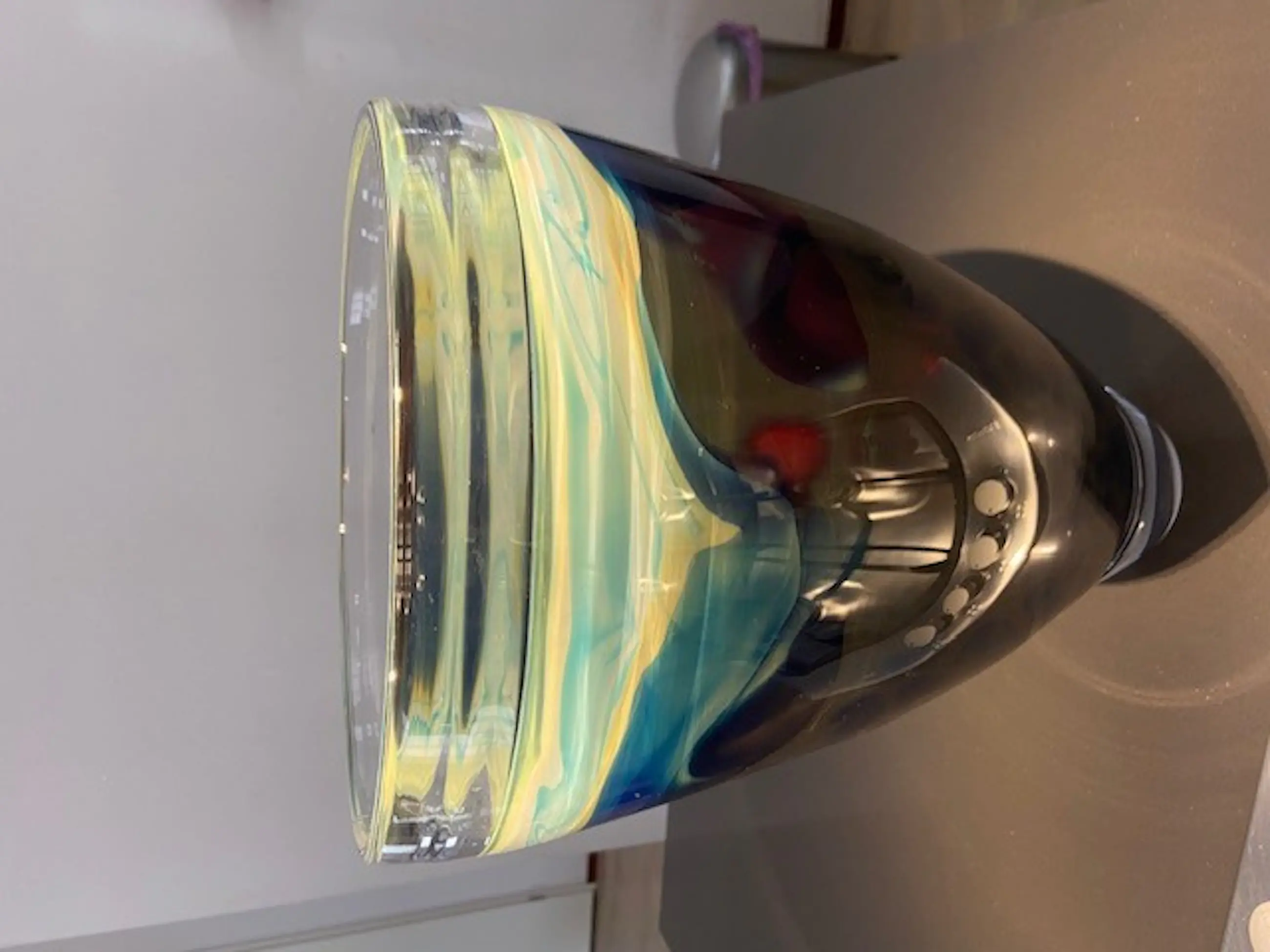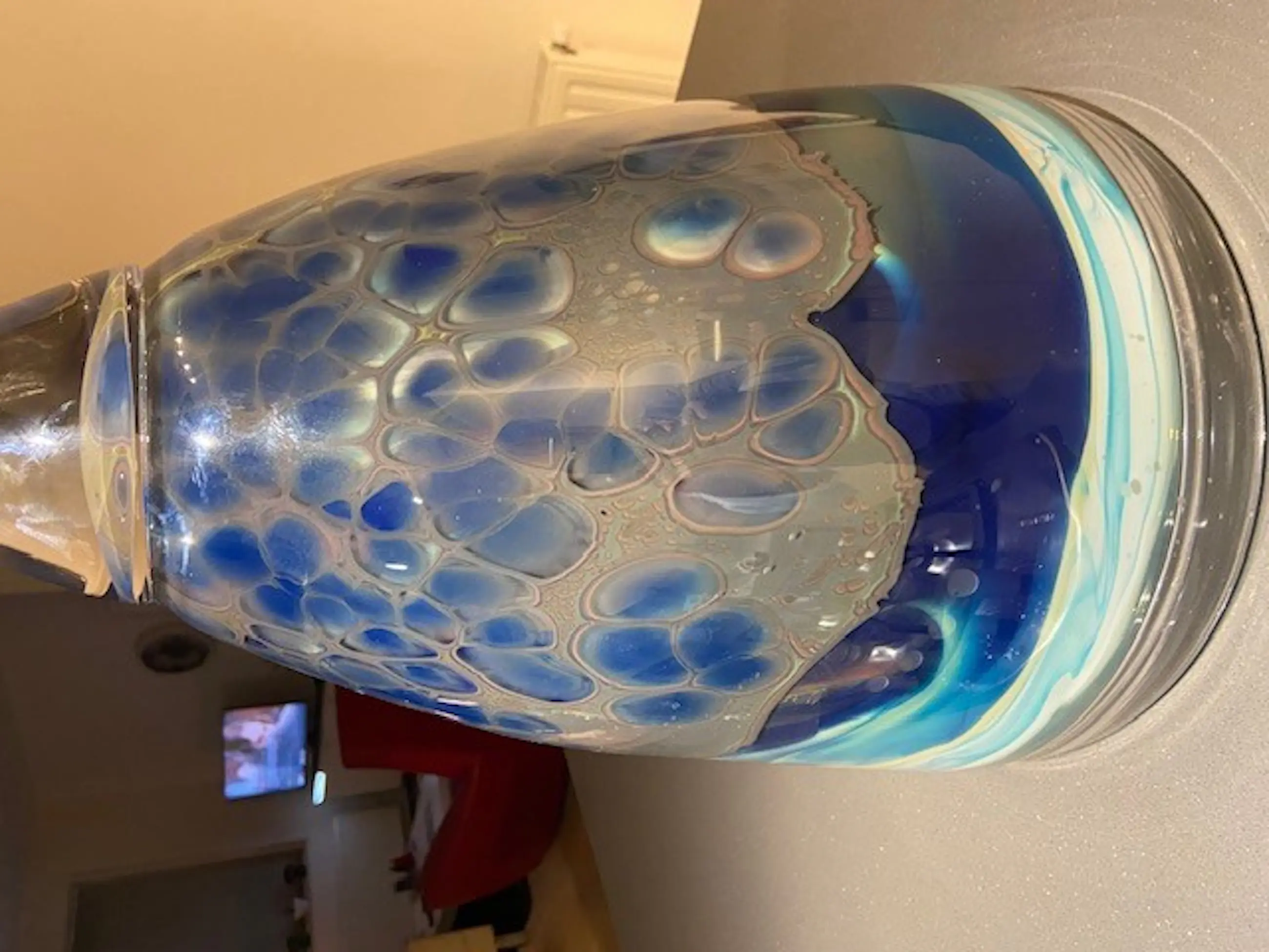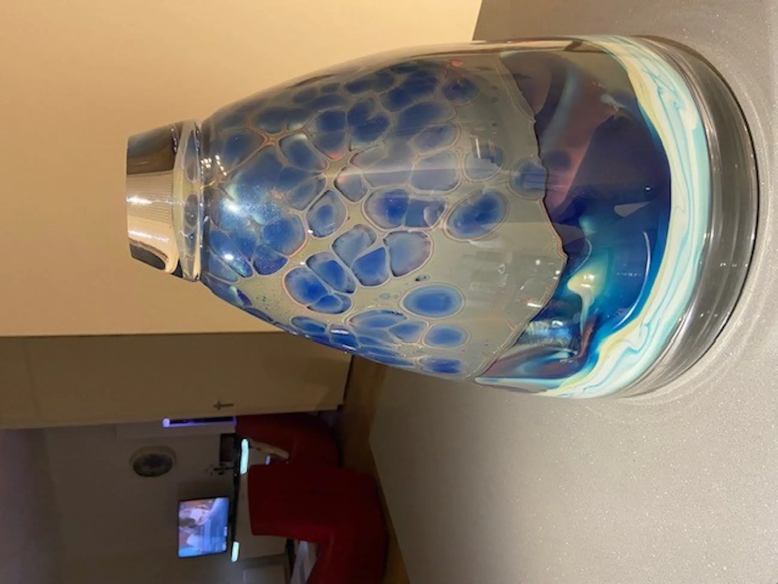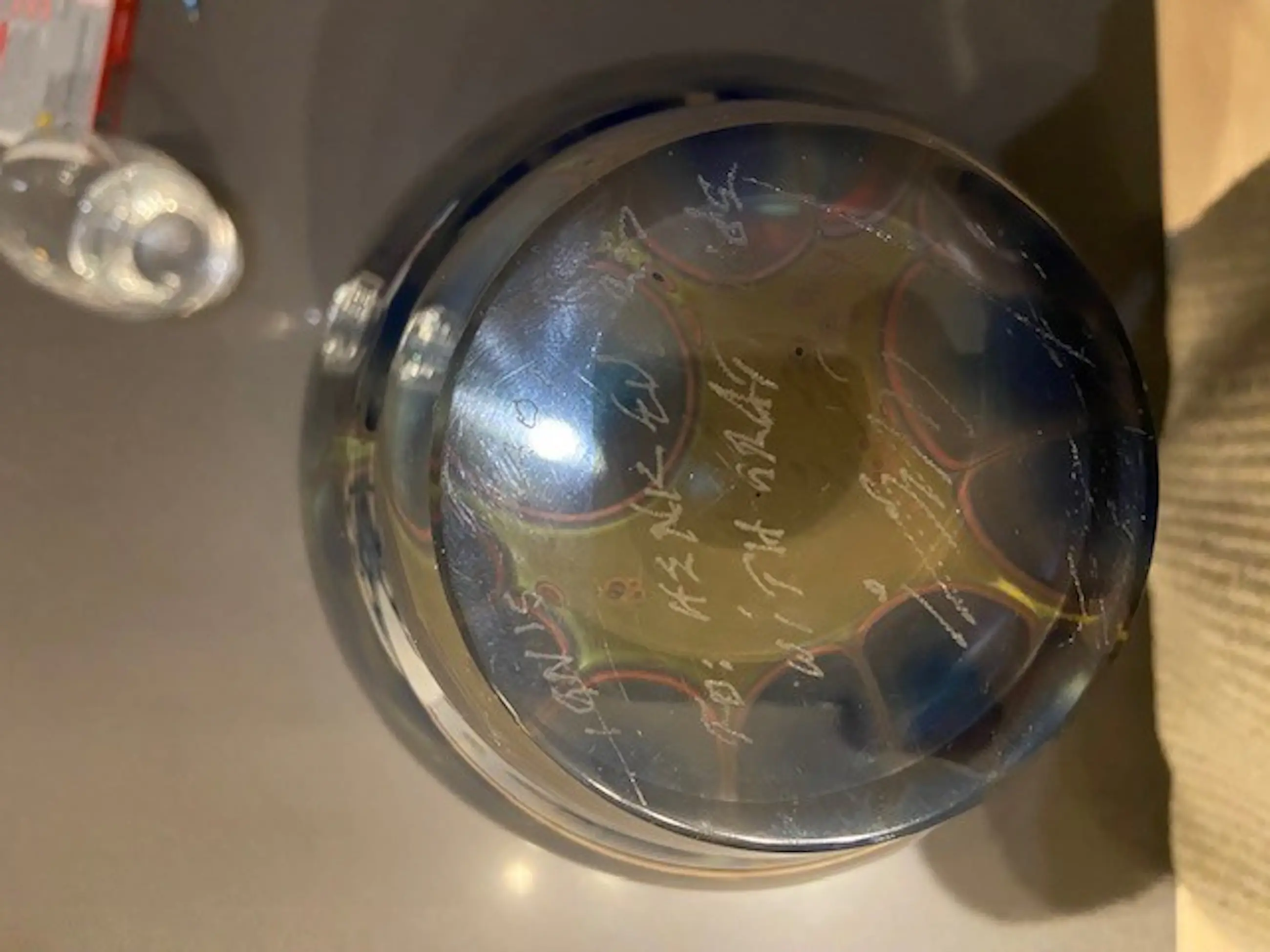 Betreffende vaas (kunstglaswerk) jaren geleden als geschenk gekregen van Dhr. Misha Ignis. Dit in verband met de hulp die ik hem had geboden voor transport van zijn kunstwerken door Europa en wereldwijd.