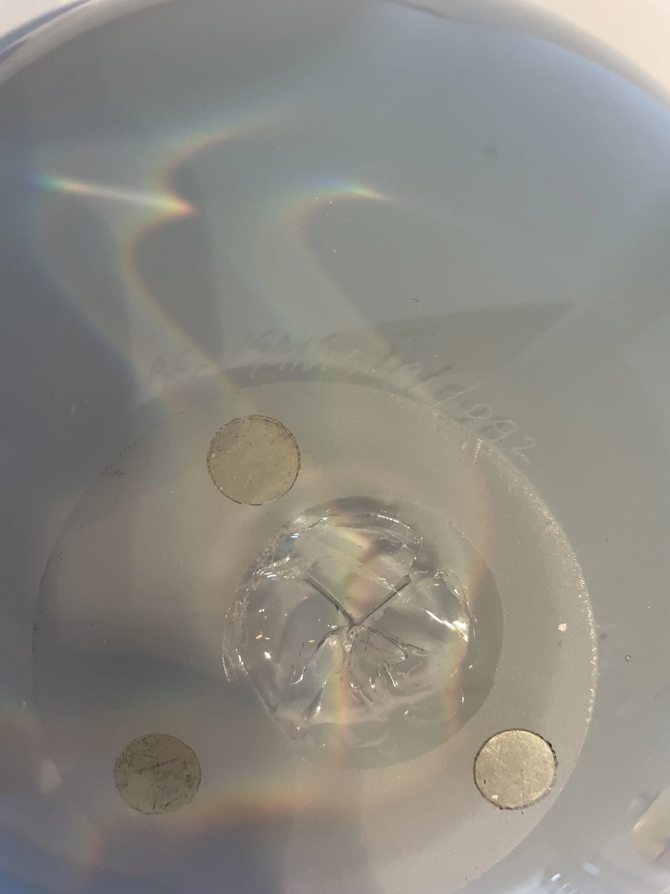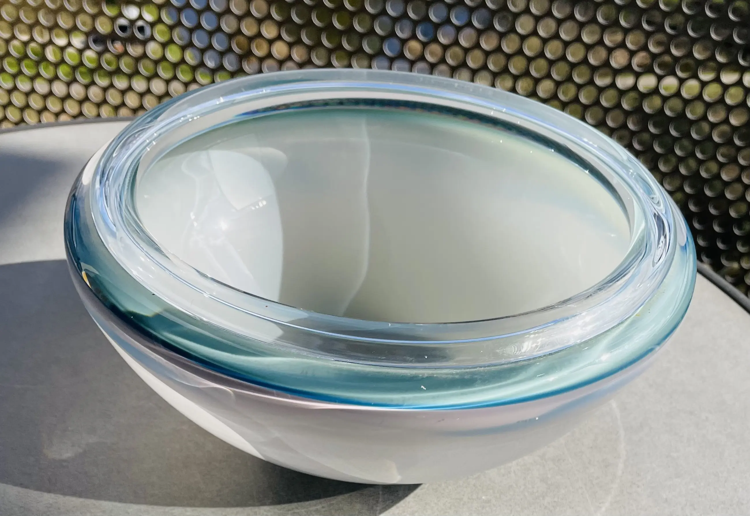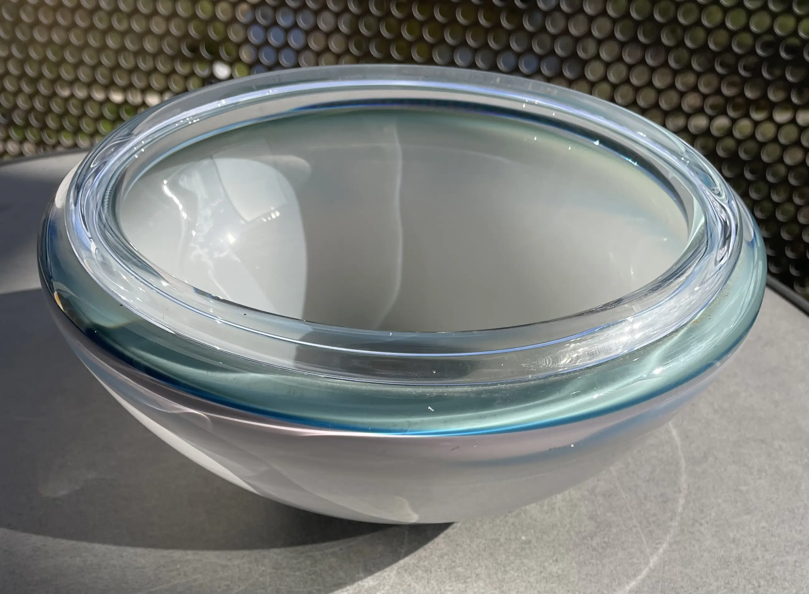 Unieke schaal van glaskunstenaar Misha Ignis. Mondgeblazen in eigen atelier. Uitgevoerd in lichtgrijs glas met een lichtblauwe, heldere rand en een spoortje lila. Verrassend anders vanuit iedere hoek. Hoog 11 cm. Diameter 235 cm. Gewicht 2 kilo. Aan de onderzijde gesigneerd met diamant stift ac Ignis 91/092 Gefotografeerd met kunstlicht en daglicht. In perfecte staat.