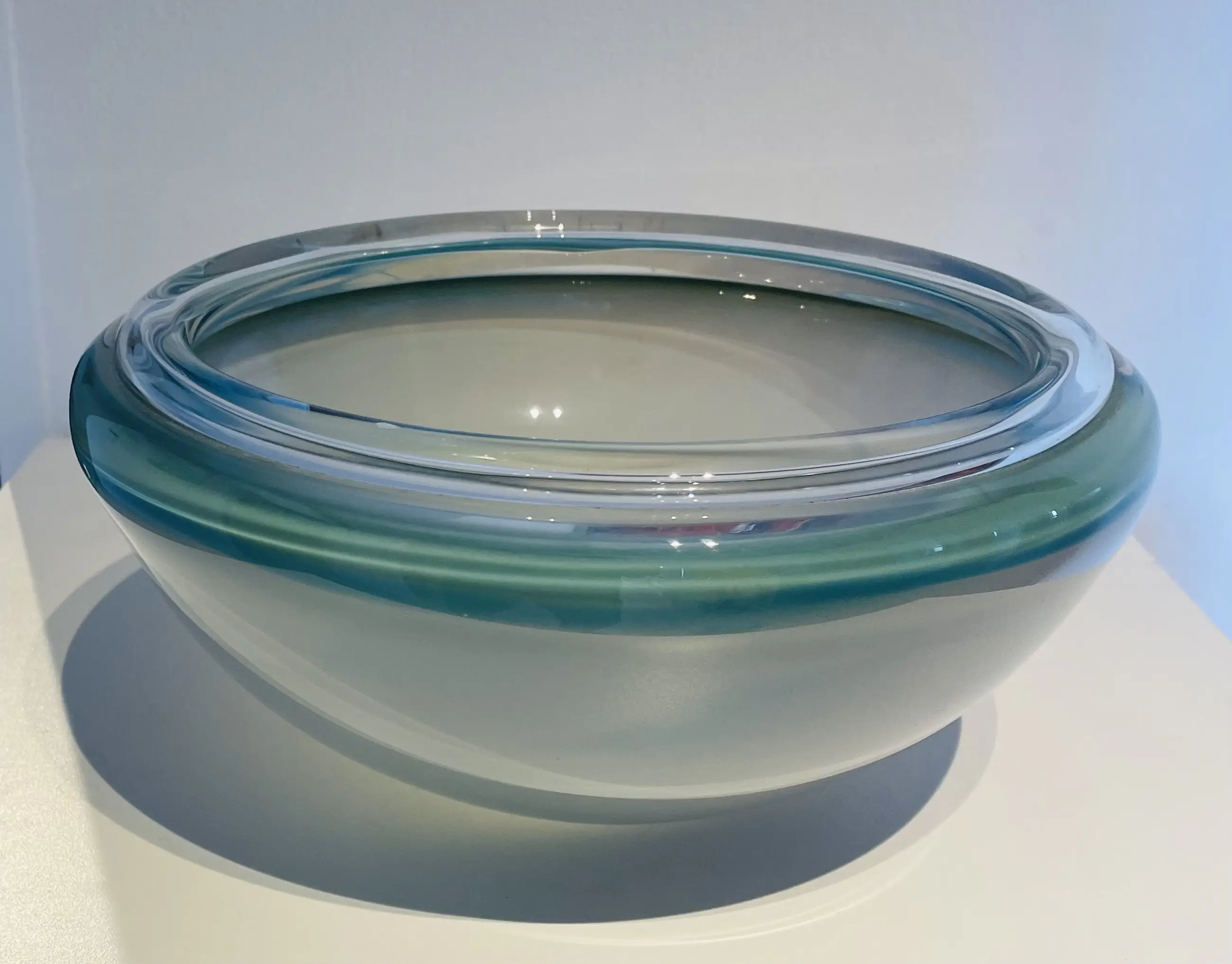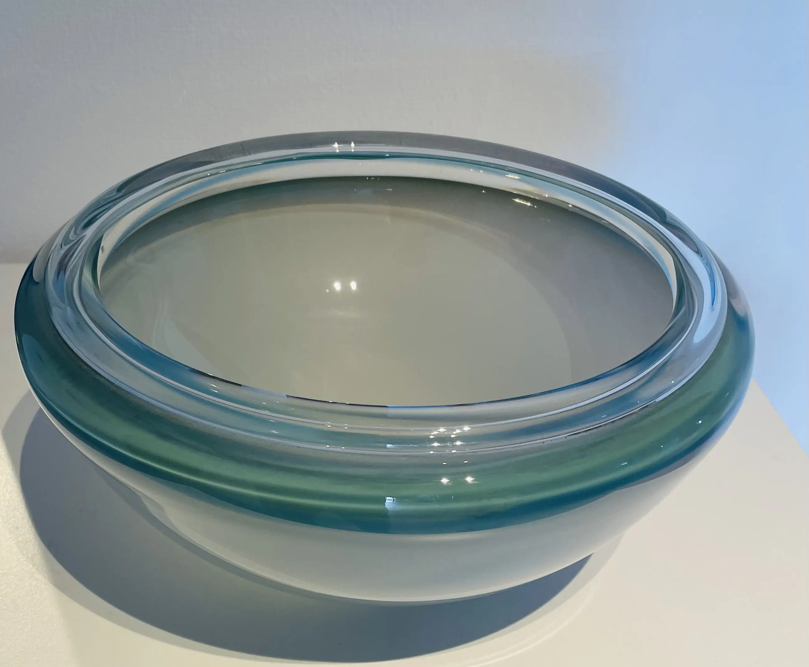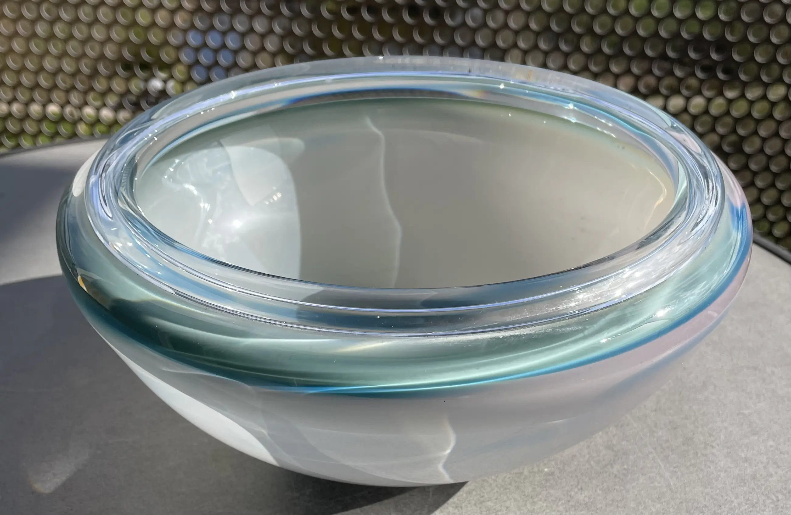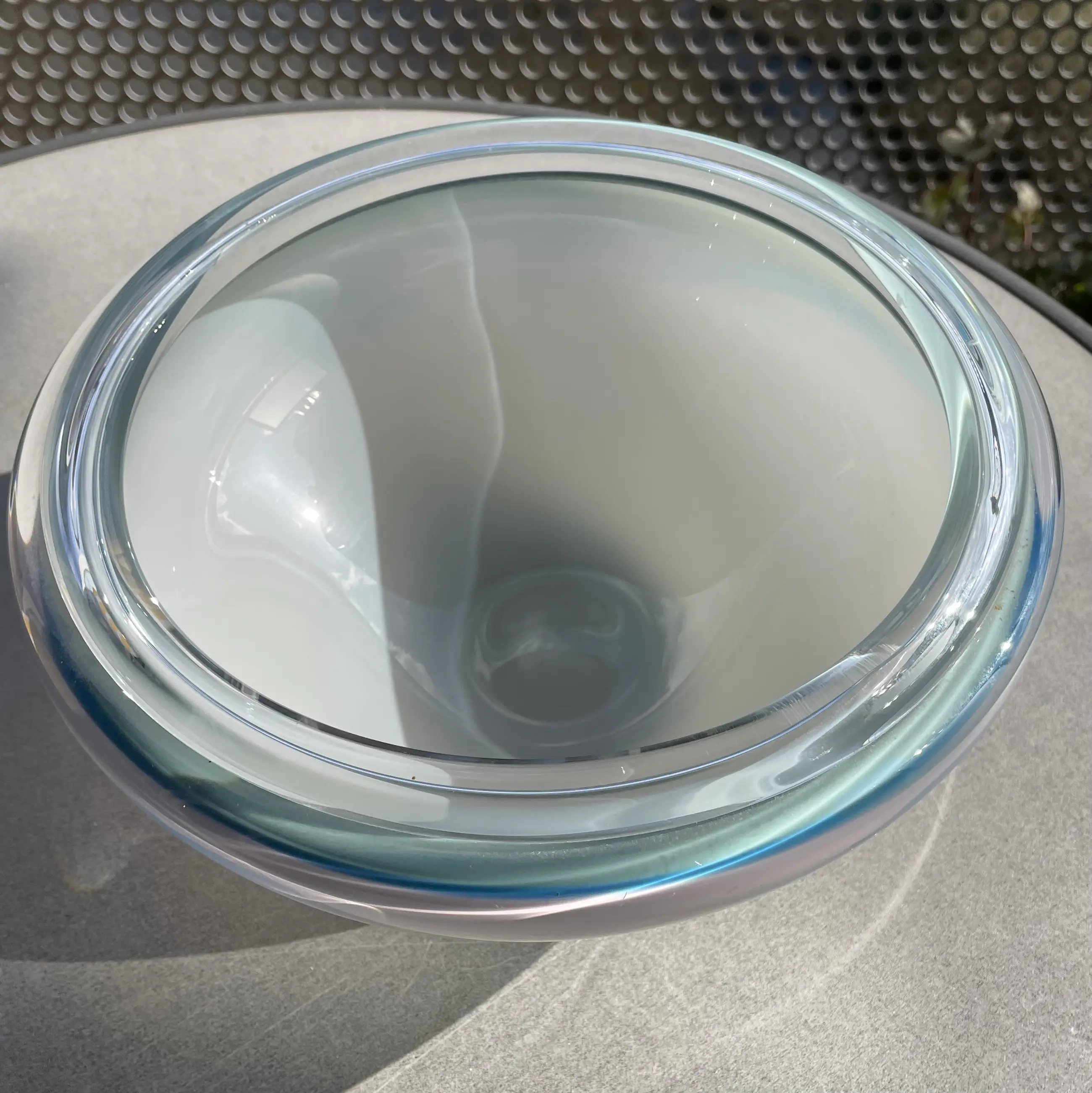 Unieke schaal van glaskunstenaar Misha Ignis. Mondgeblazen in eigen atelier. Uitgevoerd in lichtgrijs glas met een lichtblauwe, heldere rand en een spoortje lila. Verrassend anders vanuit iedere hoek. Hoog 11 cm. Diameter 235 cm. Gewicht 2 kilo. Aan de onderzijde gesigneerd met diamant stift ac Ignis 91/092 Gefotografeerd met kunstlicht en daglicht. In perfecte staat.