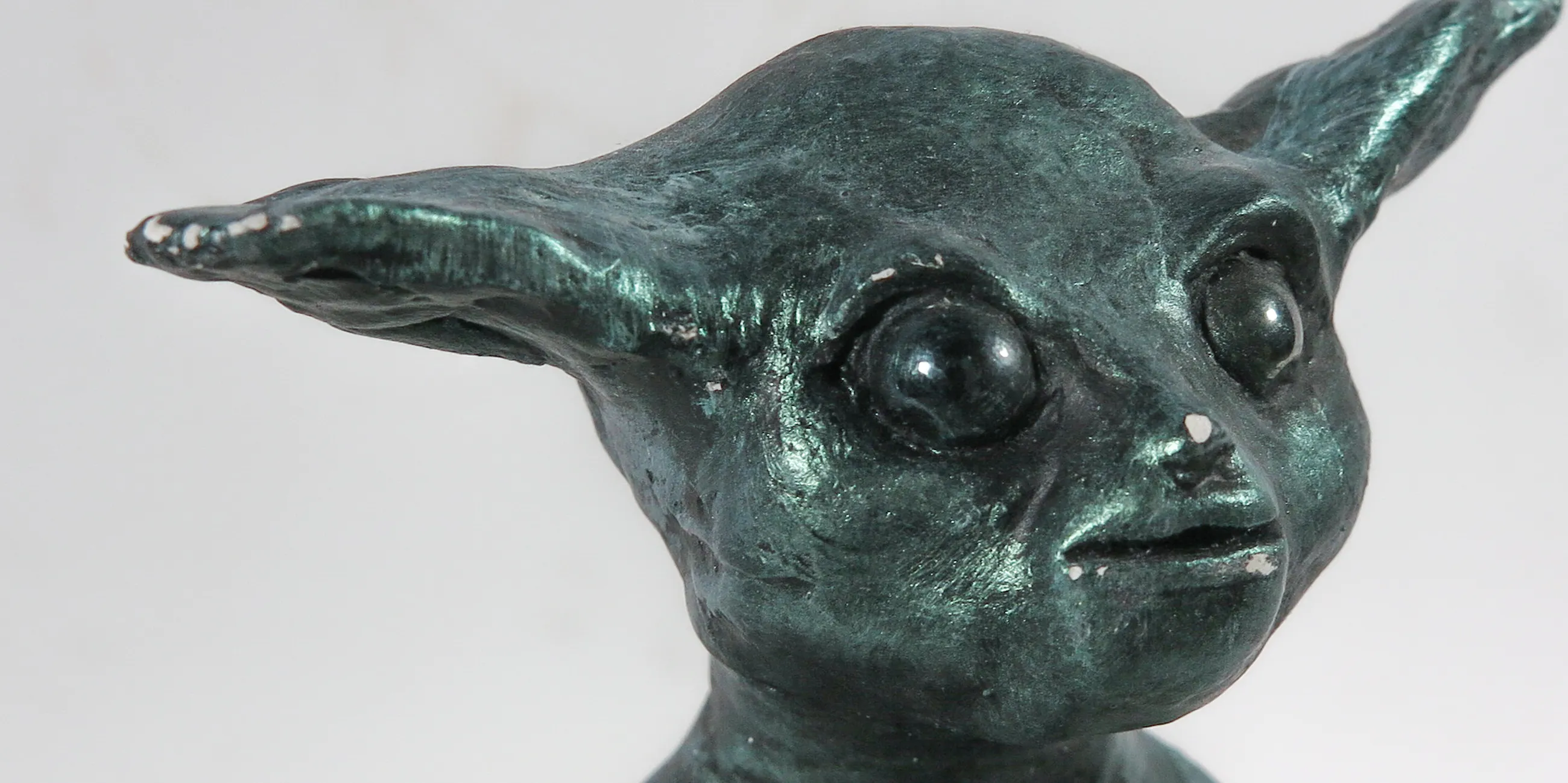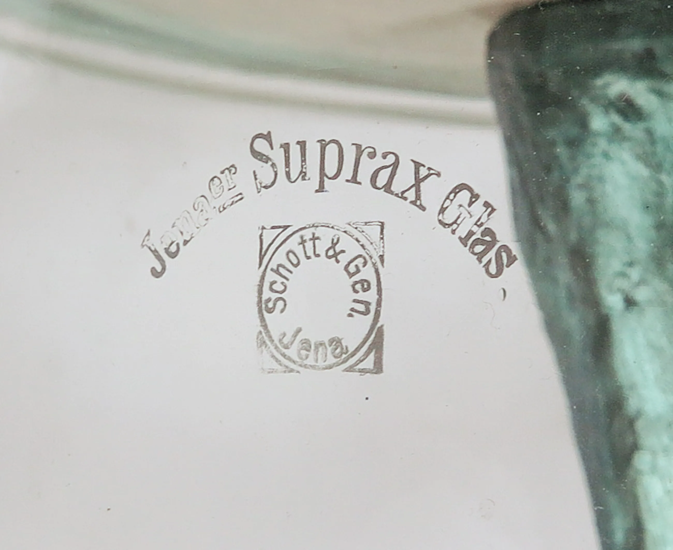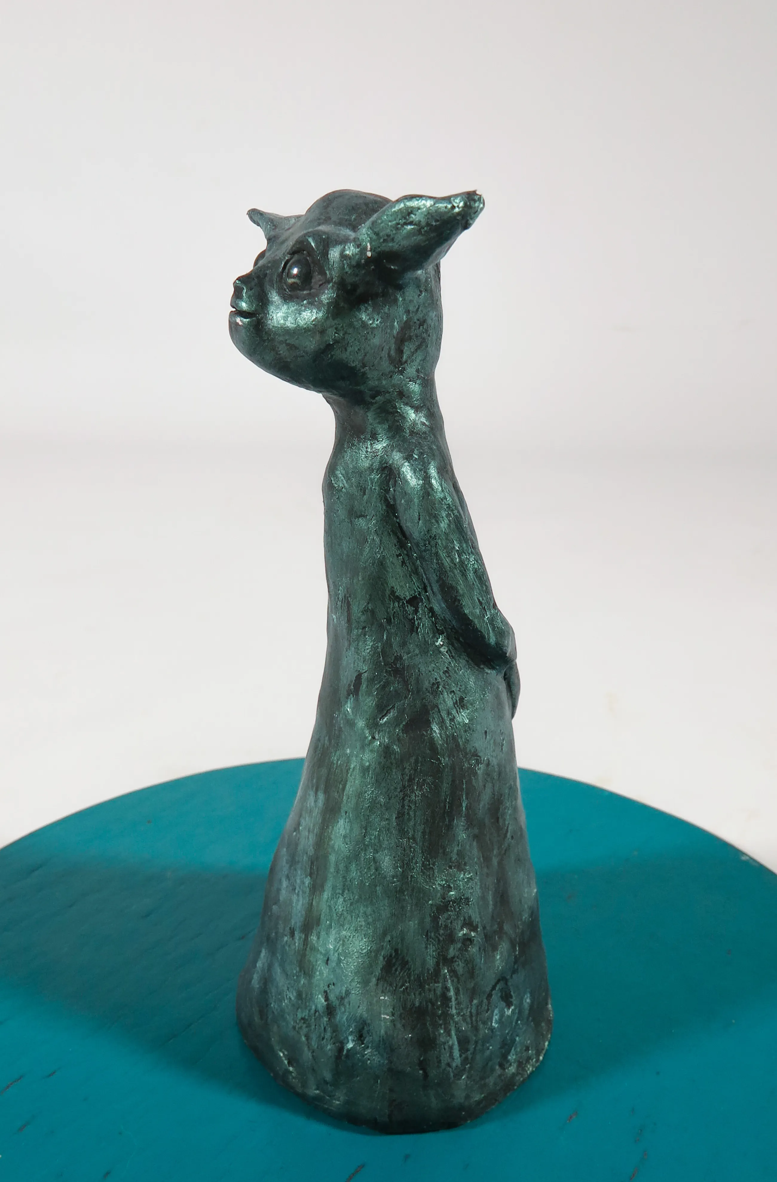 | Het figuur heeft enkele beschadigingen, waaronder aan de oren, neus en langs de onderste rand.De stolp is vuil en heeft enkele plekjes en chips langs de rand. | |