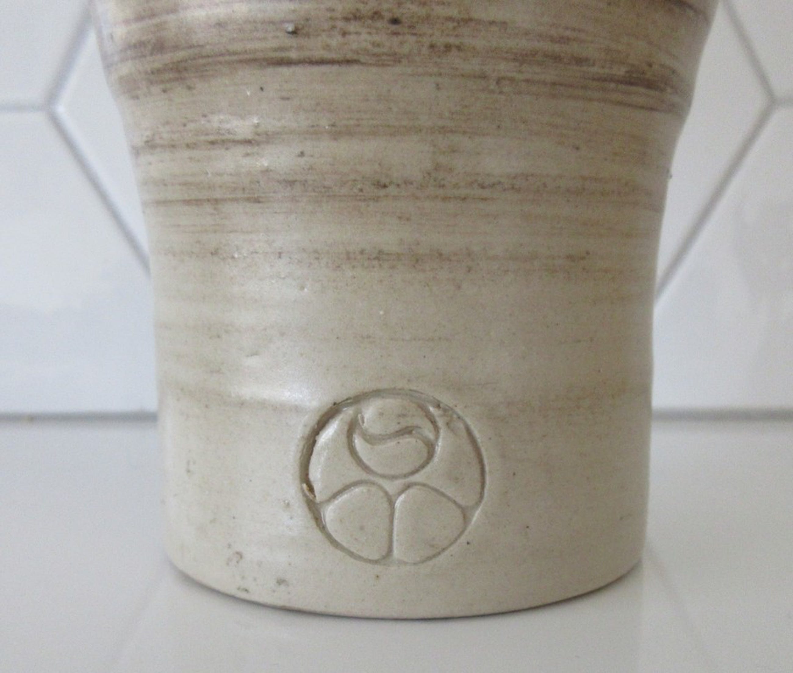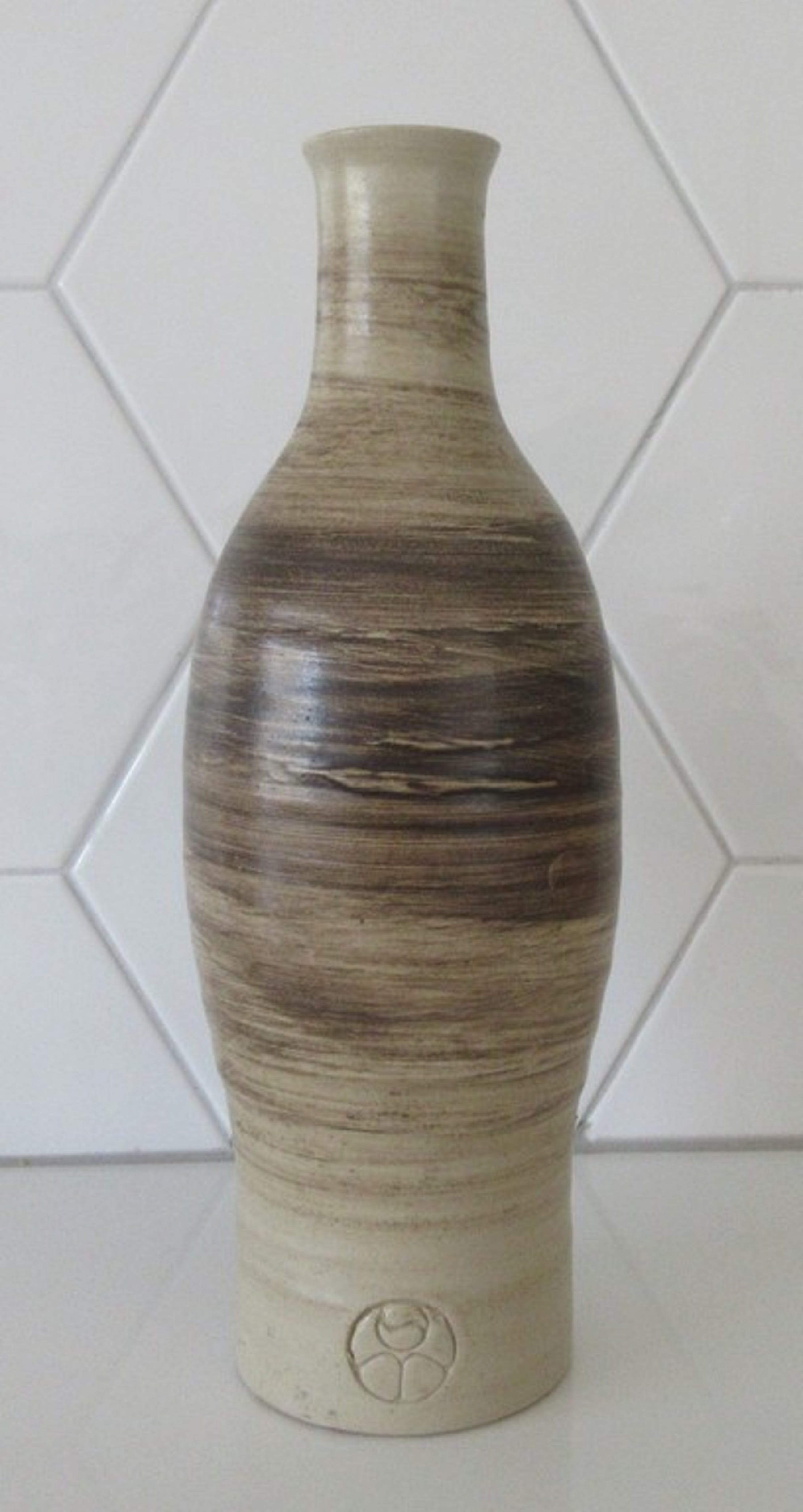 Grote relatief moderne flesvaas met zandkleurig glazuur en grijs soort aardeachtige decoratie en een ingesneden decoratie van een zittend figuur. In prima onbeschadigde conditie voorzien van ingedrukt blindmerk gebruikt vanaf 1980.
