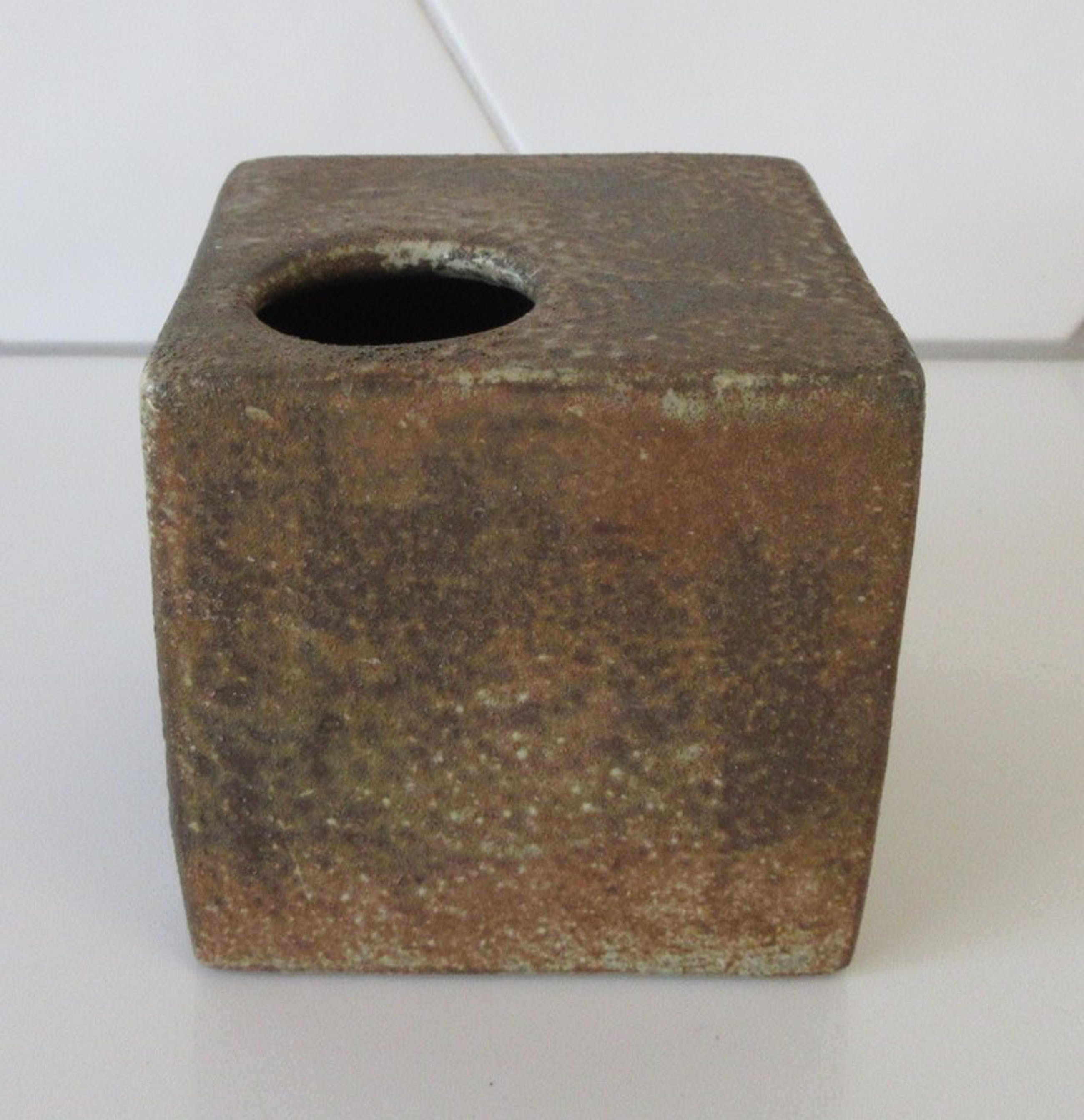 Brons en roestkleurig blok of Ikebana vaasje. In prima onbeschadigde conditie. Gemerkt met een sticker (zeldzaam) aan de onderzijde.