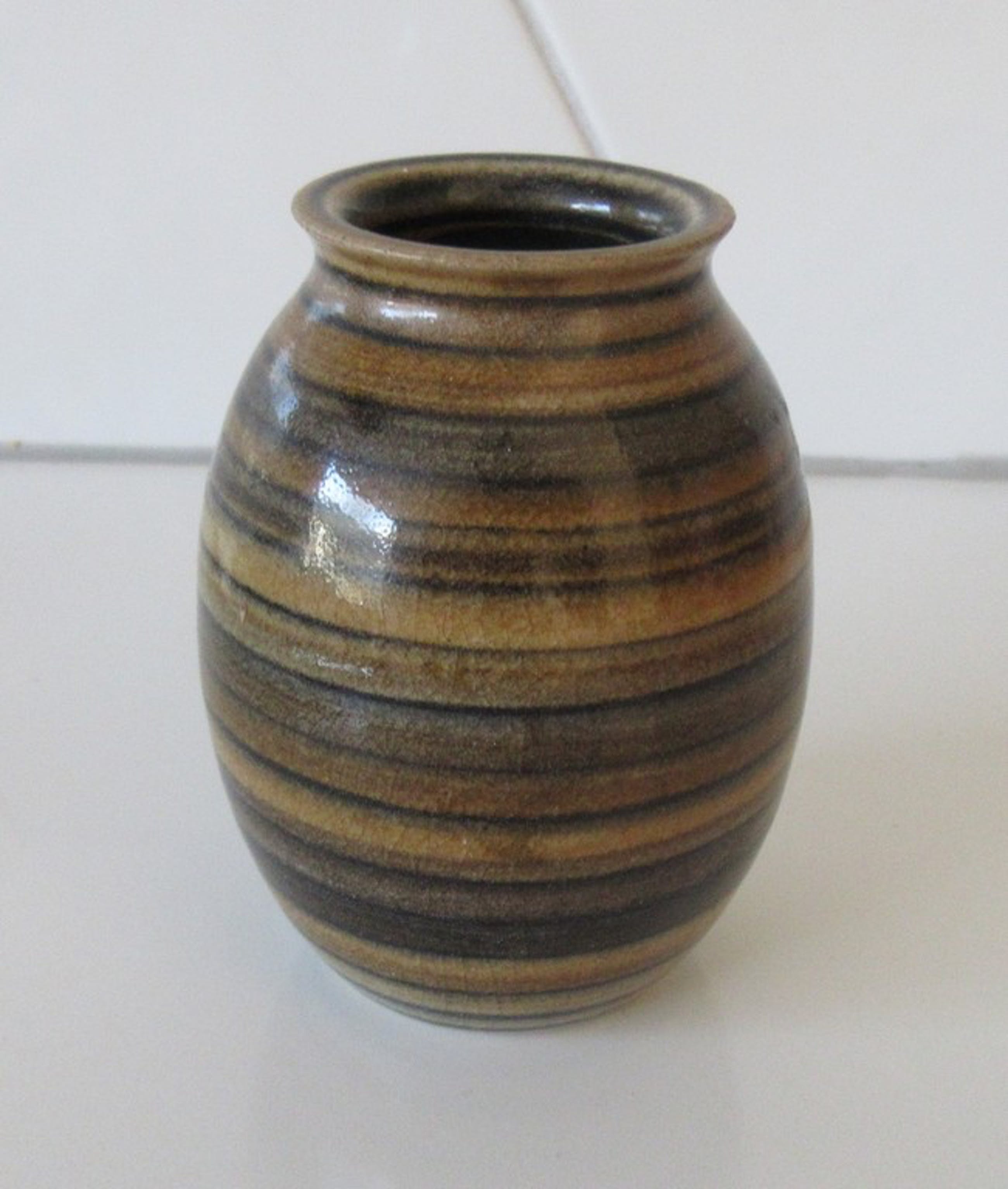 Klein regenboog vaasje ontworpen door Joke Stroes. Heeft een chipje op de bovenrand. Aan de onderzijde voorzien van ingedrukt blindmerk en het monogram/signatuur van Joke Stroes.