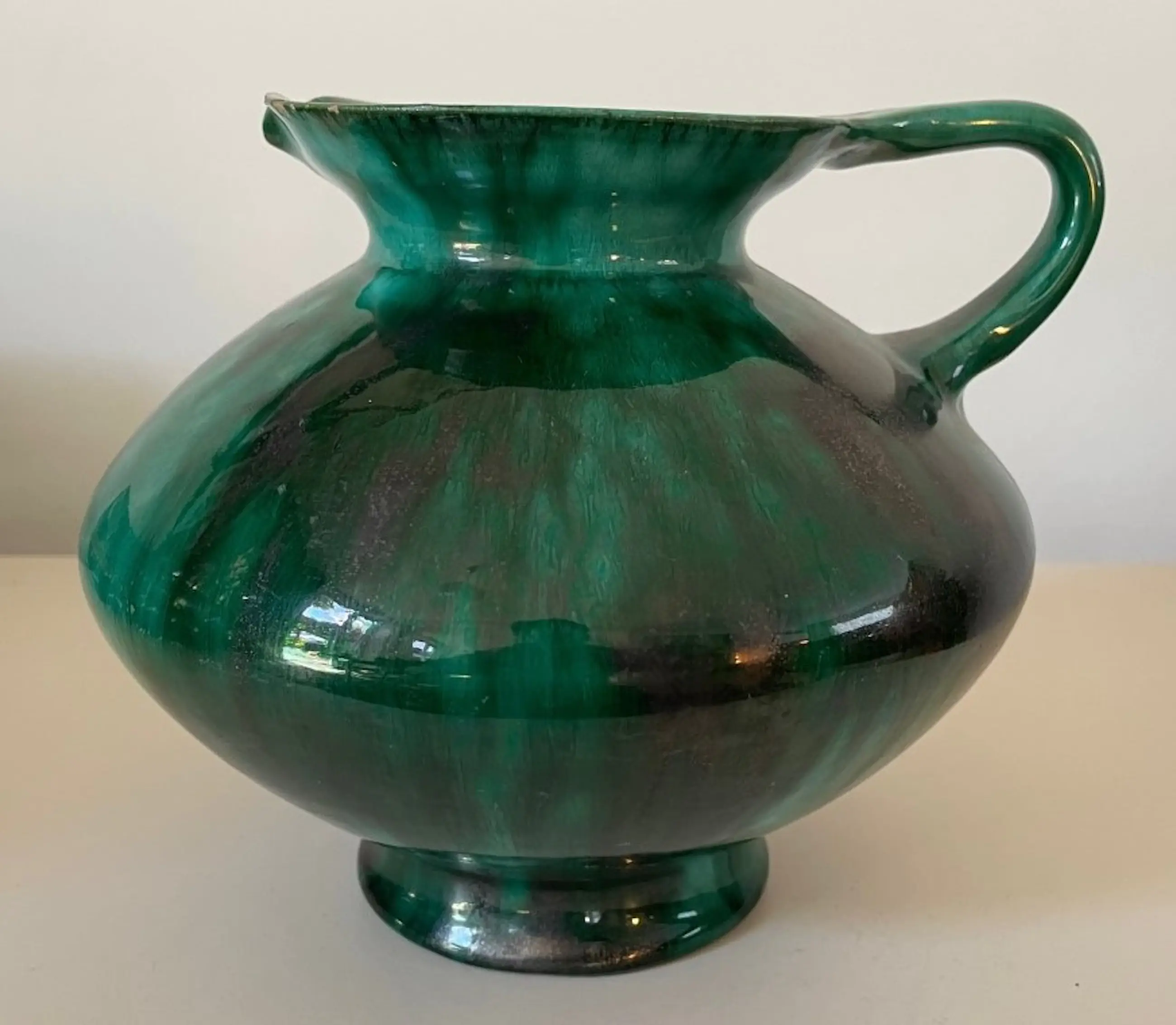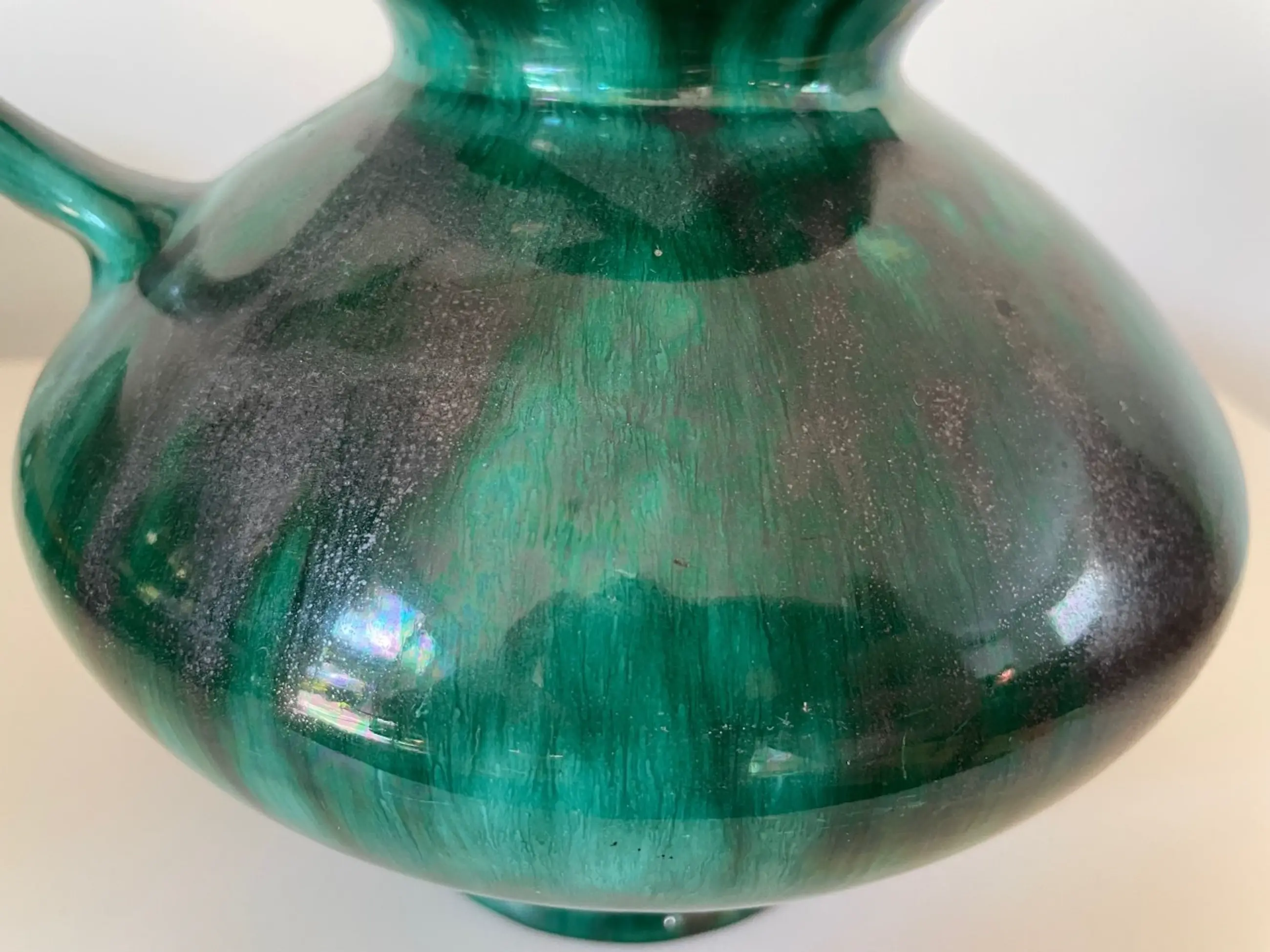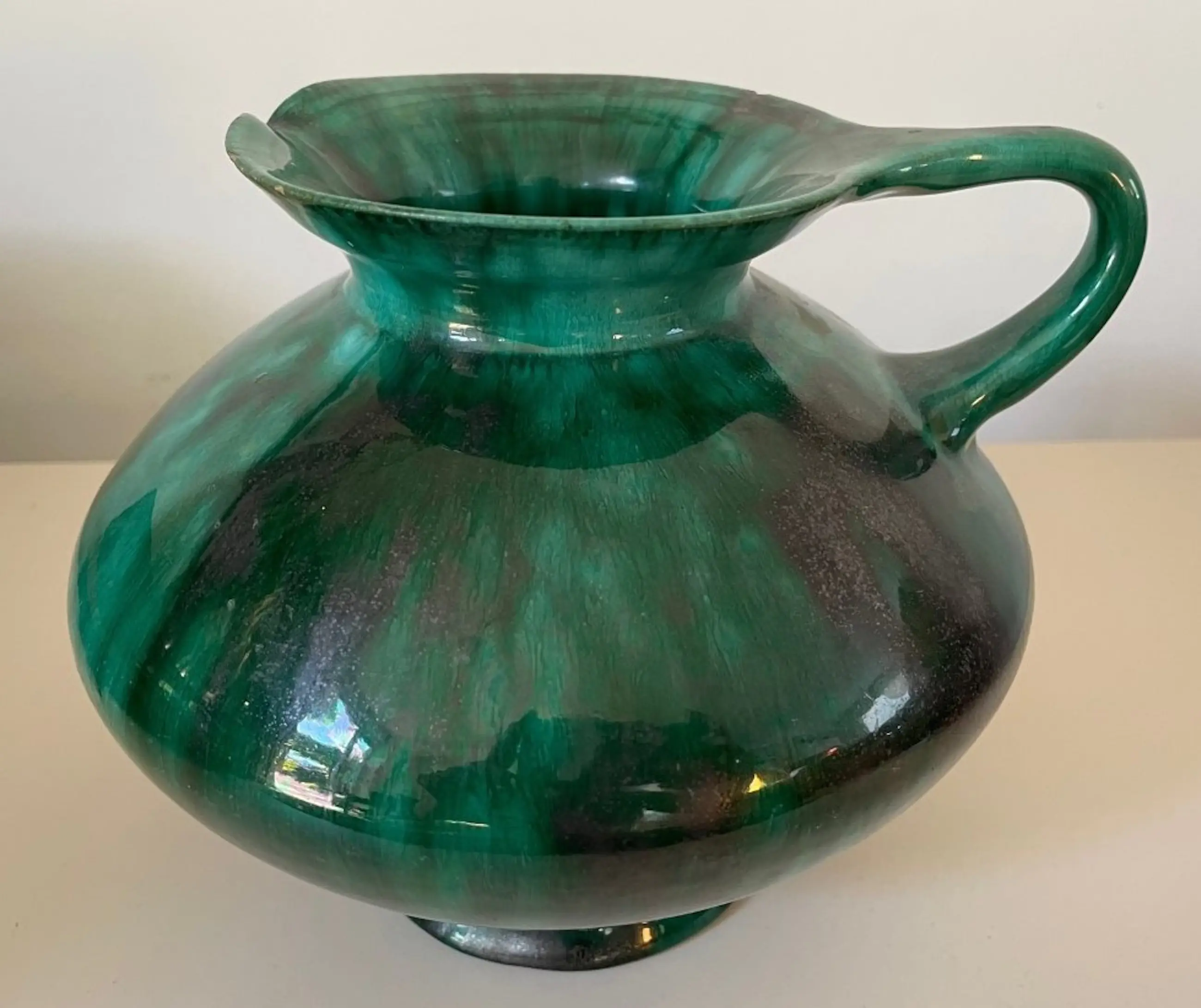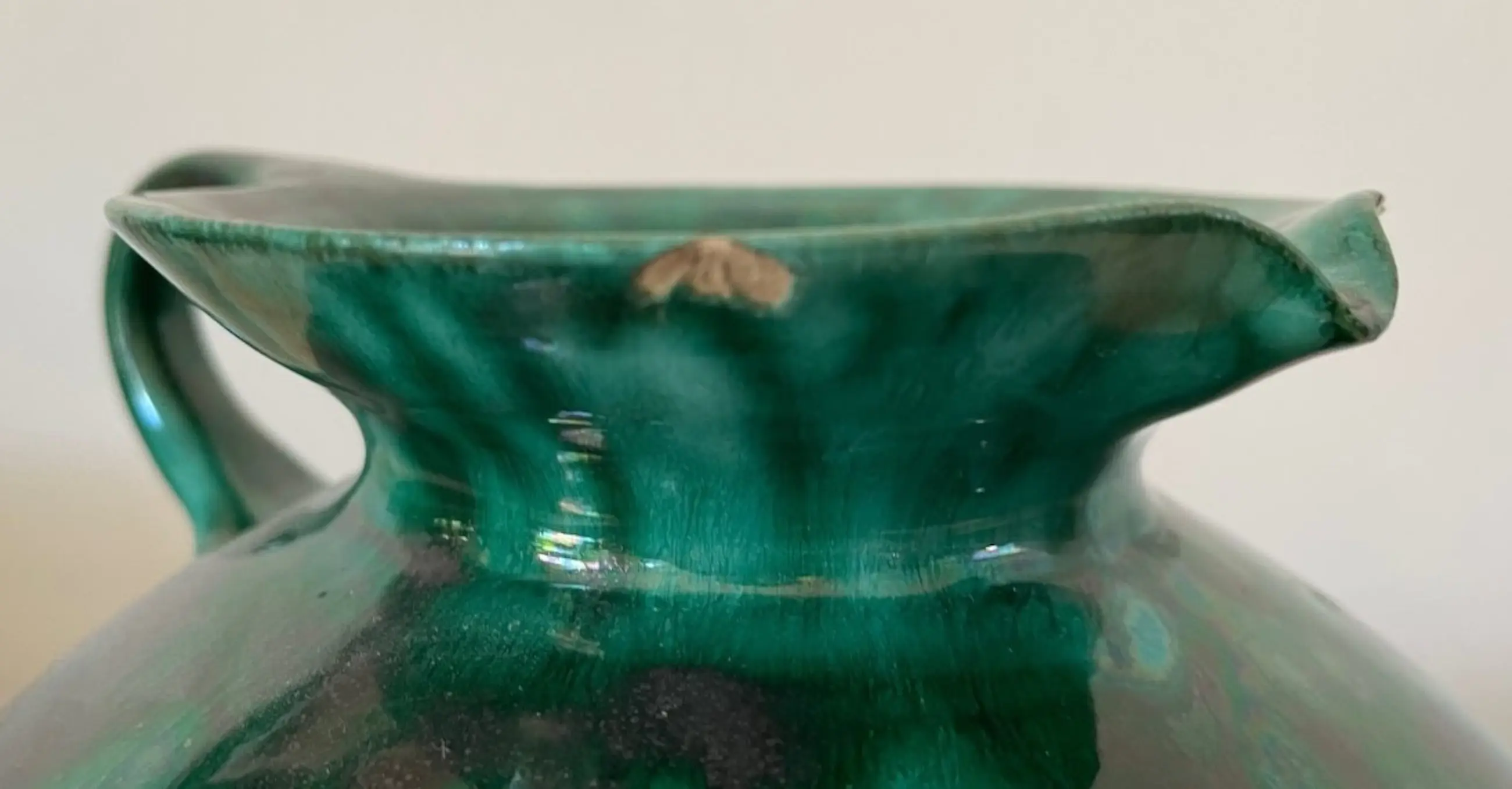 Kamo kan met oor model 252 uitgevoerd in groen zwart stroomglazuur (a la Eskaf). De kan heeft aan de bovenrand verschillende chipjes. Hand gesigneerd aan de onderzijde.