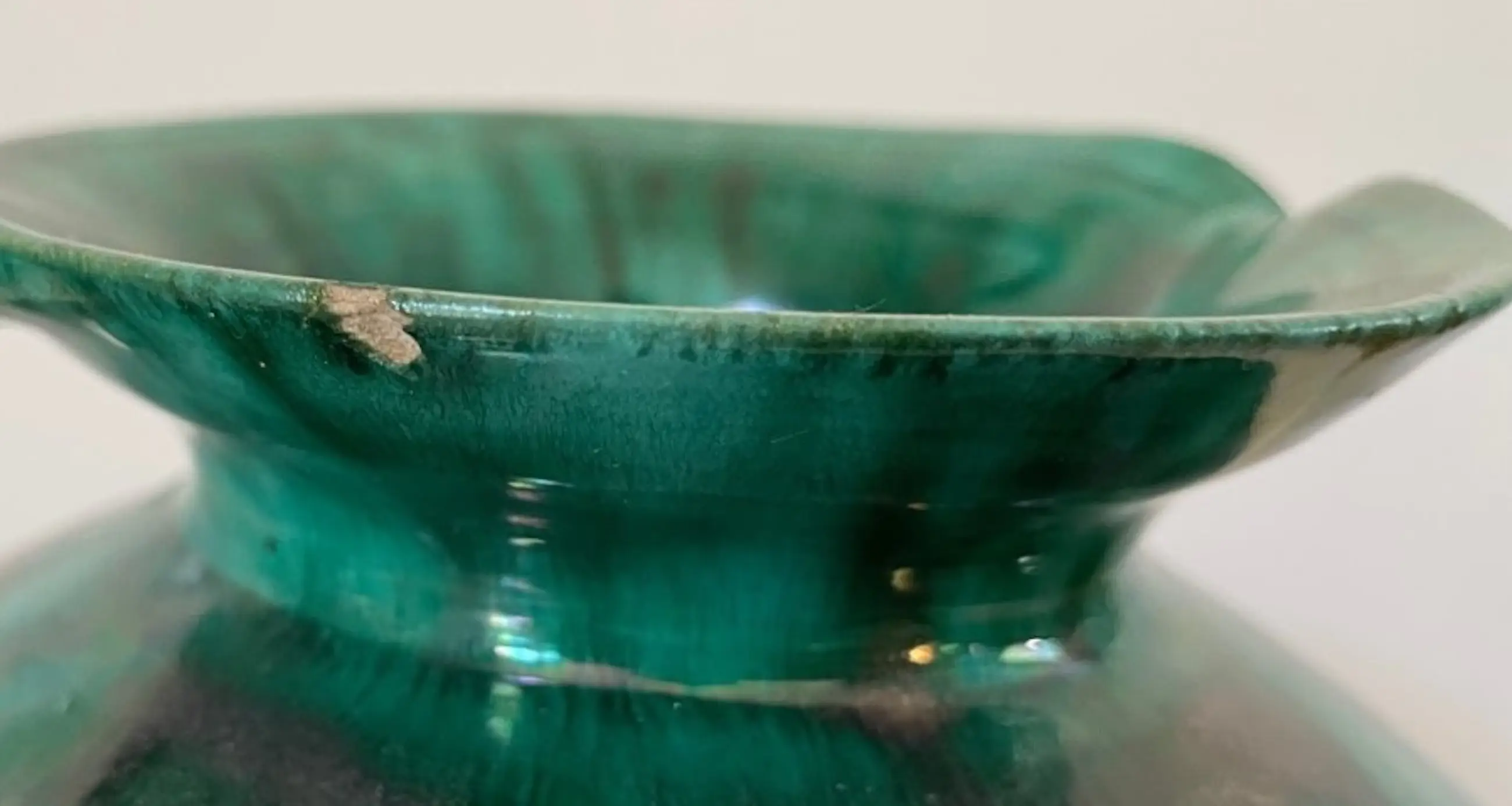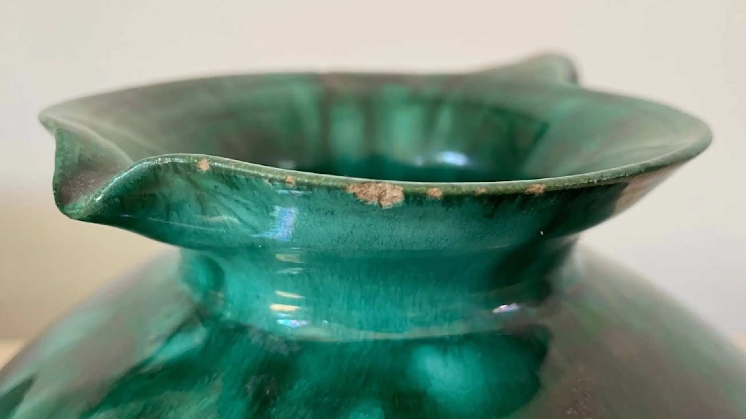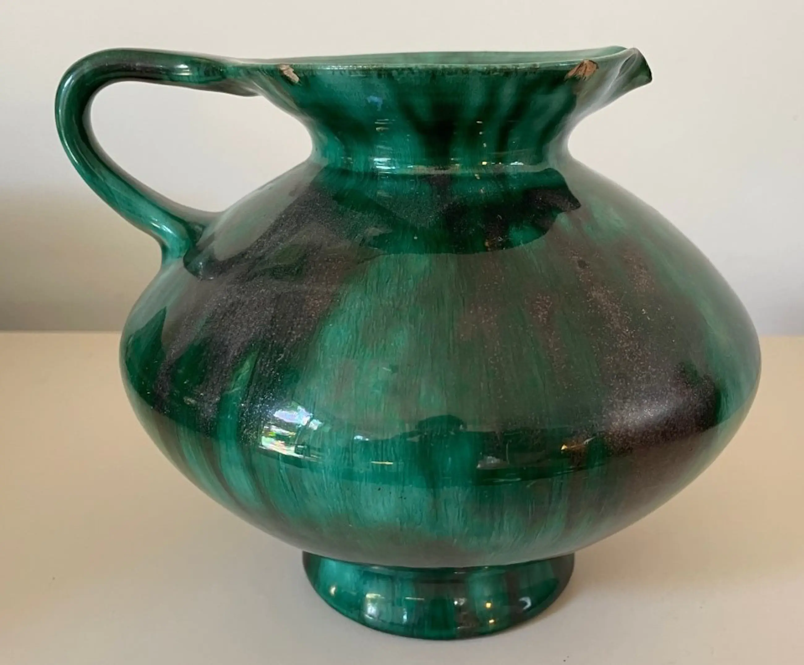 Kamo kan met oor model 252 uitgevoerd in groen zwart stroomglazuur (a la Eskaf). De kan heeft aan de bovenrand verschillende chipjes. Hand gesigneerd aan de onderzijde.