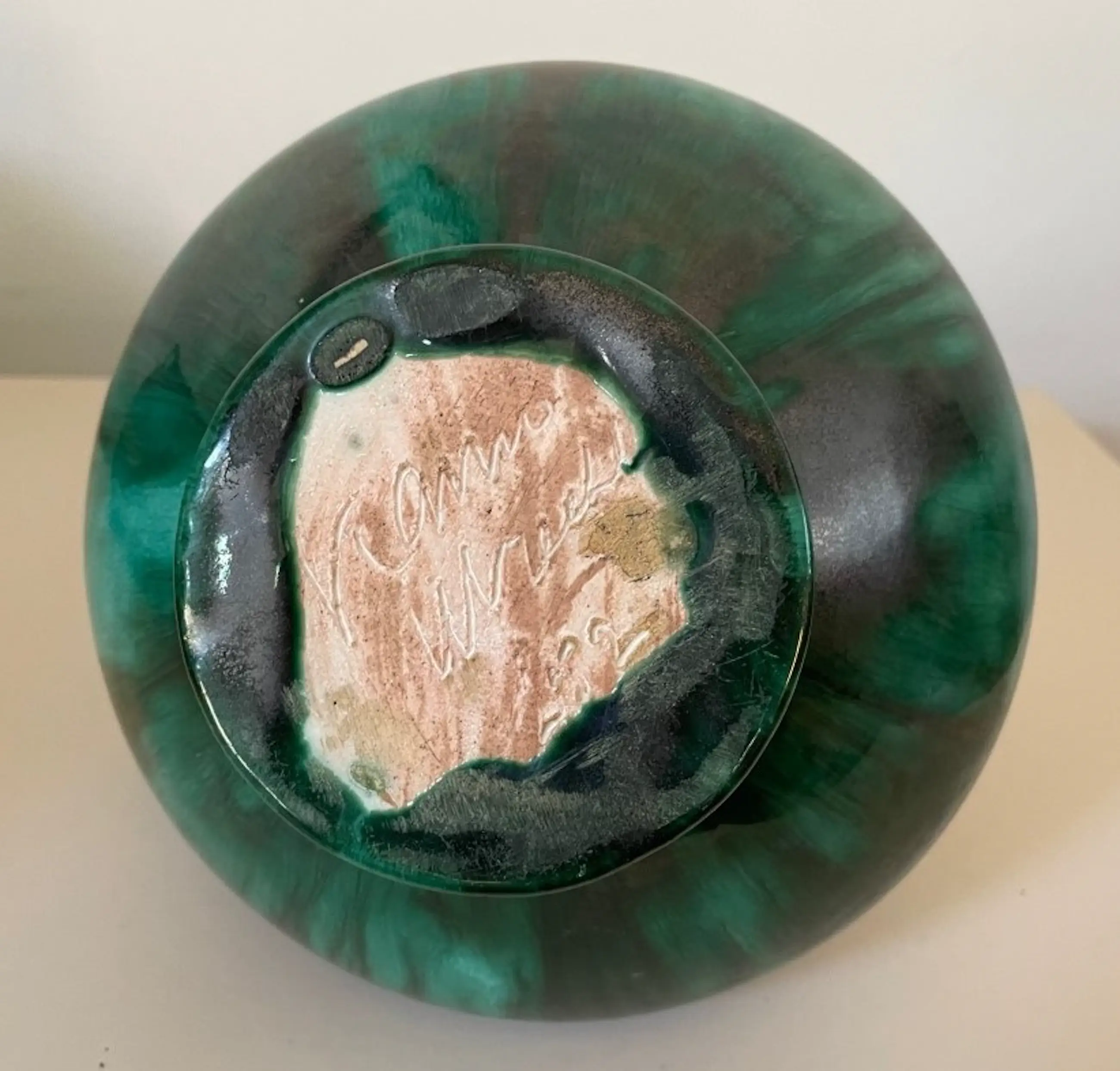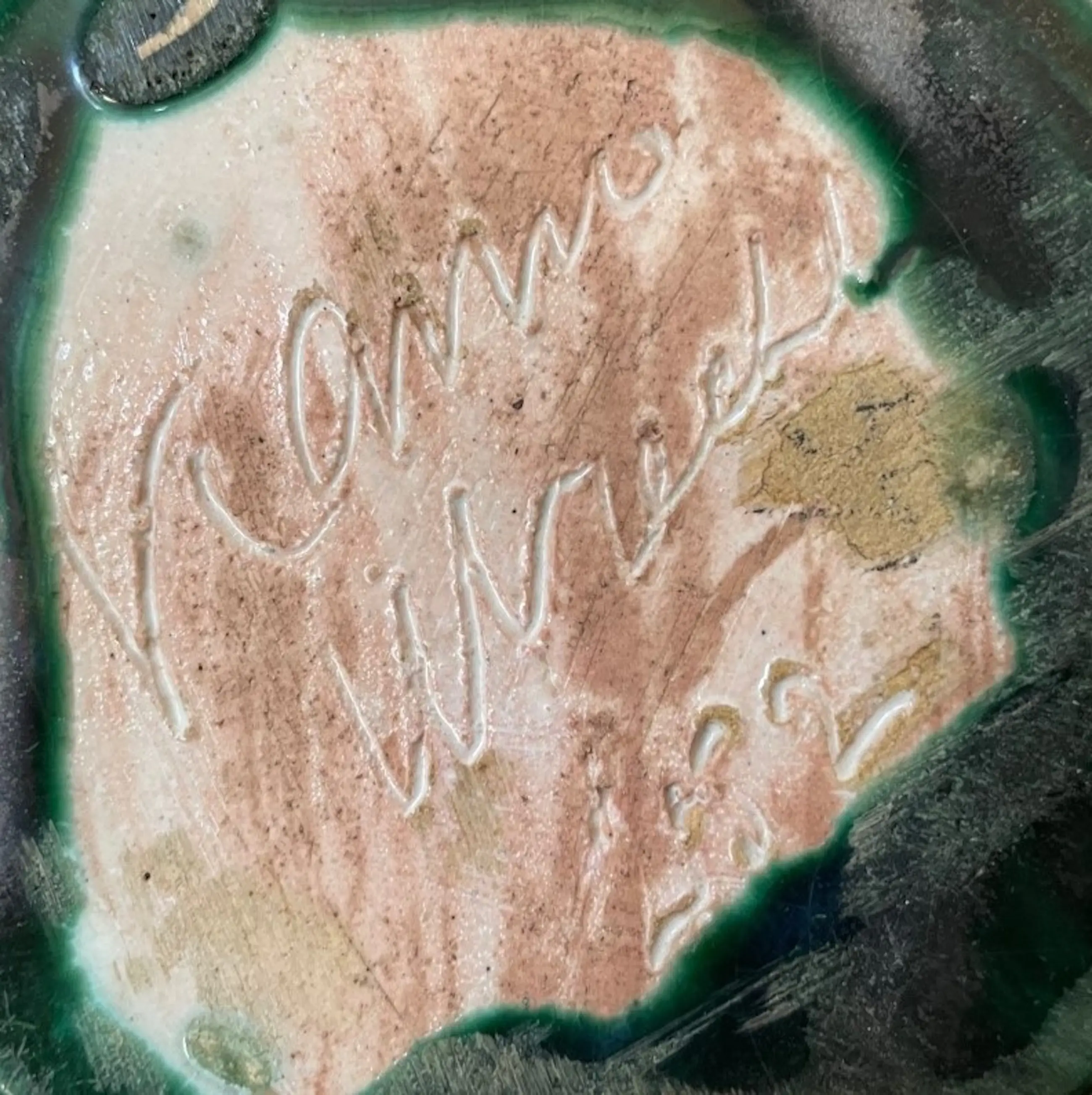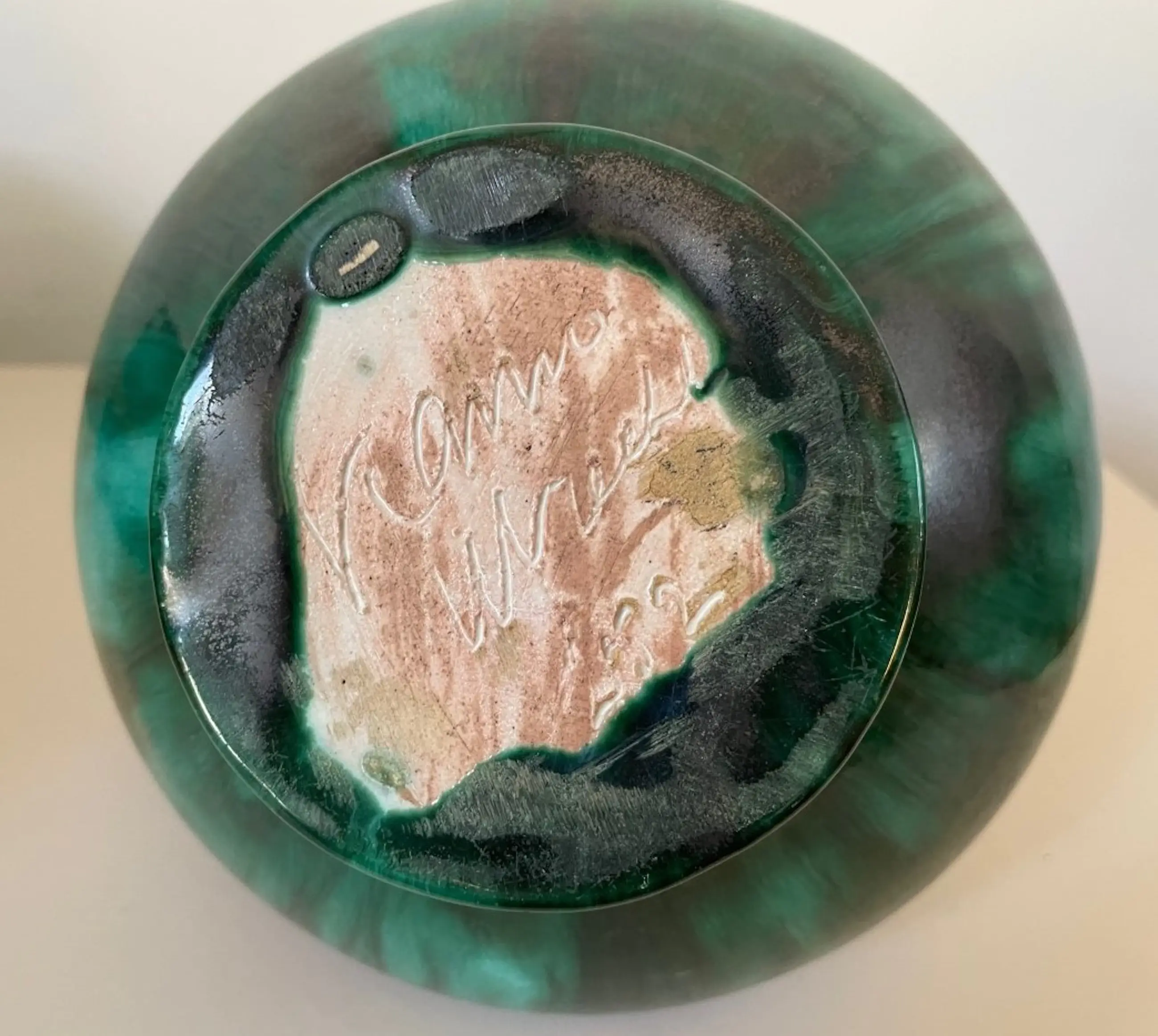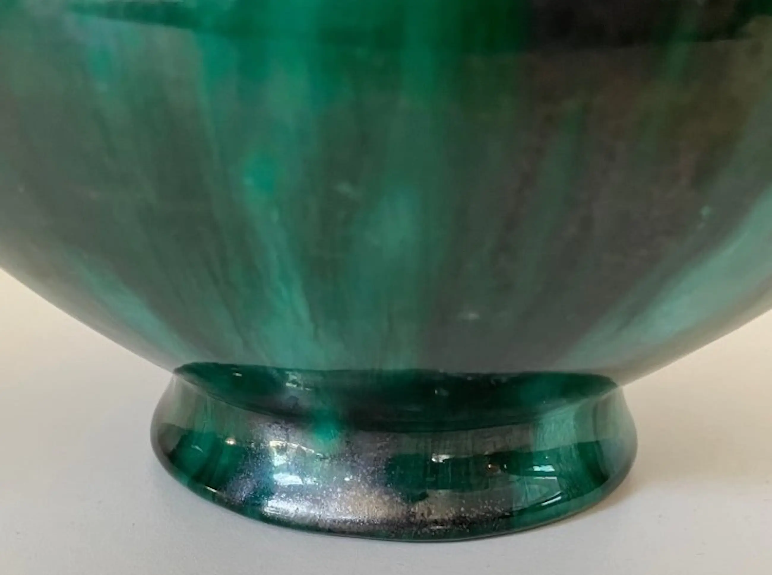 Kamo kan met oor model 252 uitgevoerd in groen zwart stroomglazuur (a la Eskaf). De kan heeft aan de bovenrand verschillende chipjes. Hand gesigneerd aan de onderzijde.