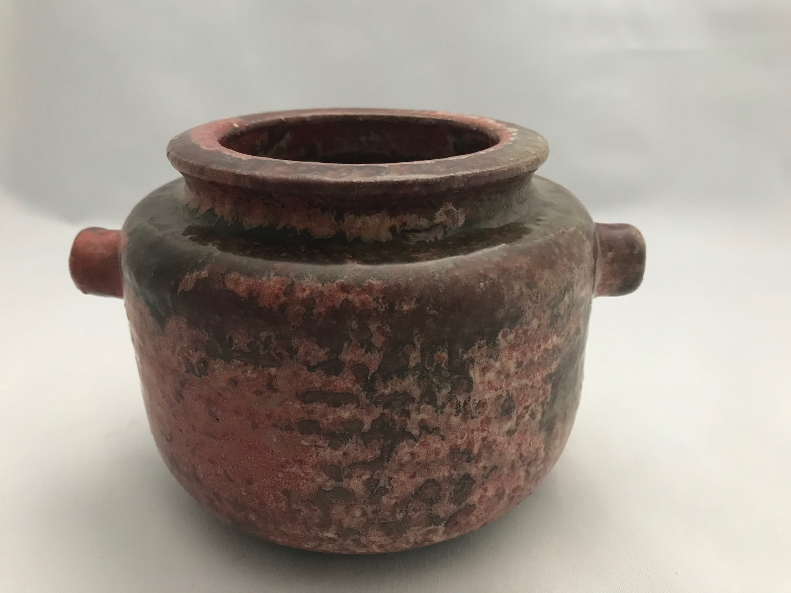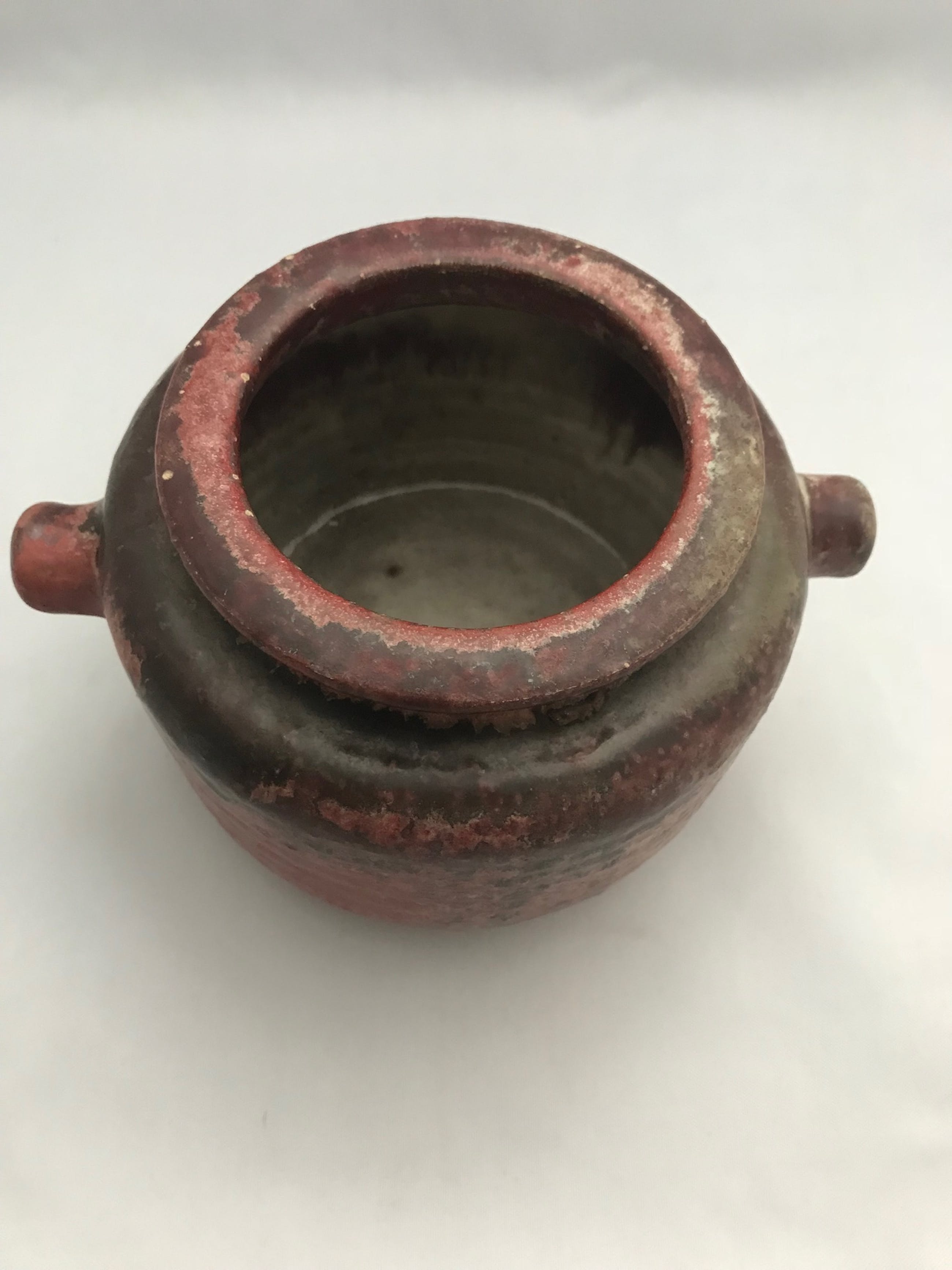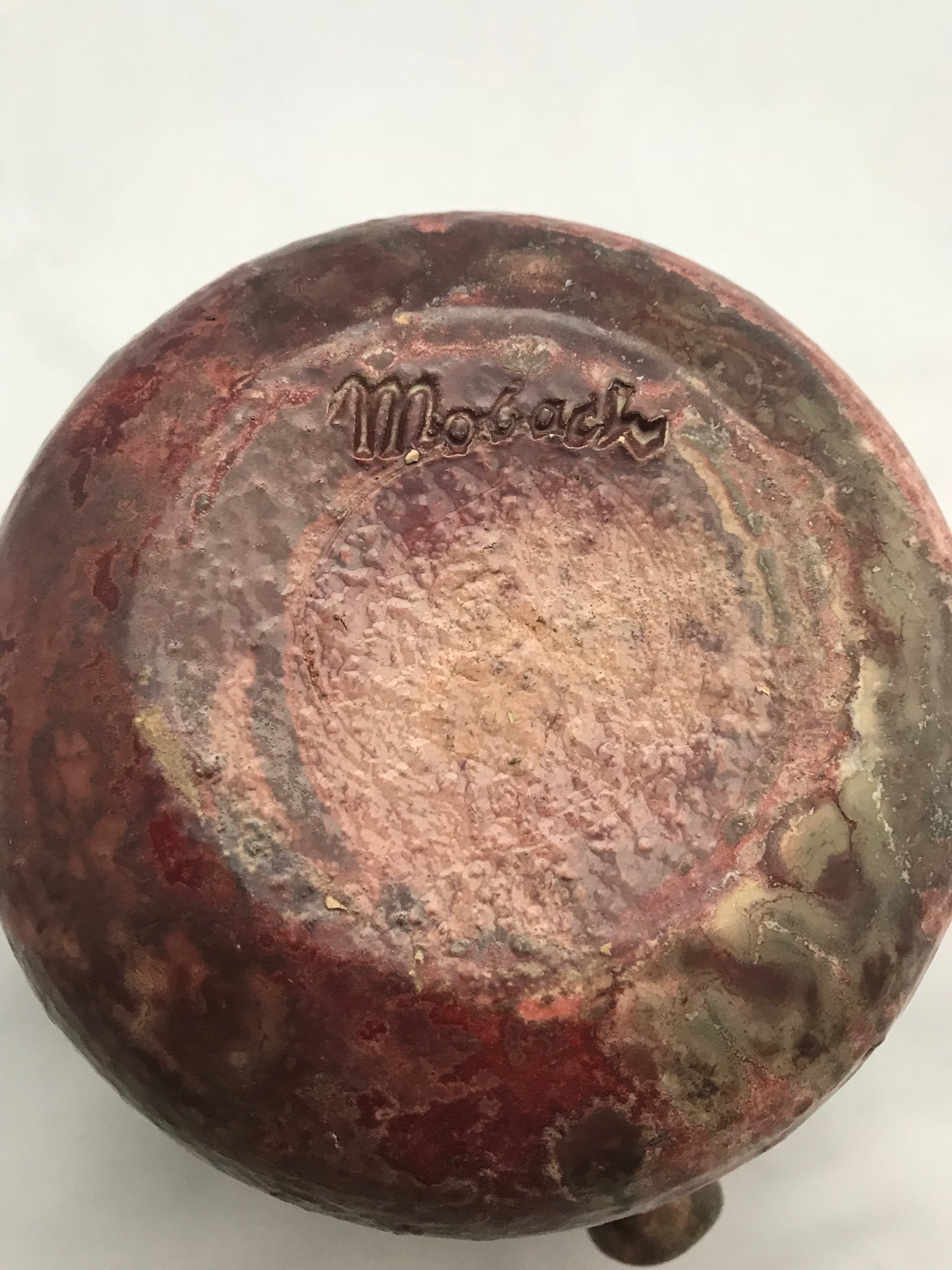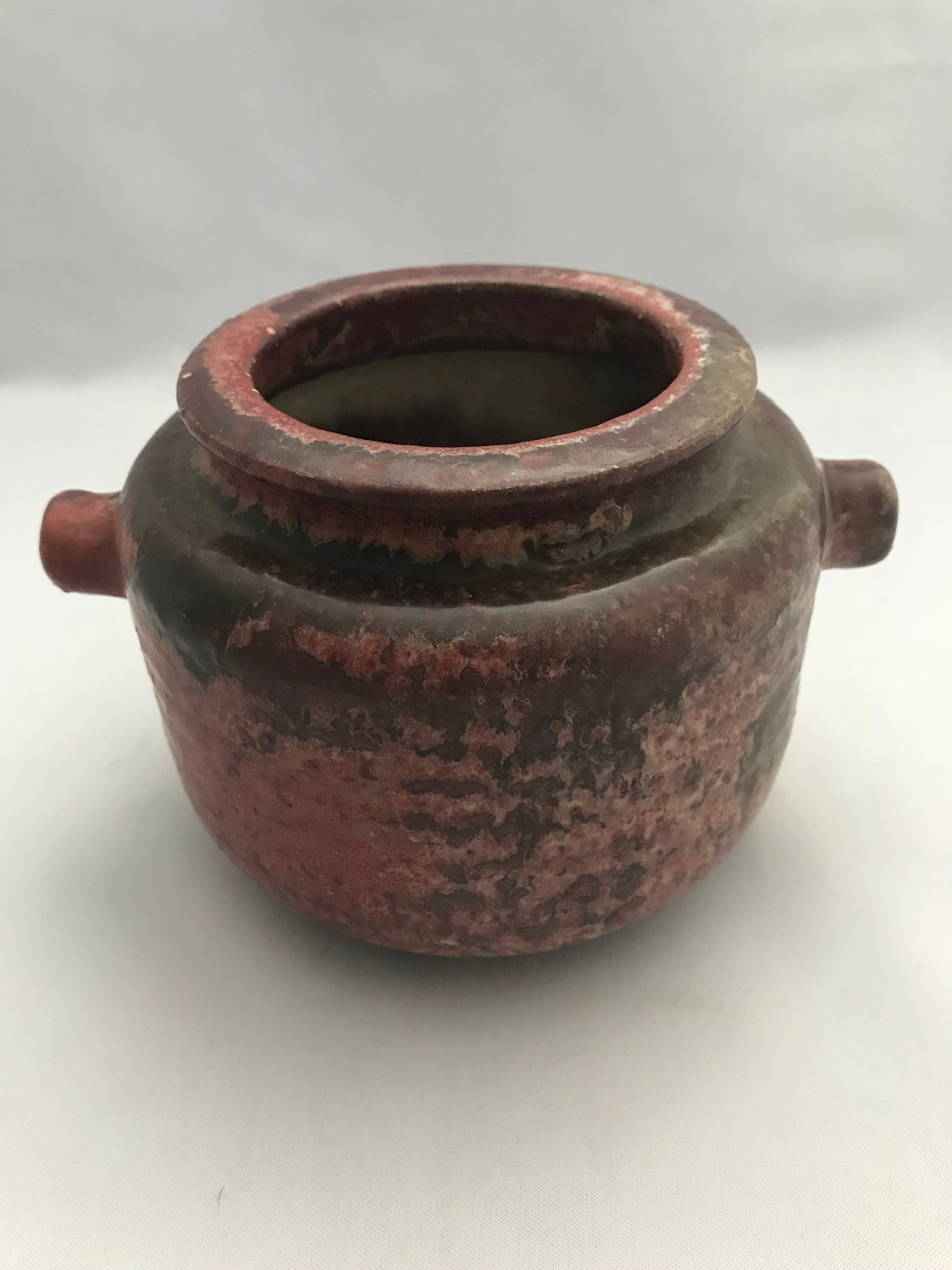 Een Mobach pot in rood glazuur schakering van heel donker rood naar rose. De pot is gemerkt met een mobach stempel.