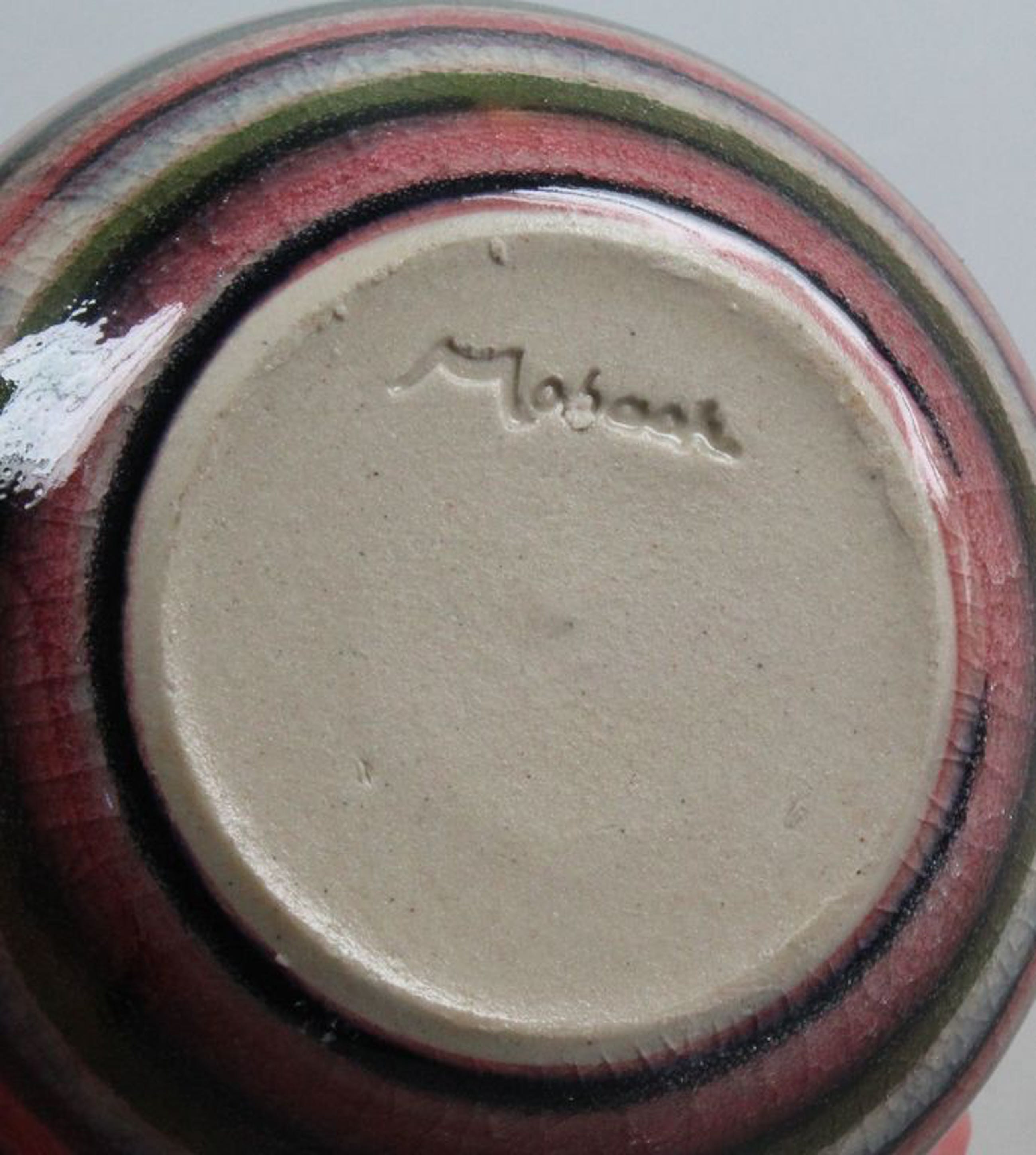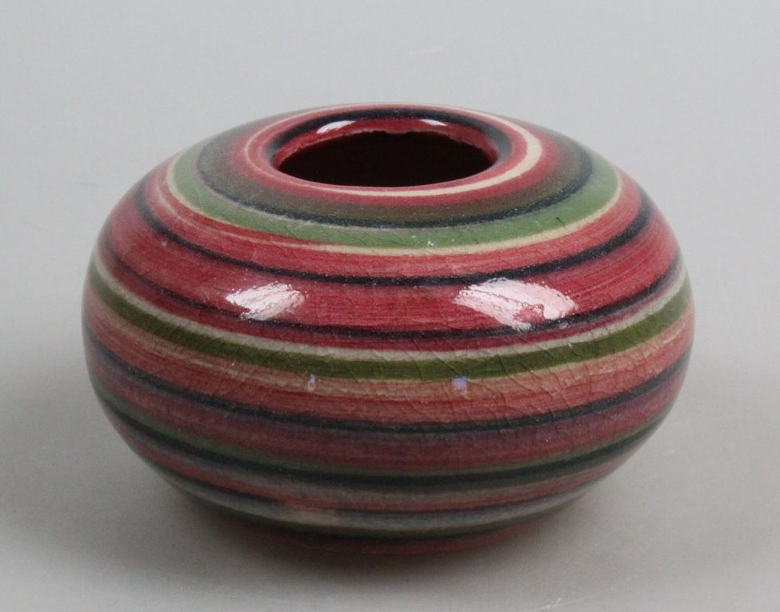 Leuk vaasje met zogenaamd 'regenboog'glazuur. Mobach Utrecht. Hoogte 5 cm en diameter 8 cm. Geheel gaaf en gemerkt.