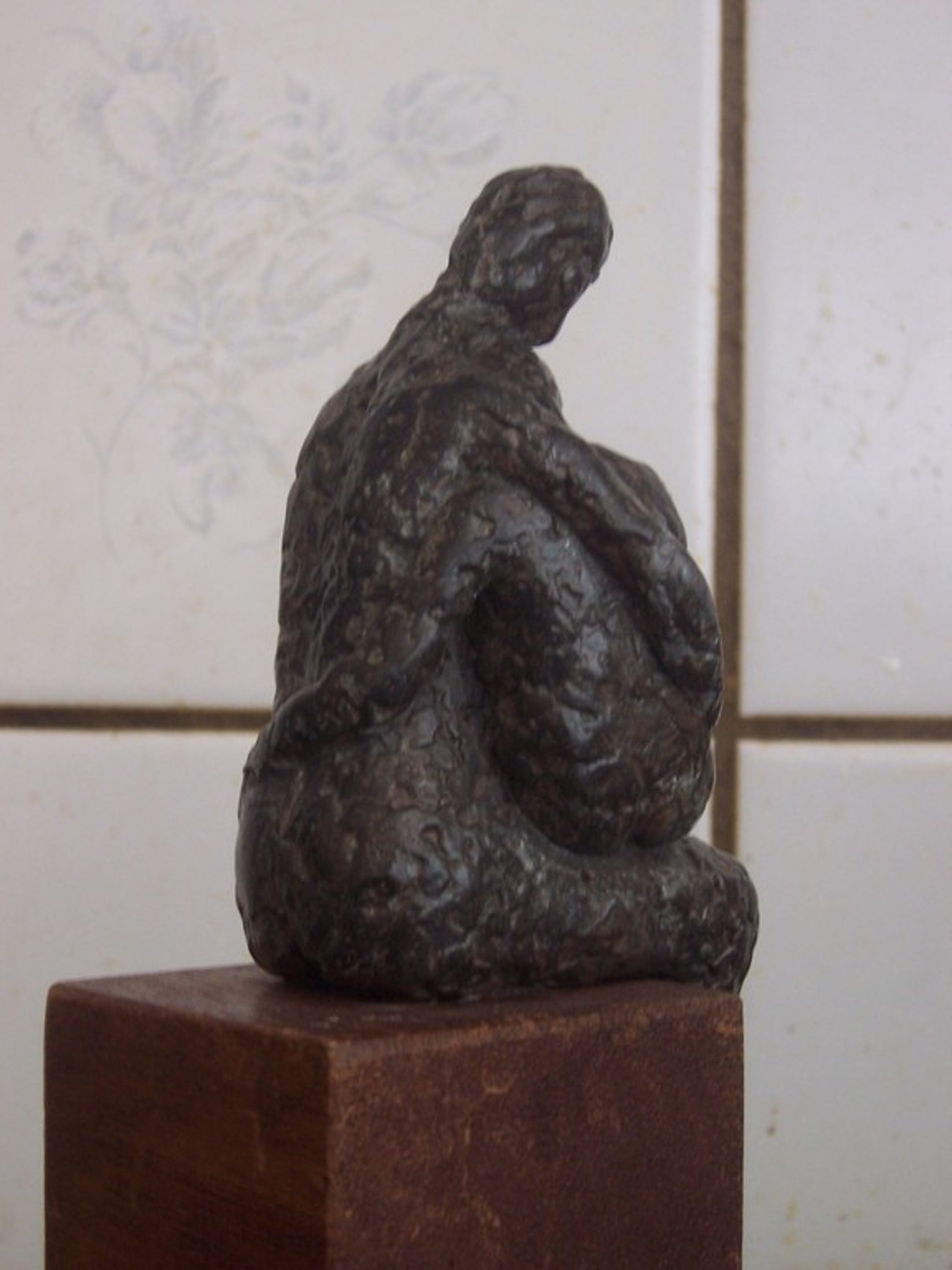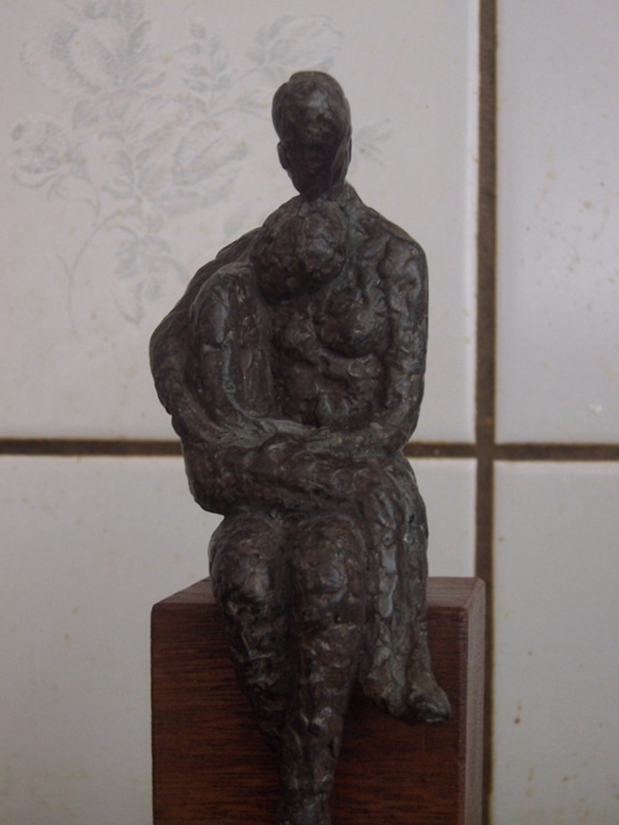 Gevoelig beeldje van moeder met kind op schoot. Gemonteerd op een blok hout. Mooi vormgegeven met ruwe afwerking. Een aanwinst voor iedere collectie! Helaas weet ik niets over de geschiedenis of de leeftijd.