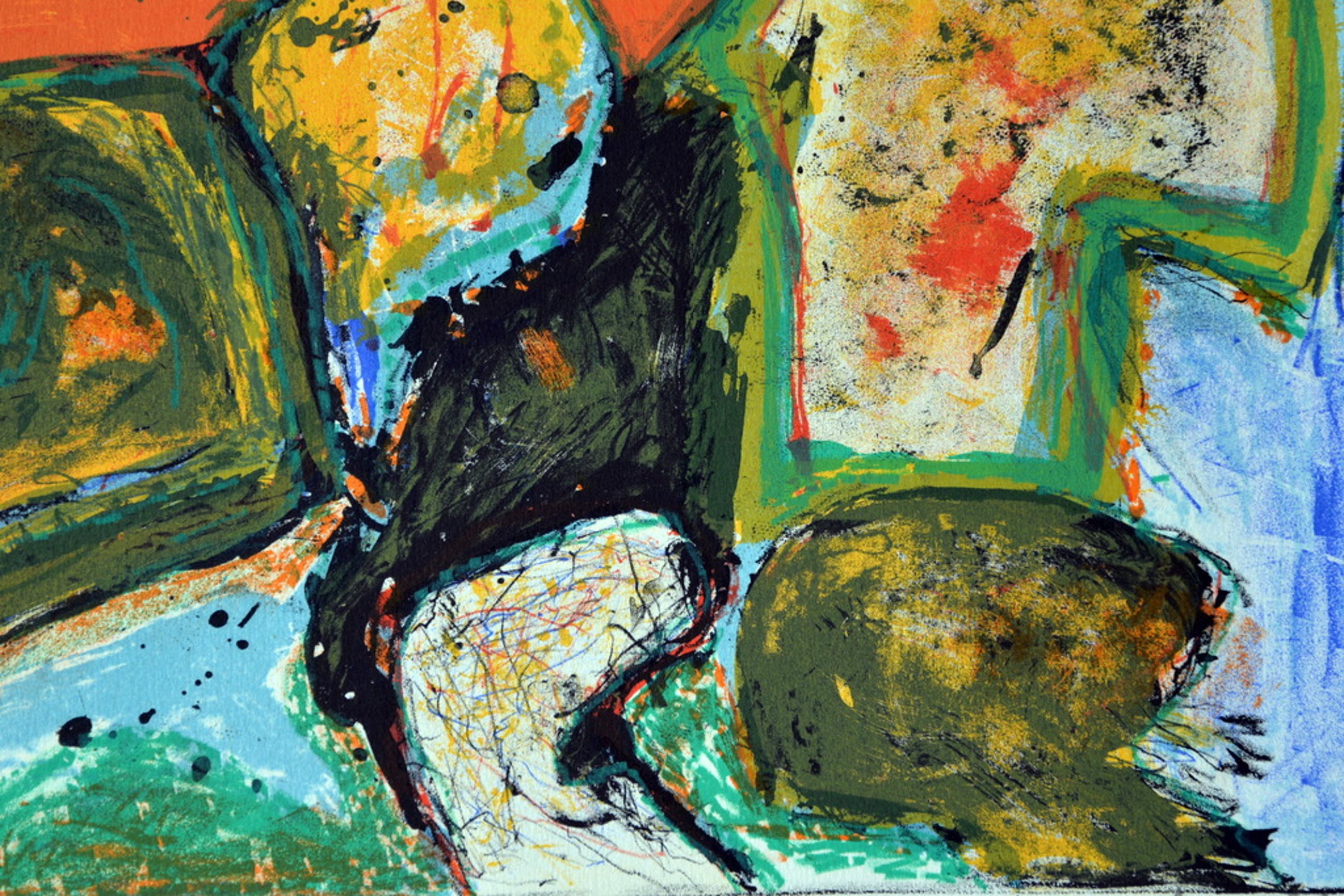 Prachtige kleurenlithografie van de bekende Deense COBRA kunstenaar Mogens Balle. Gemaakt in de typische, eigen stijl van Mogens Balle. Veelkleurige vlakken met een begrenzing van lijnen. Duidelijk te herkennen figuren van dieren en mensen. De oplage bedraagt 150 exemplaren. Dit is nummer 58.