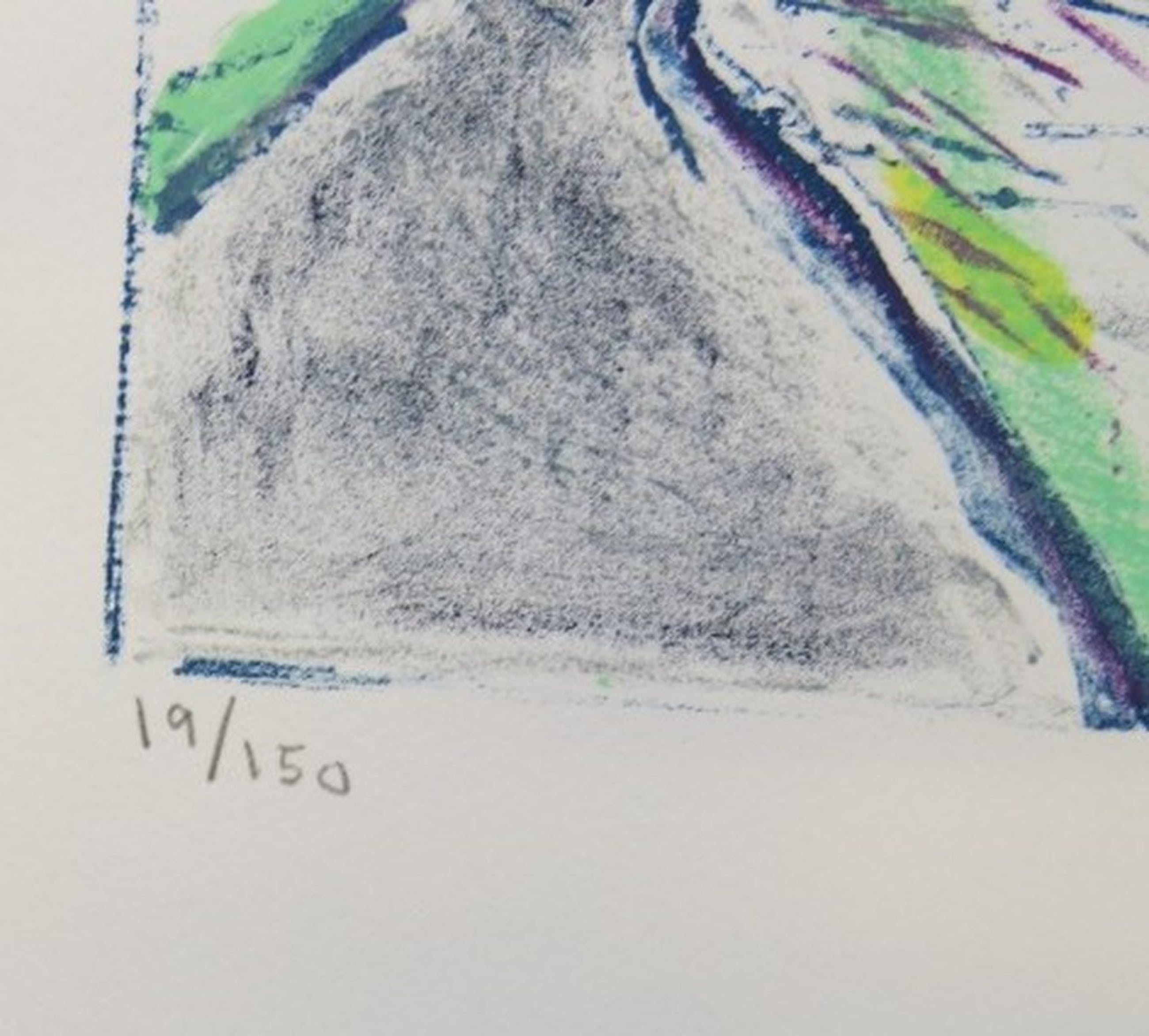Mooie kleurenlitho van de Deense CoBrA kunstenaar Mogens Balle. Zijn composities zijn zeer kleurrijk en vaak ook druk te noemen, een geliefd onderwerp in zijn werk zijn fantasiefiguren. Ook zijn er overeenkomsten te zien met het werk van Asger Jorn, die Mogens Balle zelf kende.