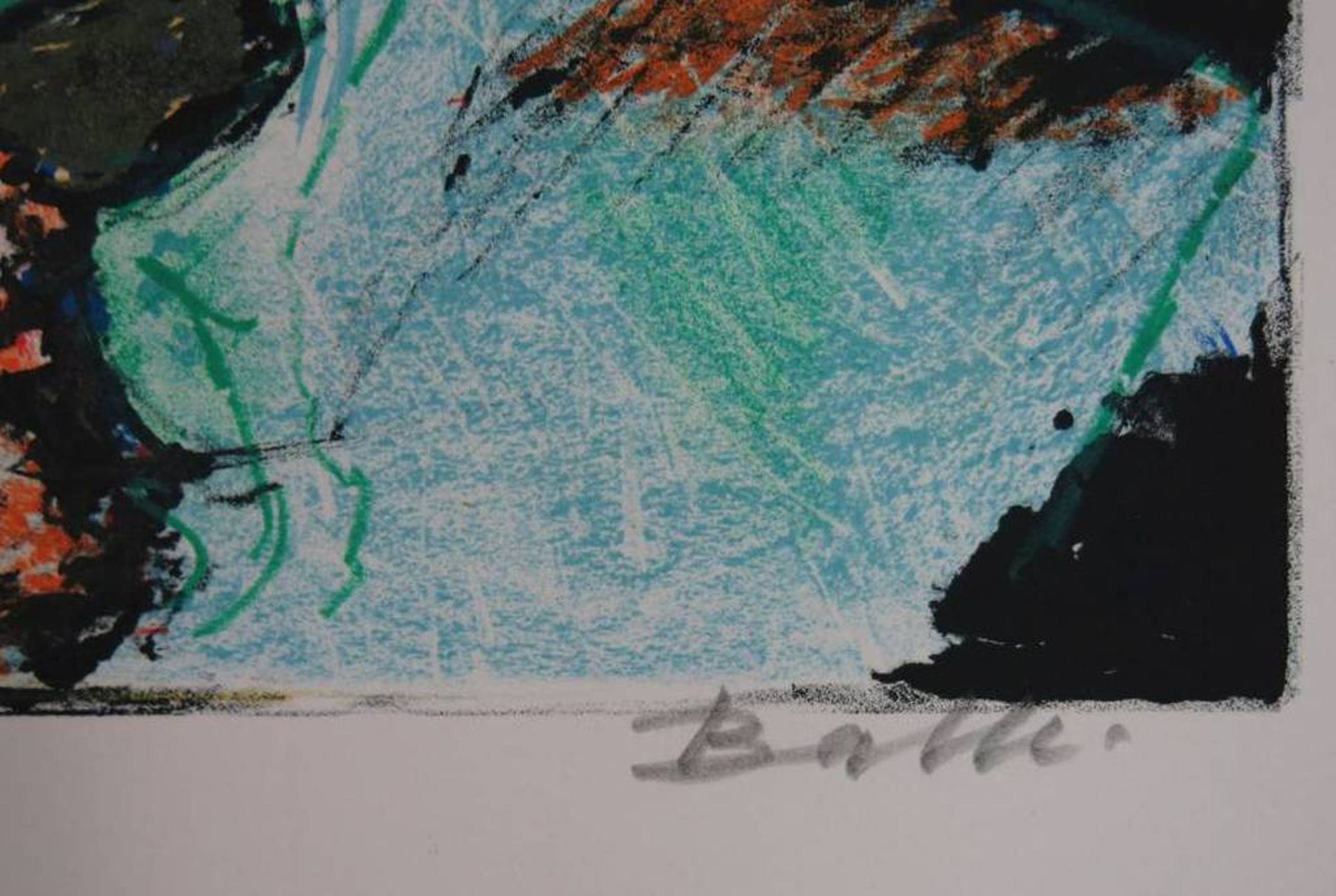 Mooie kleurenlitho van de Deense CoBrA kunstenaar Mogens Balle. Zijn composities zijn zeer kleurrijk en vaak ook druk te noemen, een geliefd onderwerp in zijn werk zijn fantasiefiguren. Ook zijn er overeenkomsten te zien met het werk van Asger Jorn, die Mogens Balle zelf kende.